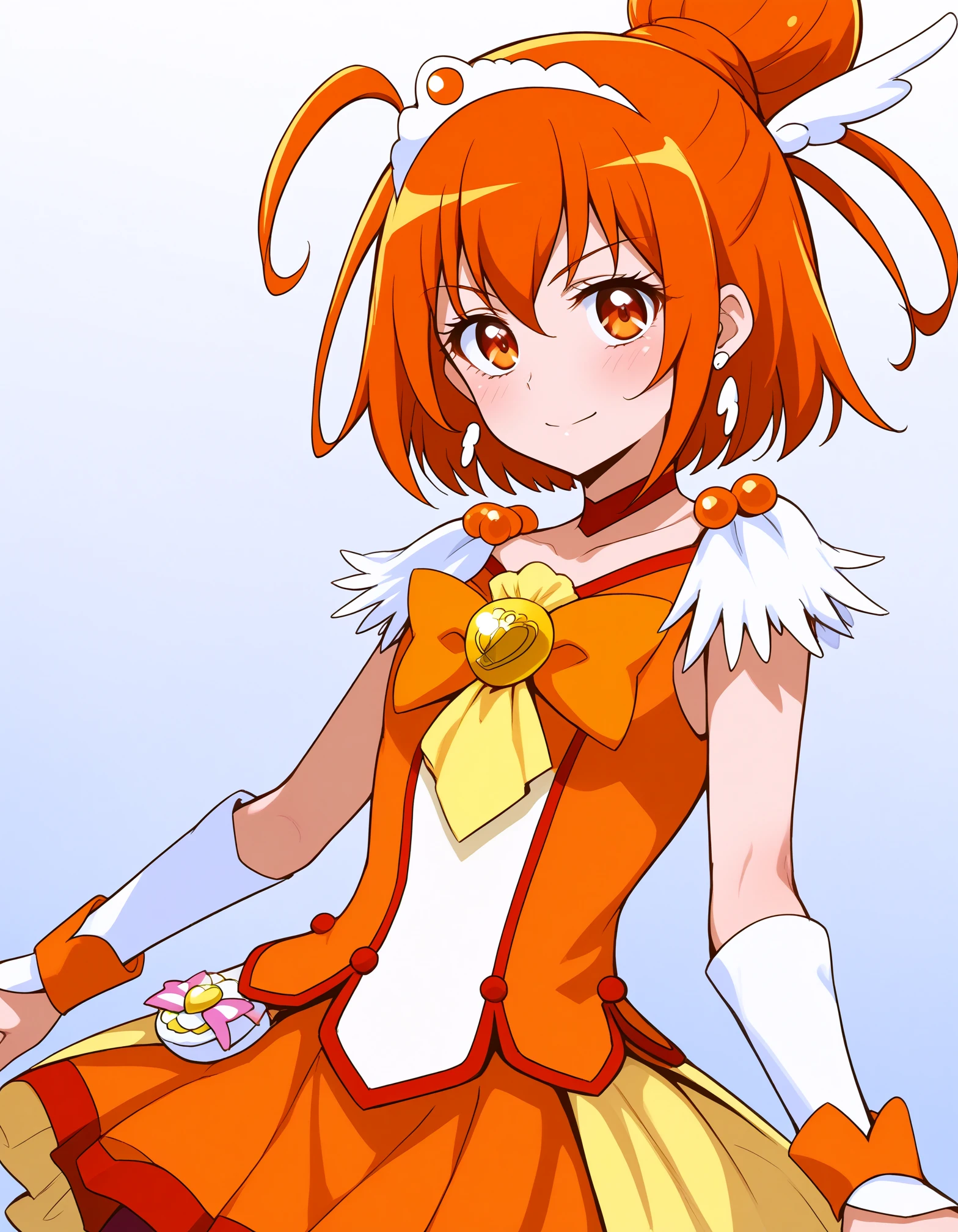 HA-CS, 1girl, orange eyes, single hair bun, hair between eyes, orange hair, hair ornament, wing ornament, tiara, orange choker, antenna hair, feather earrings, orange bow, orange shorts, orange skirt, bike shorts, shorts under skirt, orange wrist cuffs, detached sleeves, thigh boots, zettai ryouiki