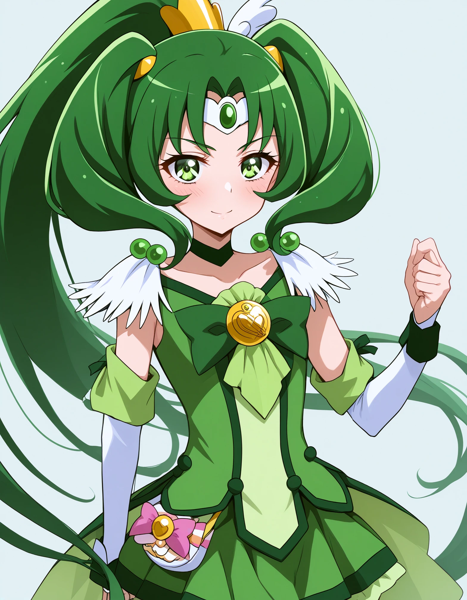 MN-CM, 1girl, green eyes, high ponytail, tri tails, green hair, very long hair, hair ornament, wing ornament, jewerly, circlet, green choker, gold hairclip, green bow, green shorts, green skirt, bike shorts, shorts under skirt, green wrist cuffs, detached sleeves, green ankle white boots, multicolored boots