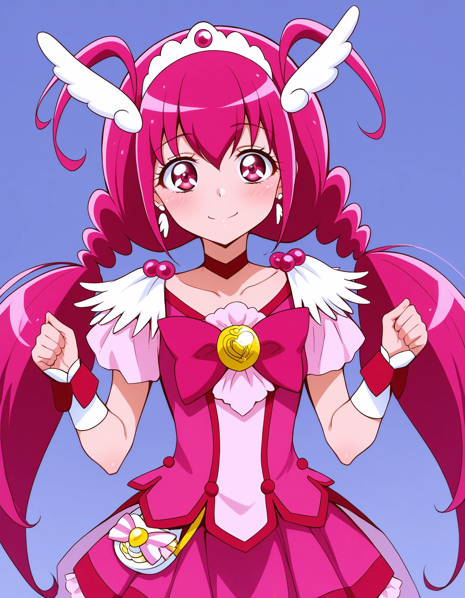 HM-CH, 1girl, pink eyes, low twintails, hair between eyes, pink hair, antenna hair, hair ornament, head wings, tiara, pink choker, feather earrings, pink bow, pink shorts, pink skirt, bike shorts, shorts under skirt, pink wrist cuffs, knee boots
