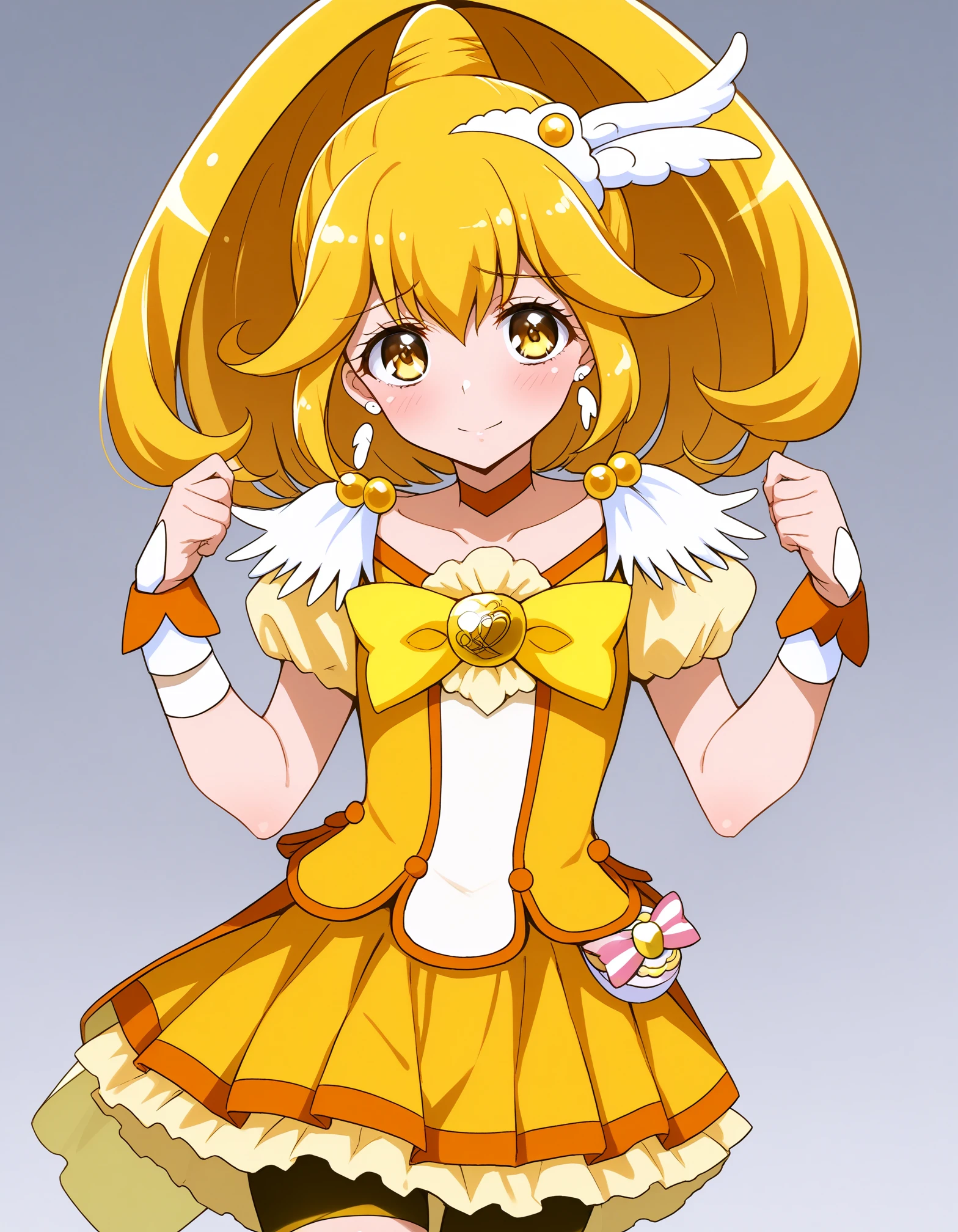 KY-CP, 1girl, yellow eyes, wide ponytail, hair flaps, hair between eyes, yellow hair, hair ornament, wing ornament, tiara, yellow choker, feather earrings, yellow bow, yellow shorts, yellow skirt, bike shorts, shorts under skirt, orange wrist cuffs, knee boots