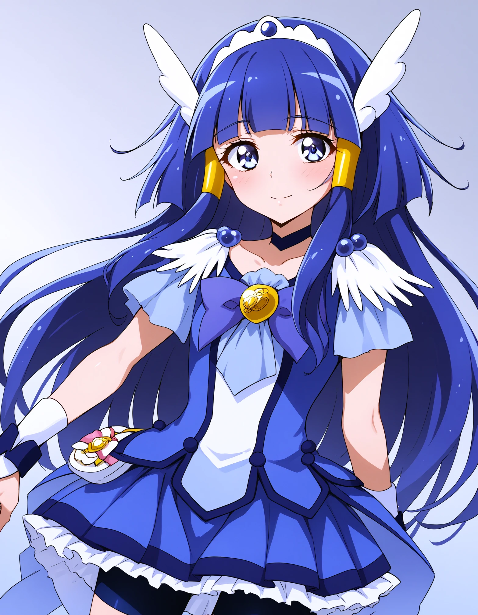 AR-CB, 1girl, blue eyes, long hair, hair tube, sidelocks, blue hair, blunt bangs, hair ornament, head wings, tiara, blue choker, blue bow, blue shorts, blue skirt, bike shorts, shorts under skirt, blue wrist cuffs, knee boots