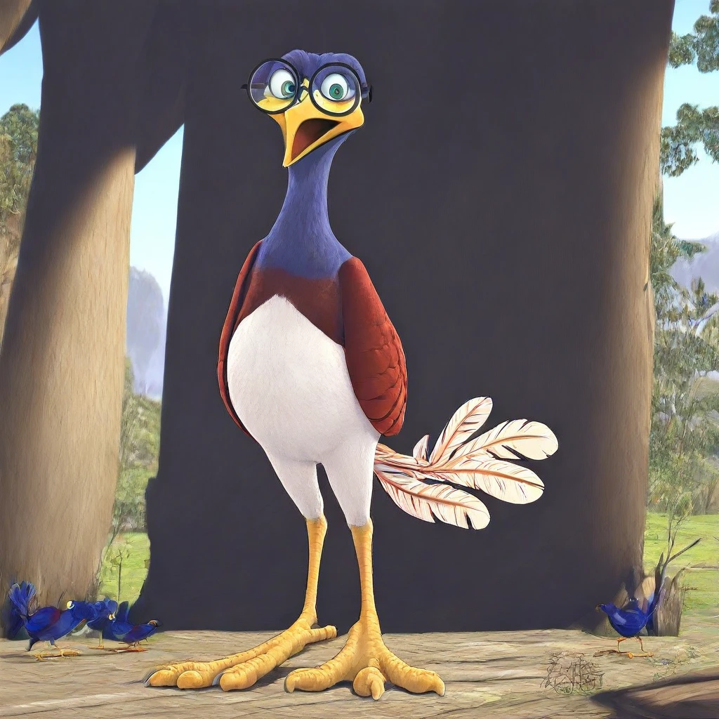1boy, bird, animal, blue feathers, red wings, white belly, bird tail, yellow beak, bird feet, 3 toes, yellow feet, green eyes, glasses, round glasses