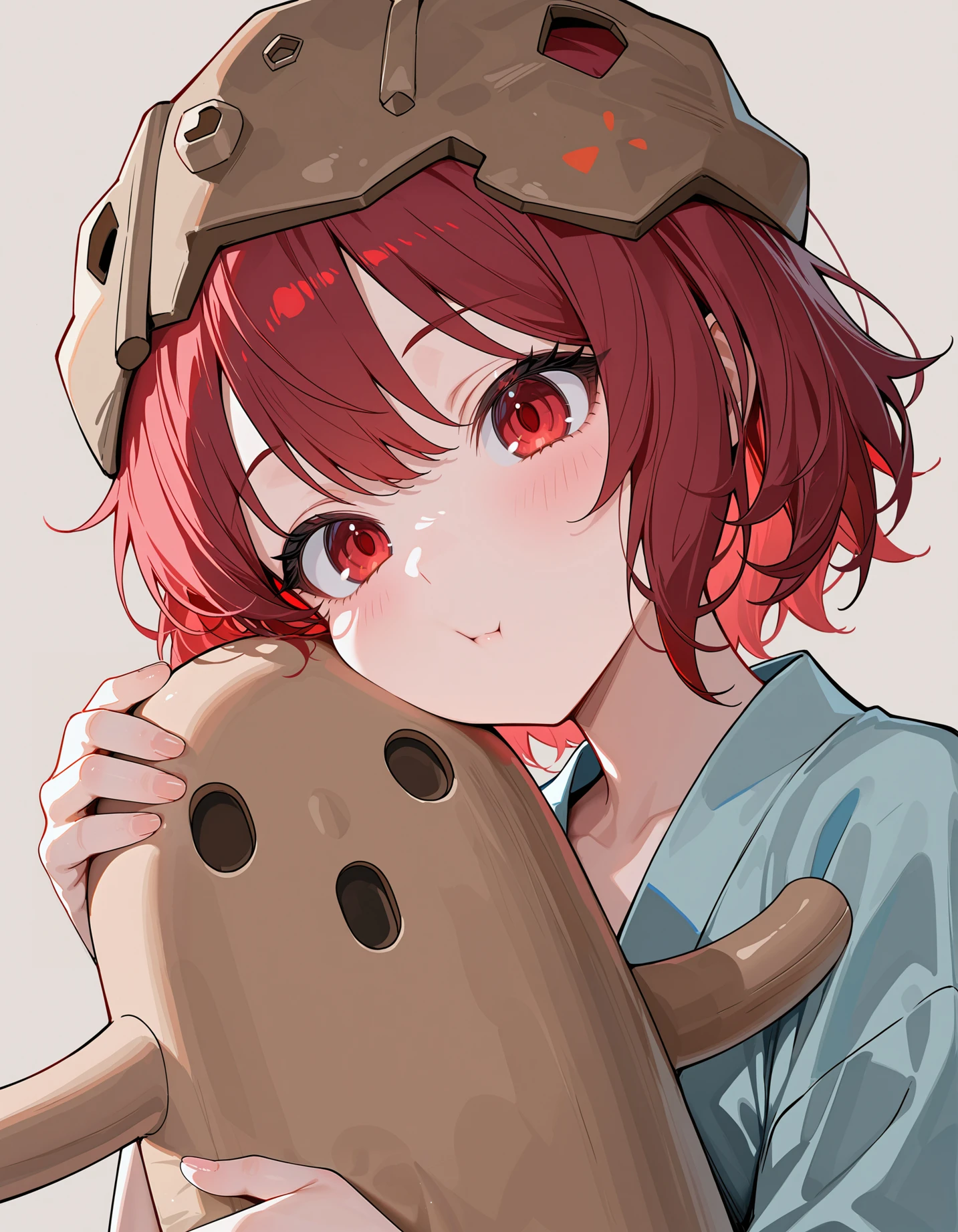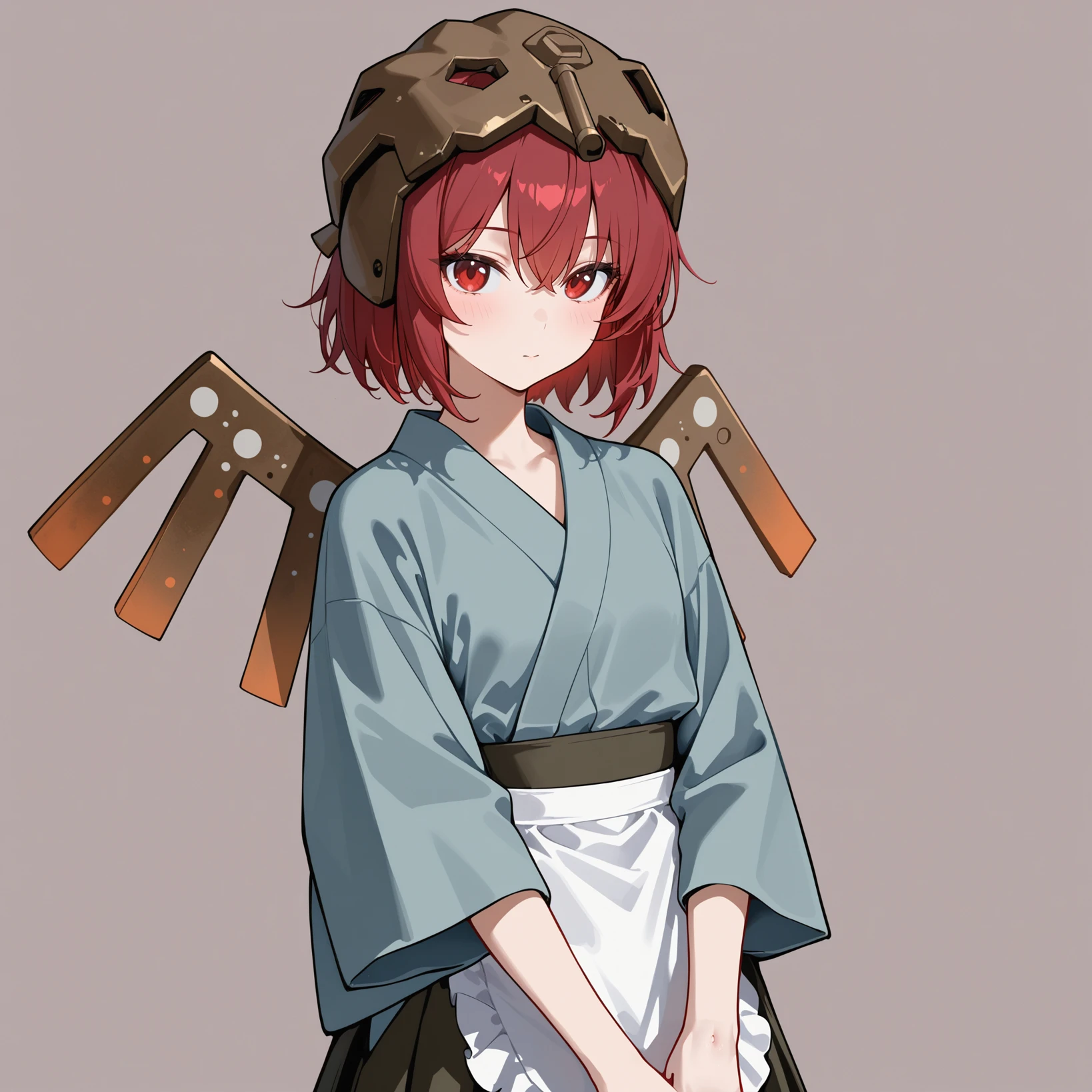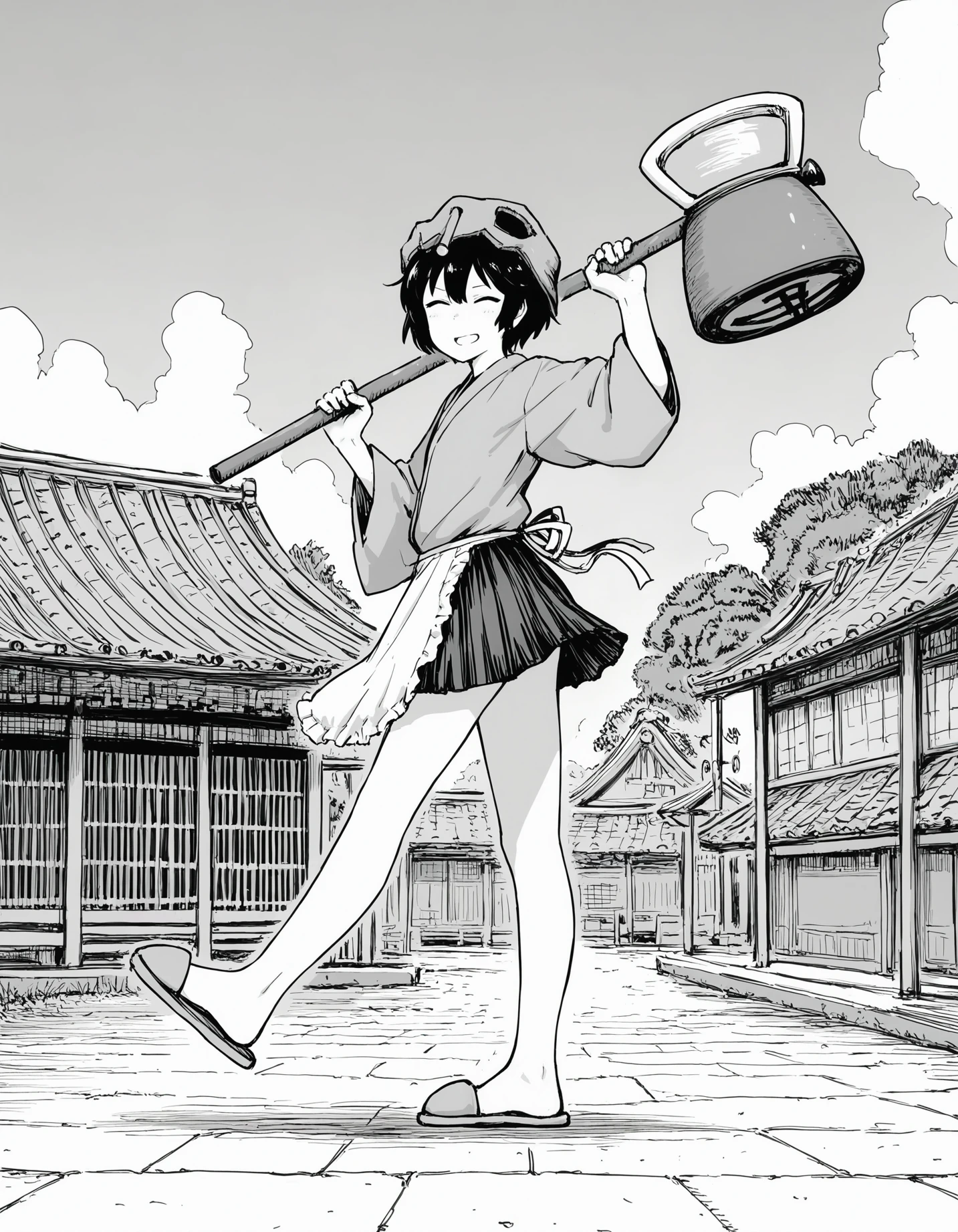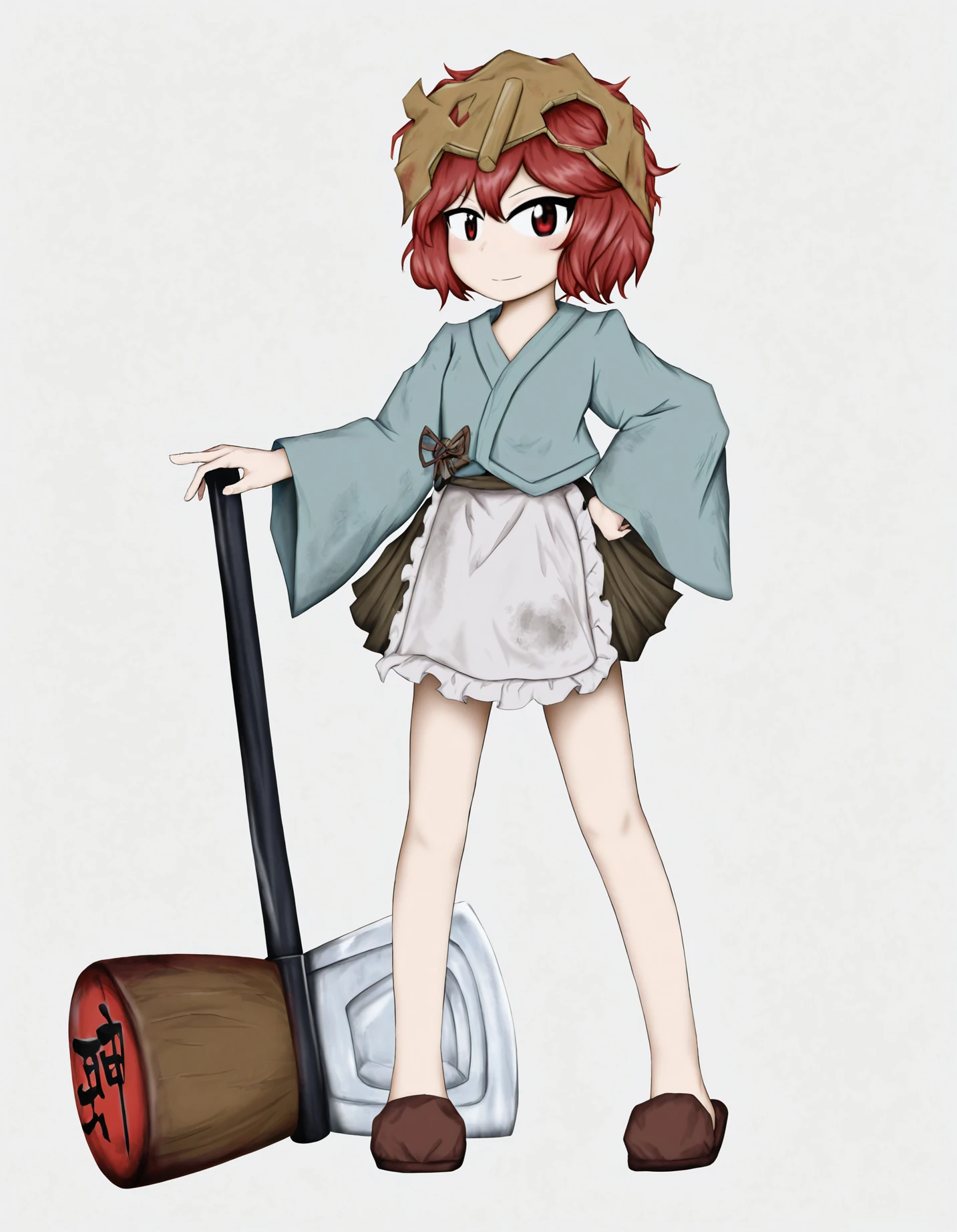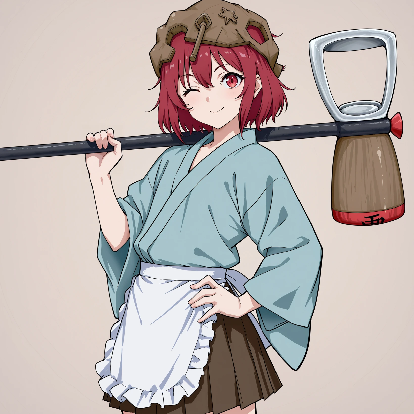 helmet, brown headwear, blue kimono, waist apron, brown skirt, hold hammer, hakama short skirt, slippers