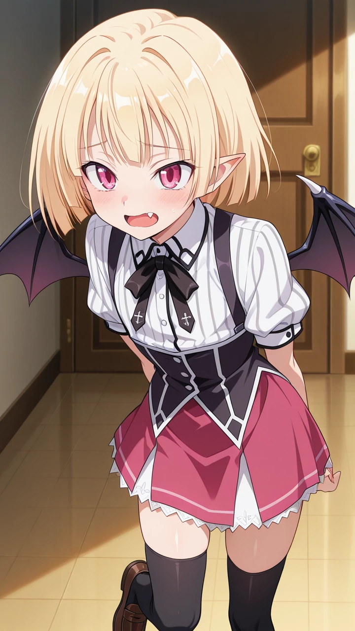 gasper vladi, otoko no ko, blonde hair, pointy ears, red eyes, pink eyes, short hair, blunt bangs, fang, Kuoh Academy school outfit :