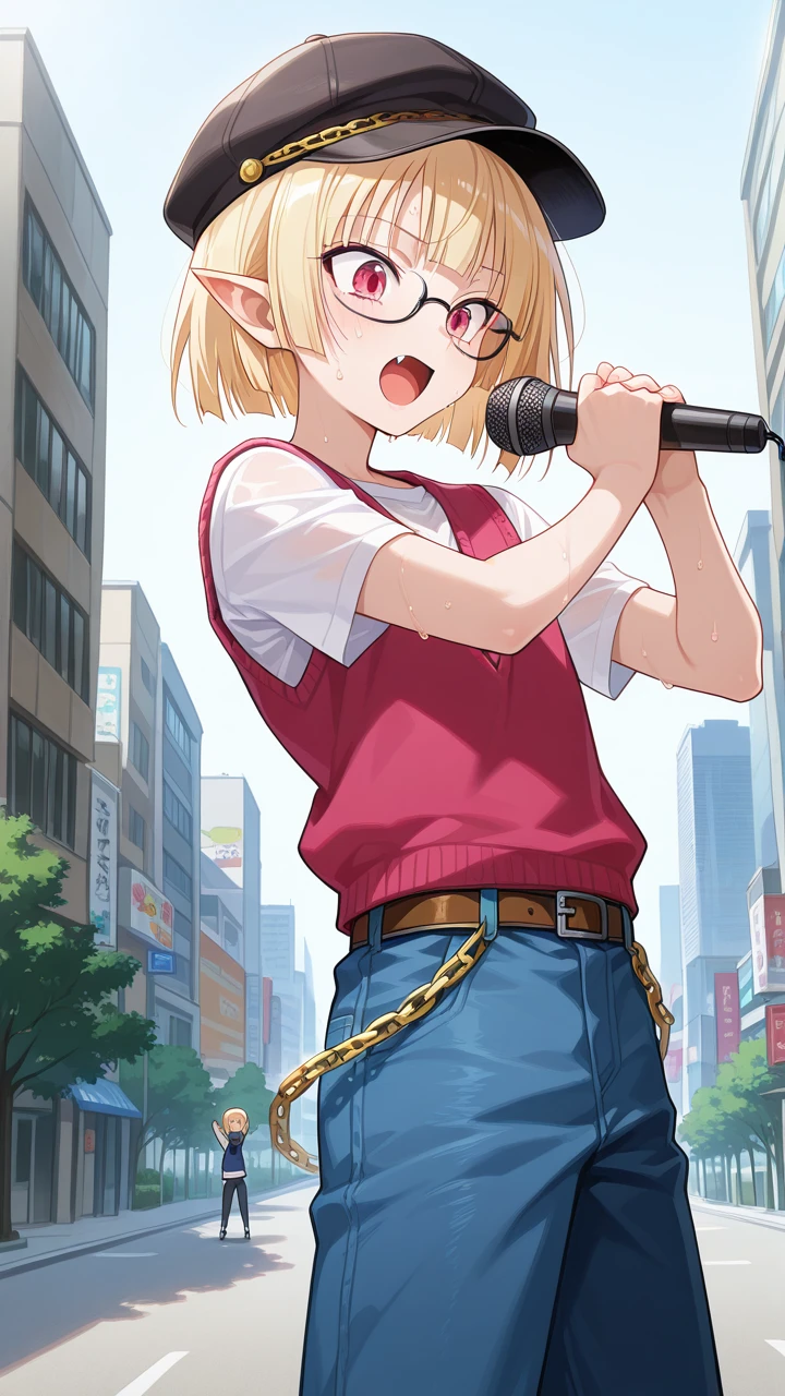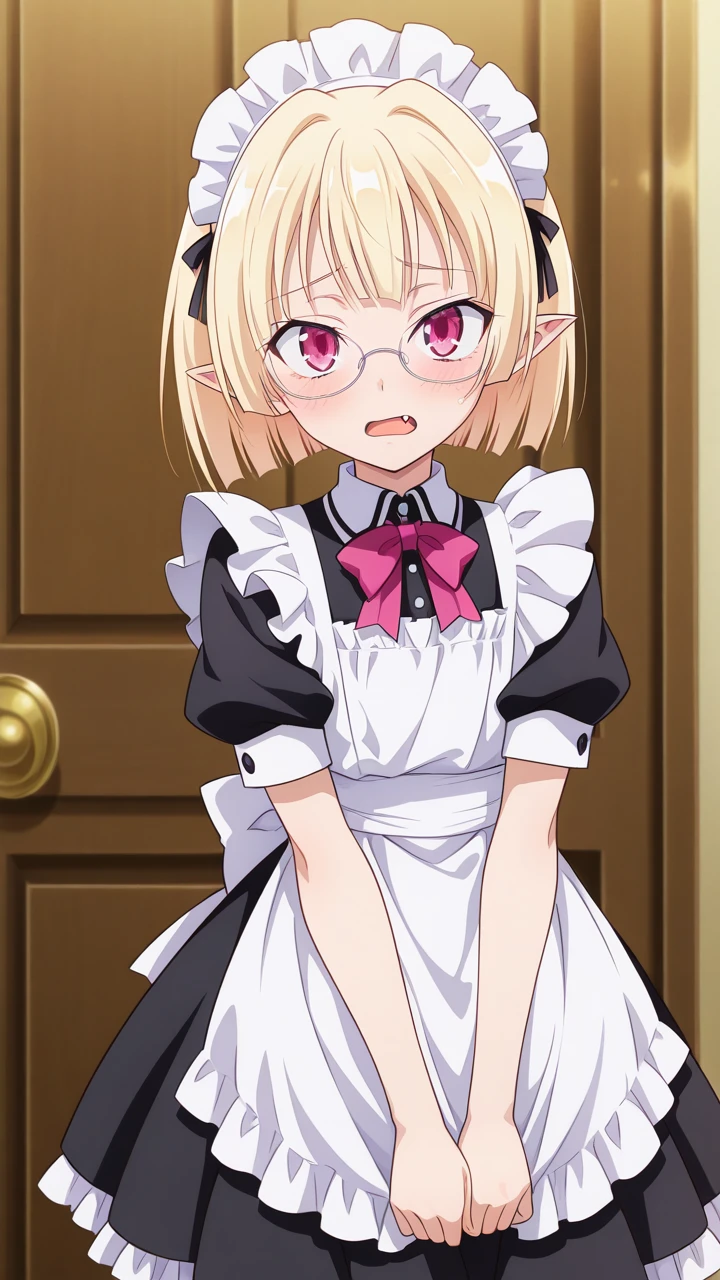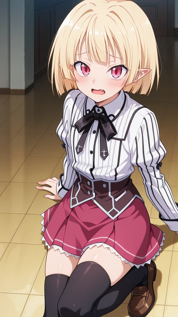 gasper vladi, otoko no ko, blonde hair, pointy ears, red eyes, pink eyes, short hair, blunt bangs, fang,