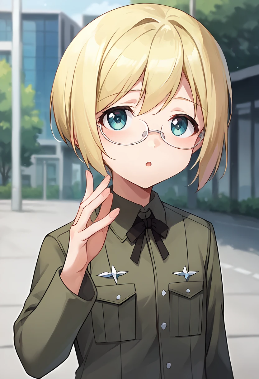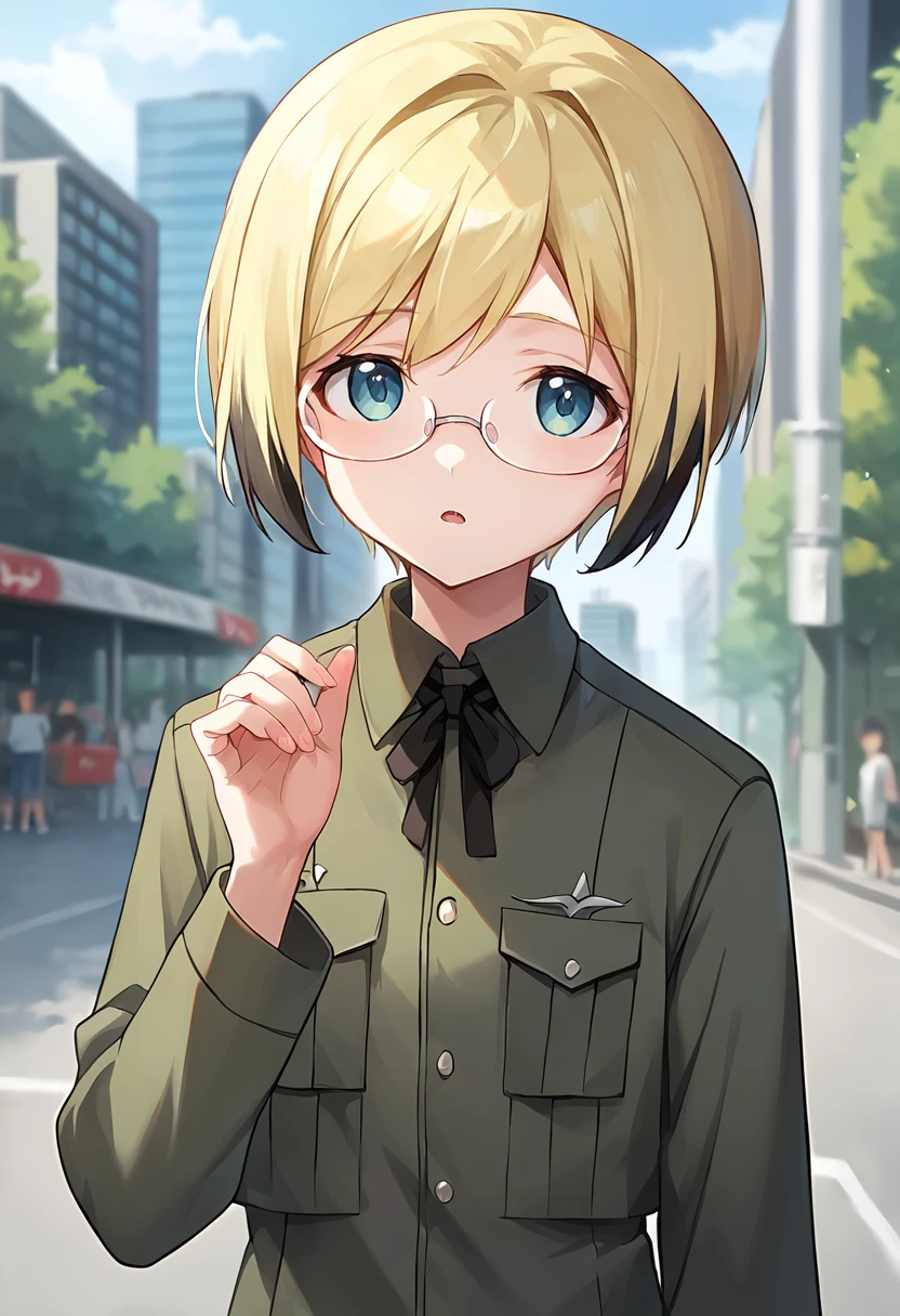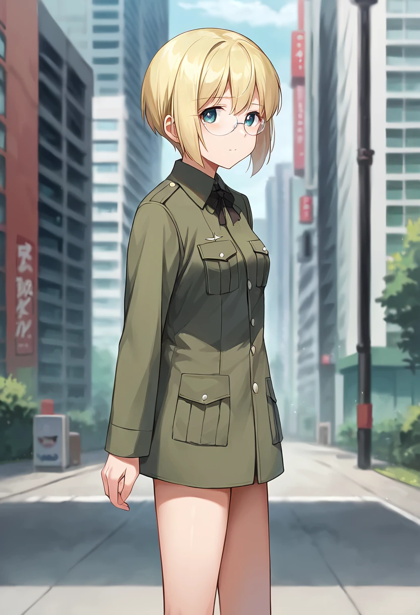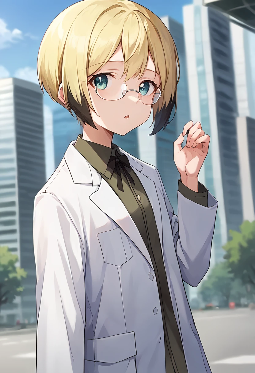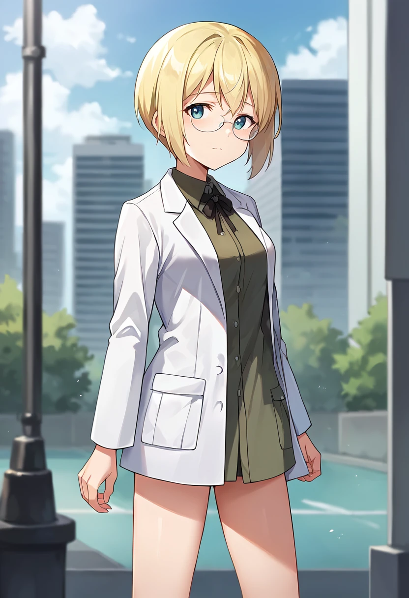score_9, score_8_up, score_7_up, source_anime, masterpiece, 1girl, ct_ursula, blonde hair, short hair, rimless eyewear, green uniform, labcoat, black ribbon, long sleeves, looking at viewer, outdoors, depth of field city, no pants, legs,Negative prompt ❌: