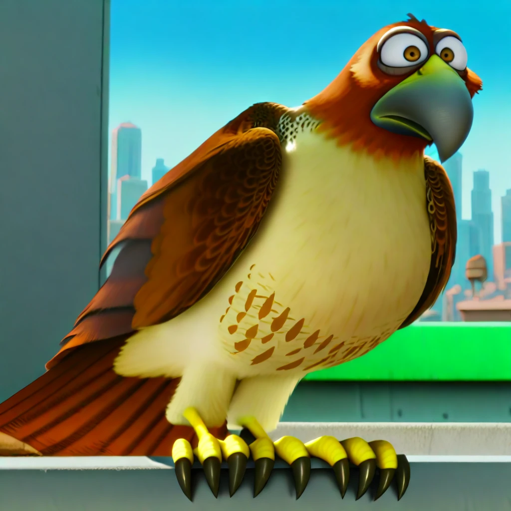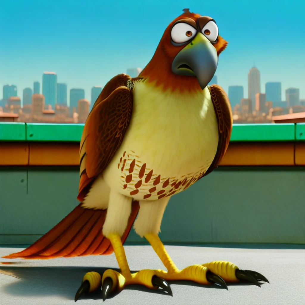Tiberius, Avian, Red-tailed hawk, dark Brown feathers, beige stomach, brown stripes on stomach, Brown Eyes, Yellow beak, Yellow feet with claws