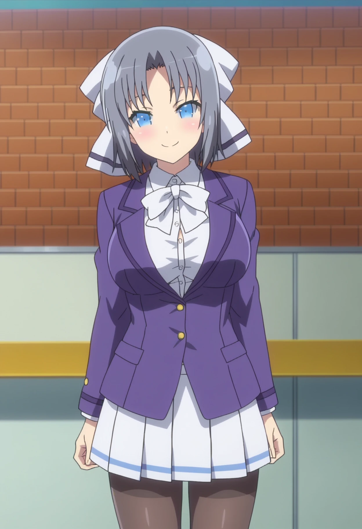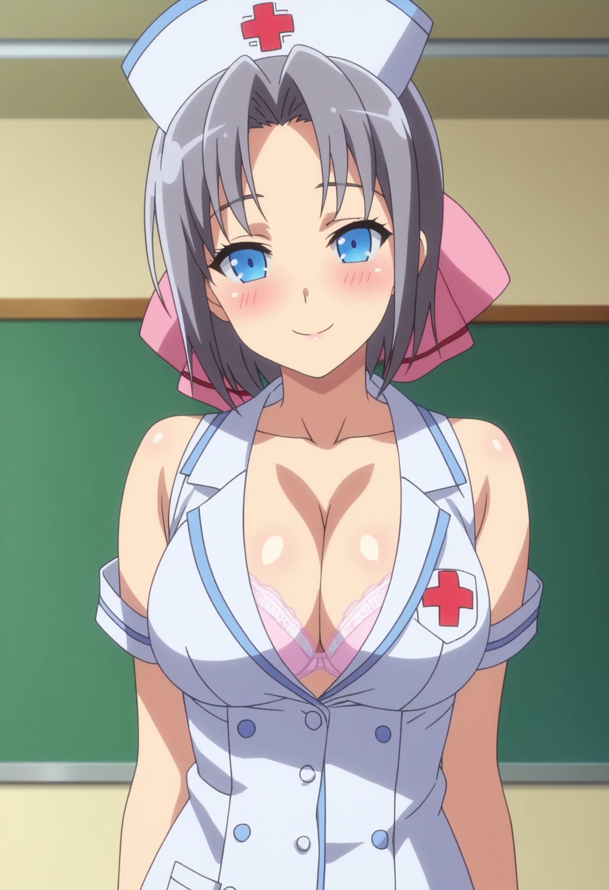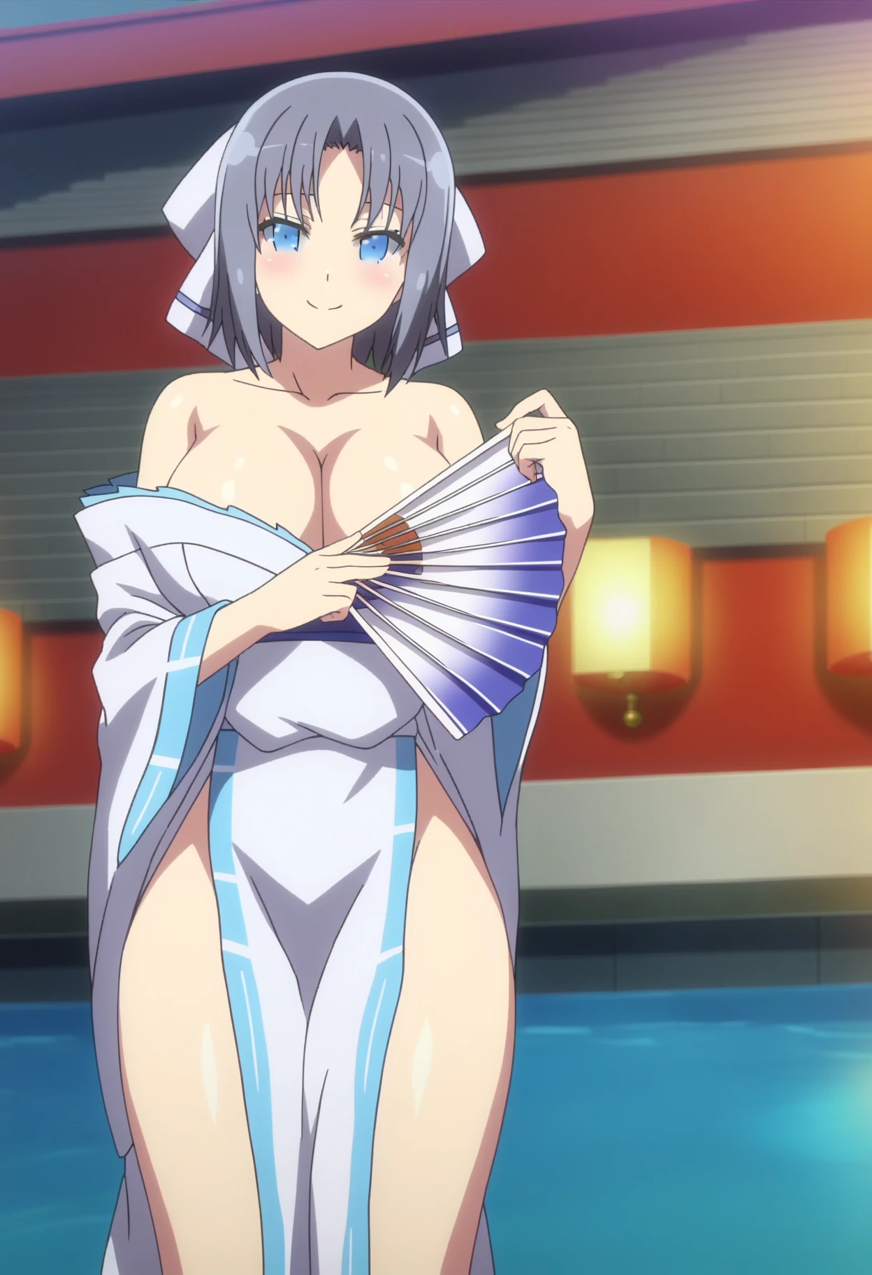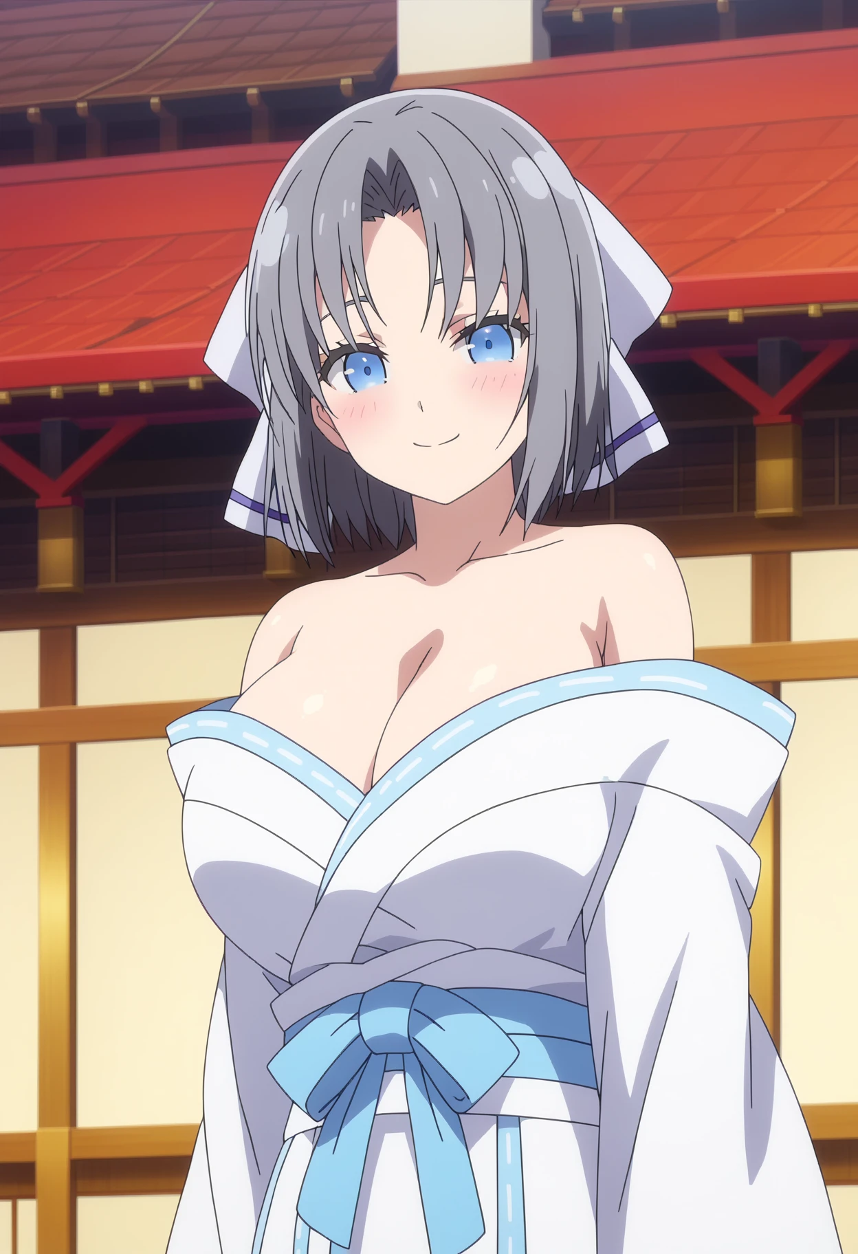 shiyumidef, short hair, grey hair, blue eyes, hair bow, large breasts, cleavage, bare shoulders, japanese clothes, white kimono, off shoulder, shiny skin, low neckline, side slit, thighs,