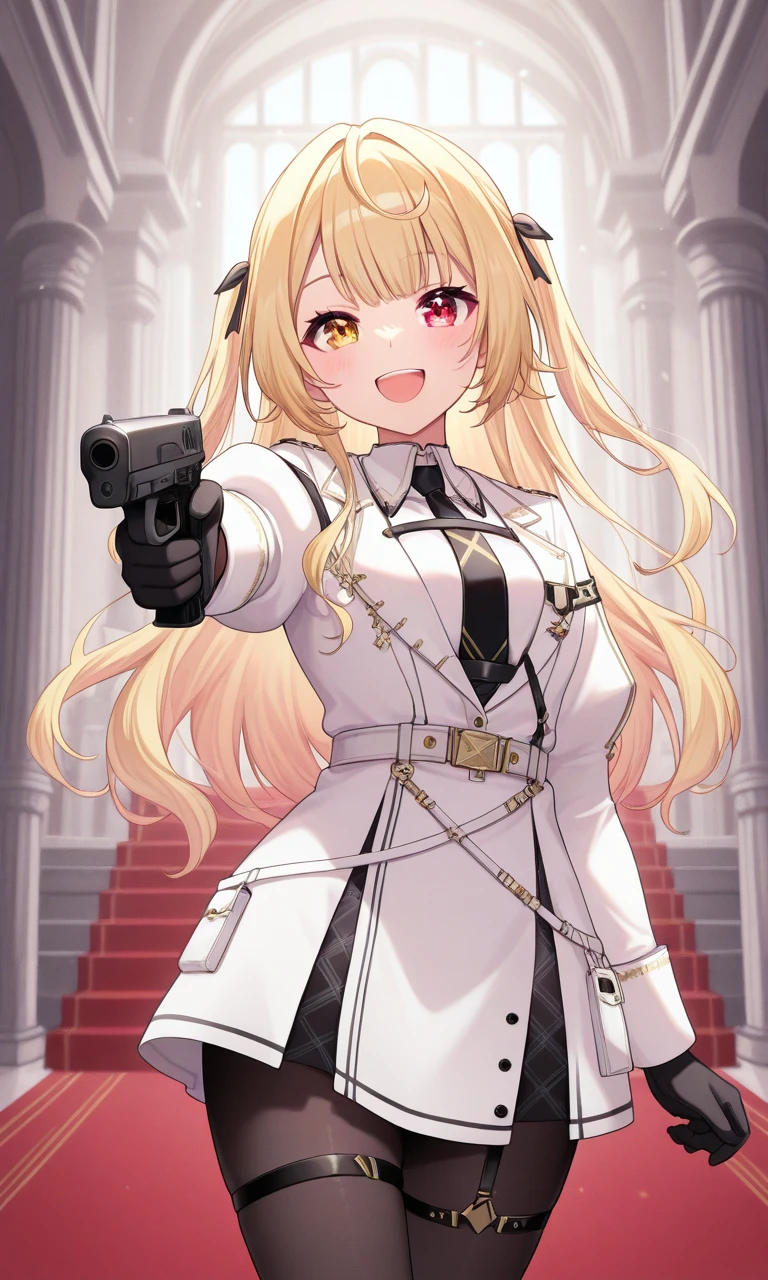 hoshikawa6th, heterochromia, long hair, hair ribbon, black ribbon, two side up, white shirt, collared shirt, black necktie, long sleeves, lapels, black gloves, white belt, white dress, black pantyhose, thigh strap