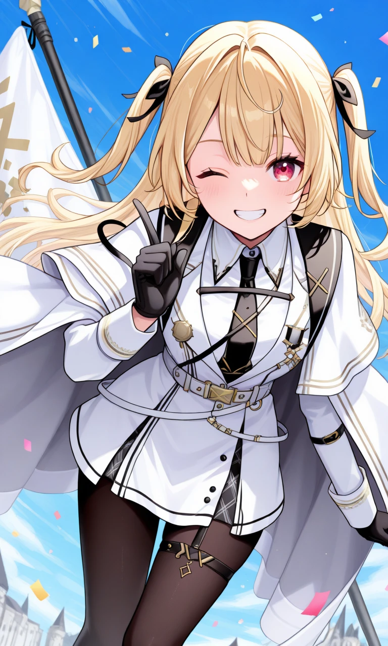 hoshikawa6th, heterochromia, long hair, hair ribbon, black ribbon, two side up, military hat, white shirt, collared shirt, black necktie, long sleeves, white cape, lapels, black gloves, white belt, white dress, black pantyhose, thigh strapYou can remove