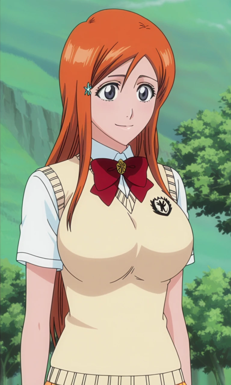 inoue orihime,1girl,solo,orange hair, grey eyes,long hair, hair ornament,hairpin, school uniform,collared shirt,red bow,white shirt,Short sleeve,vest,sweater vest,grey skirt,pleated skirt,miniskirt,