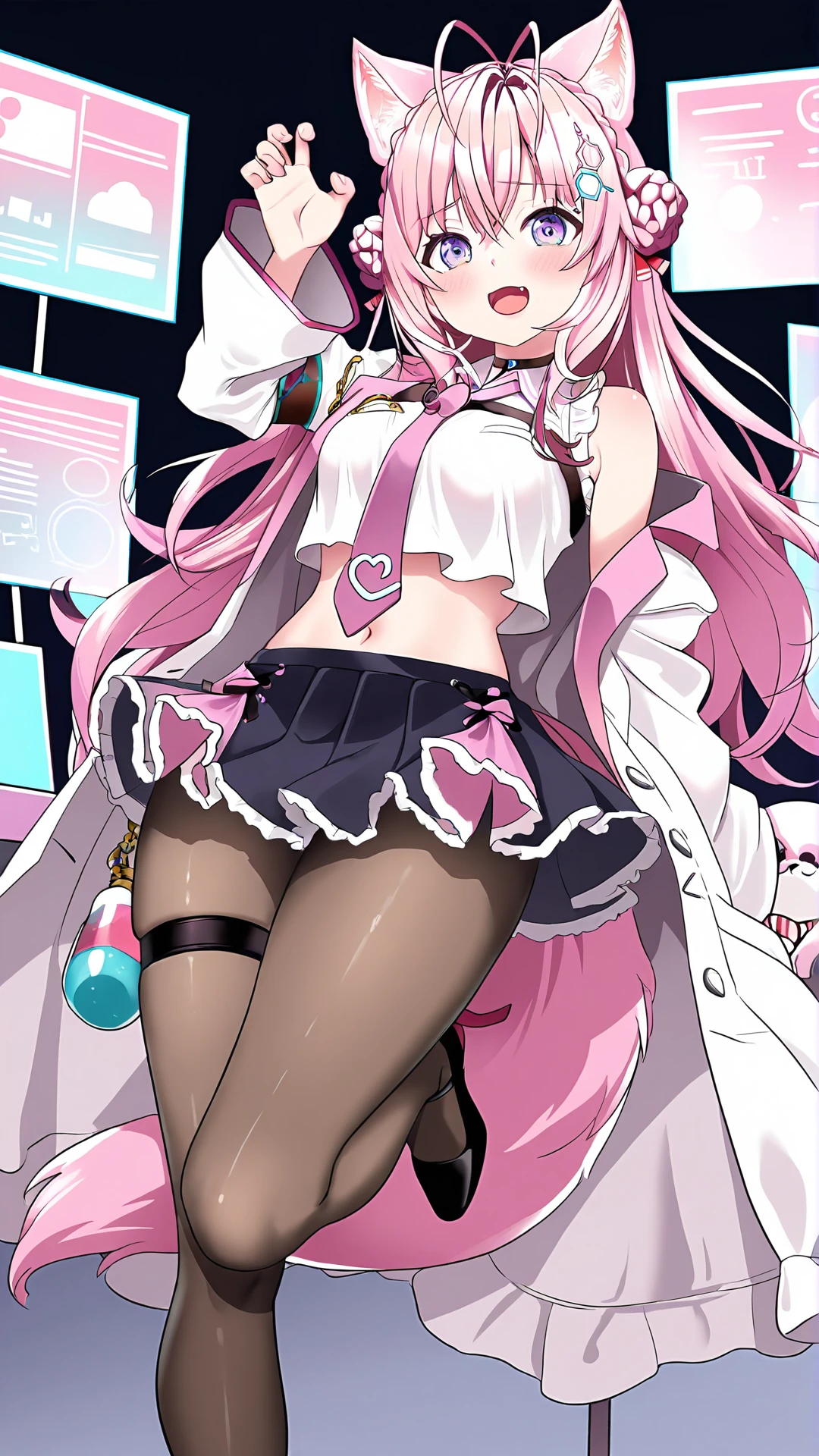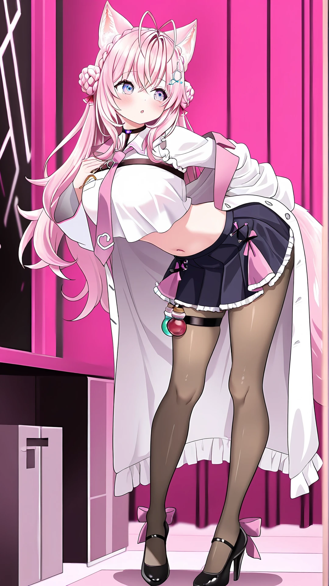 koyorijiken,1girl,hakui koyori,virtual youtuber,hakui koyori (1st costume),animal ears,long hair,skirt,pantyhose,pink hair,necktie,tail,wolf ears,hair bun,shirt,braid,high heels,white shirt,wolf tail,lab coat,black skirt,purple eyes,midriff,double bun,navel,long sleeves,thigh strap,hexagon hair ornament,crop top,collared shirt,pocket watch,brown pantyhose,hair ornament,wolf girl,coat,frills,breasts,antenna hair,