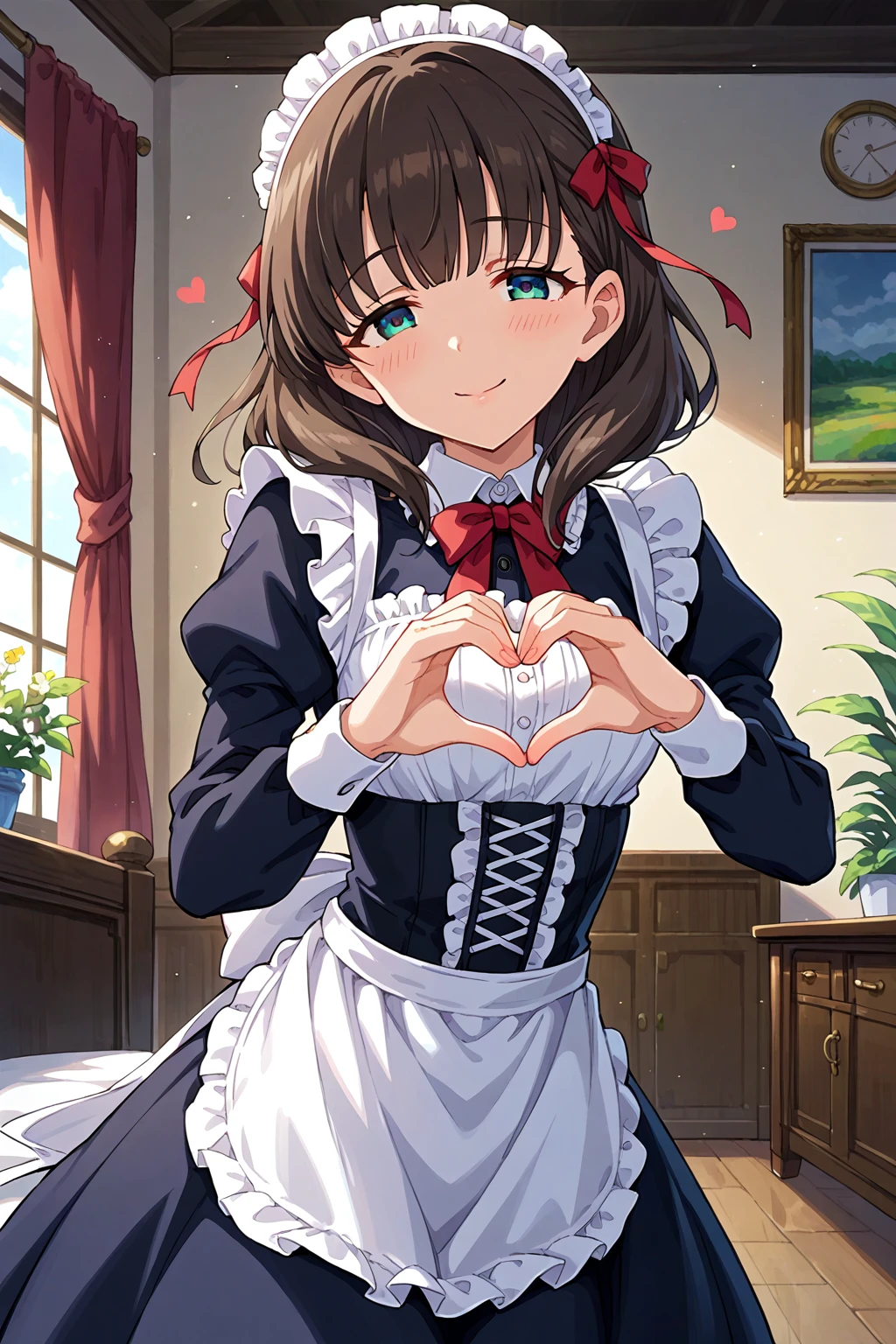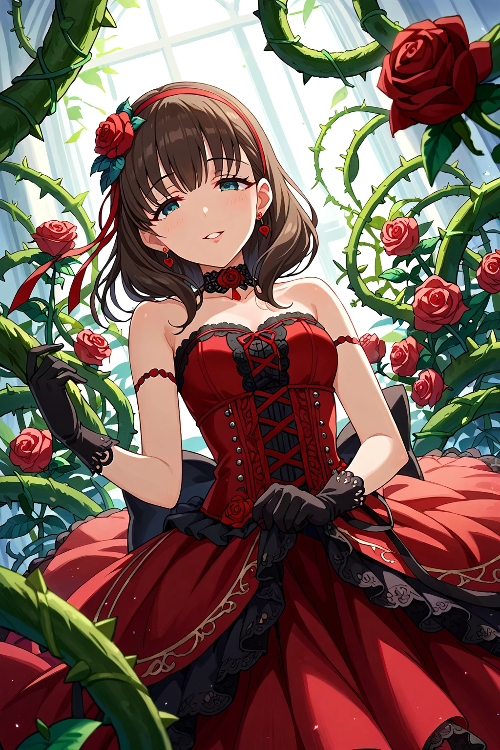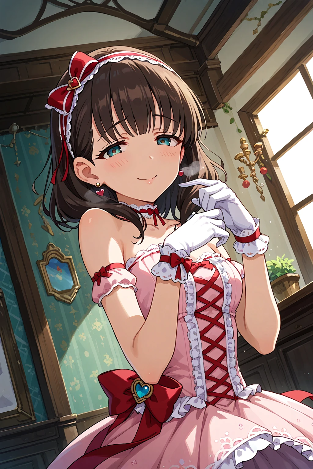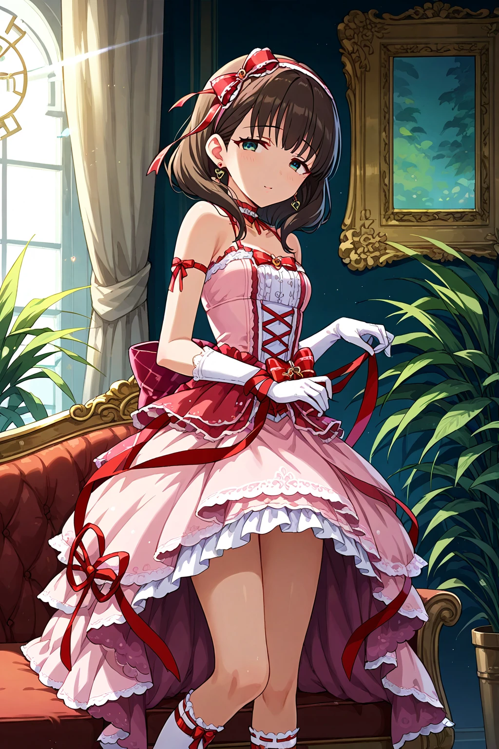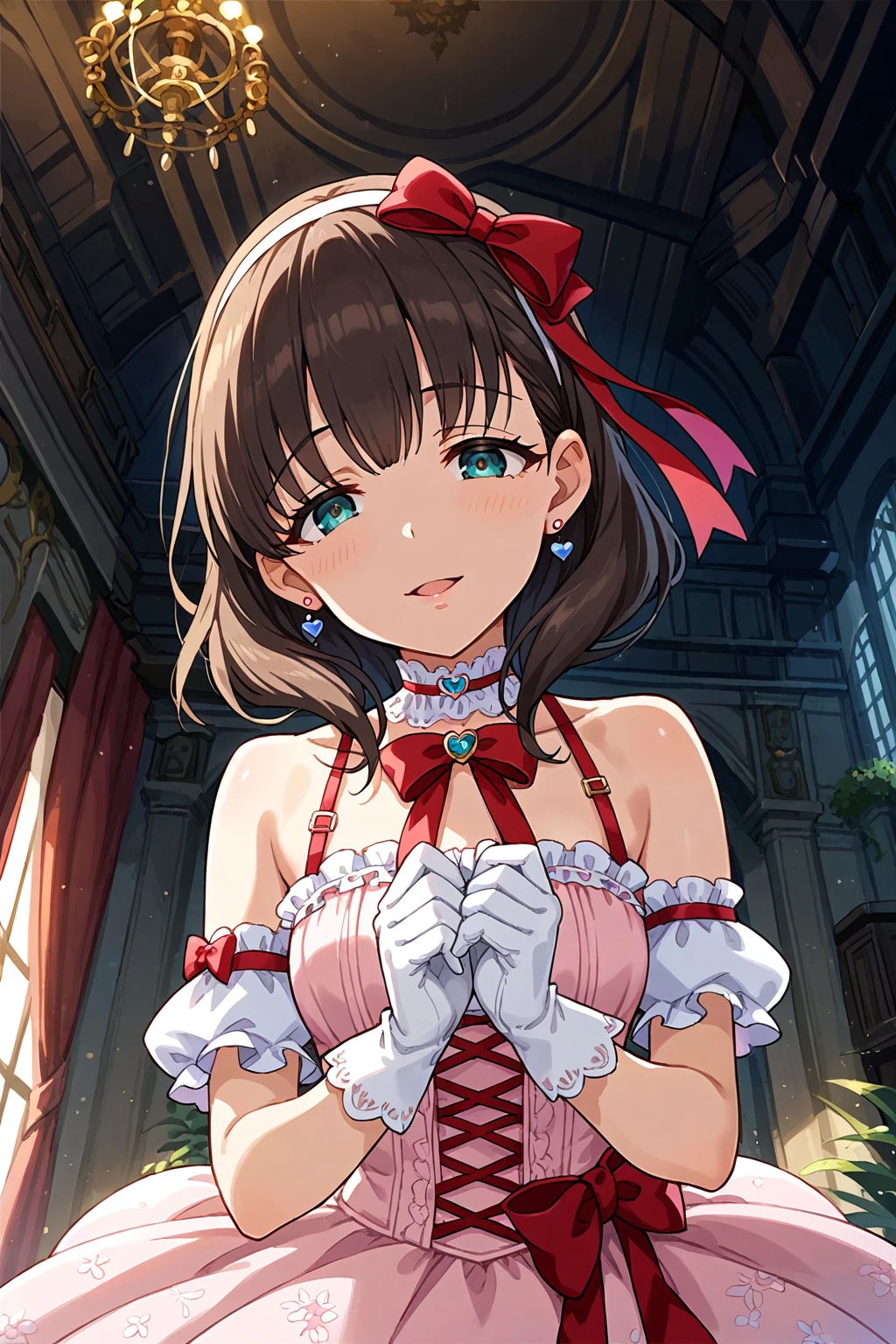 dress, jewelry, gloves, earrings,ribbon, hairband, looking at viewer, pink dress,bare shoulders, bow, heart, white gloves, choker, red ribbon, hair ribbon,socks