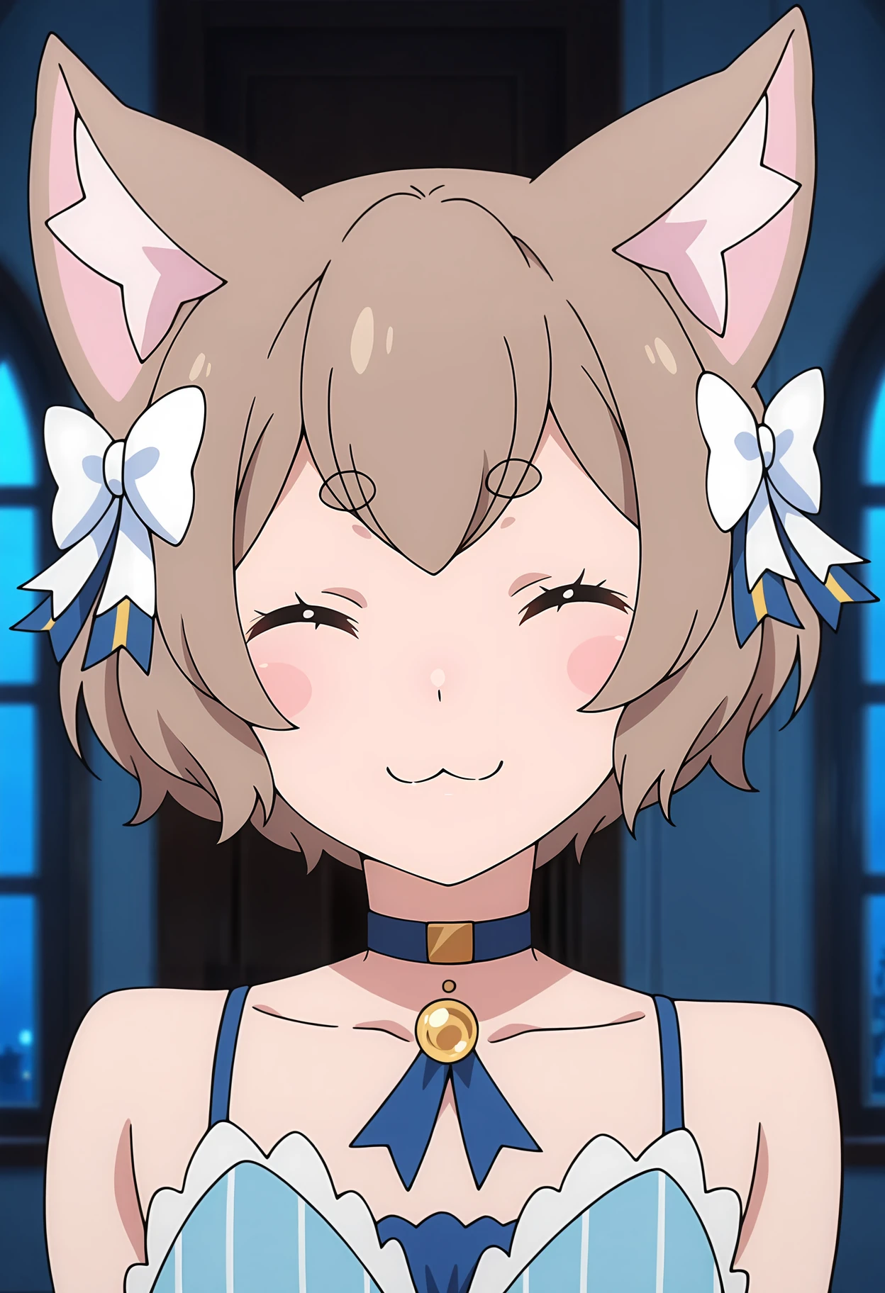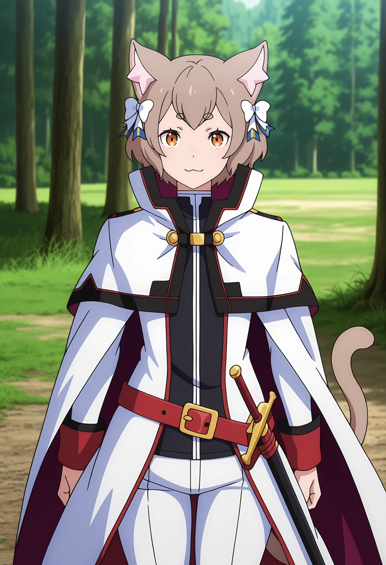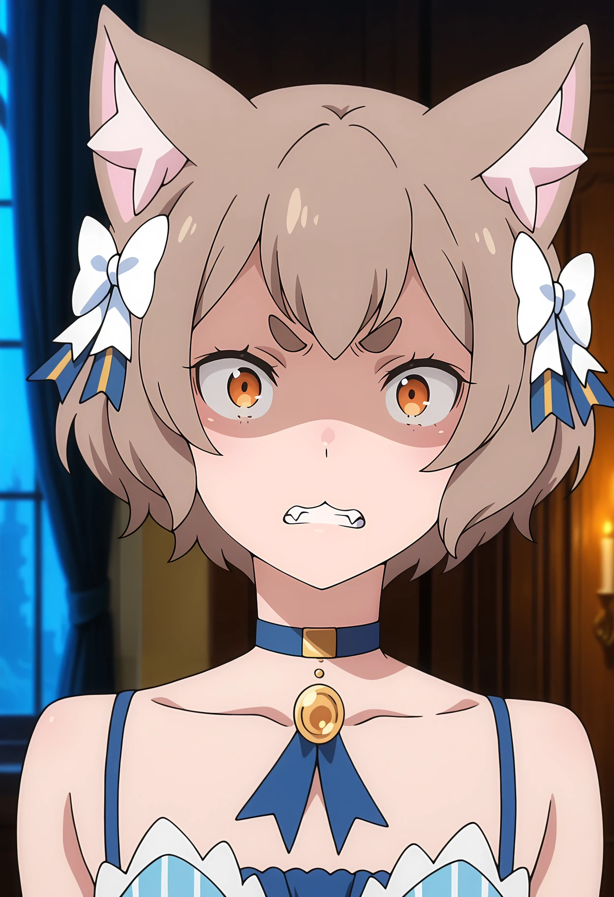 short hair, brown hair, orange eyes, short eyebrows, cat ears, cat tail, hair bow, white bow