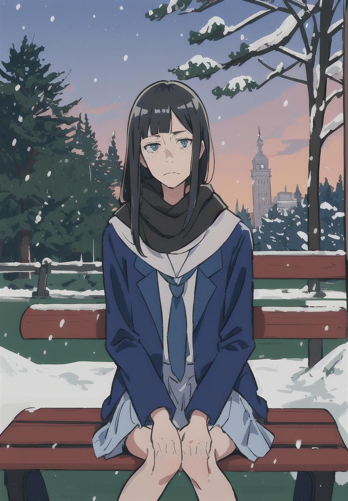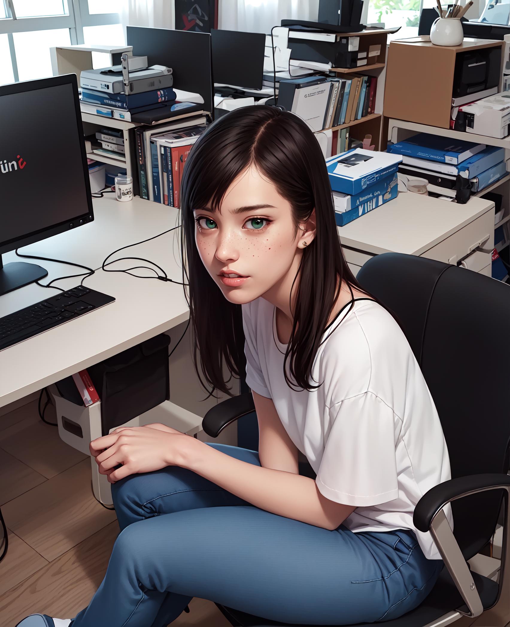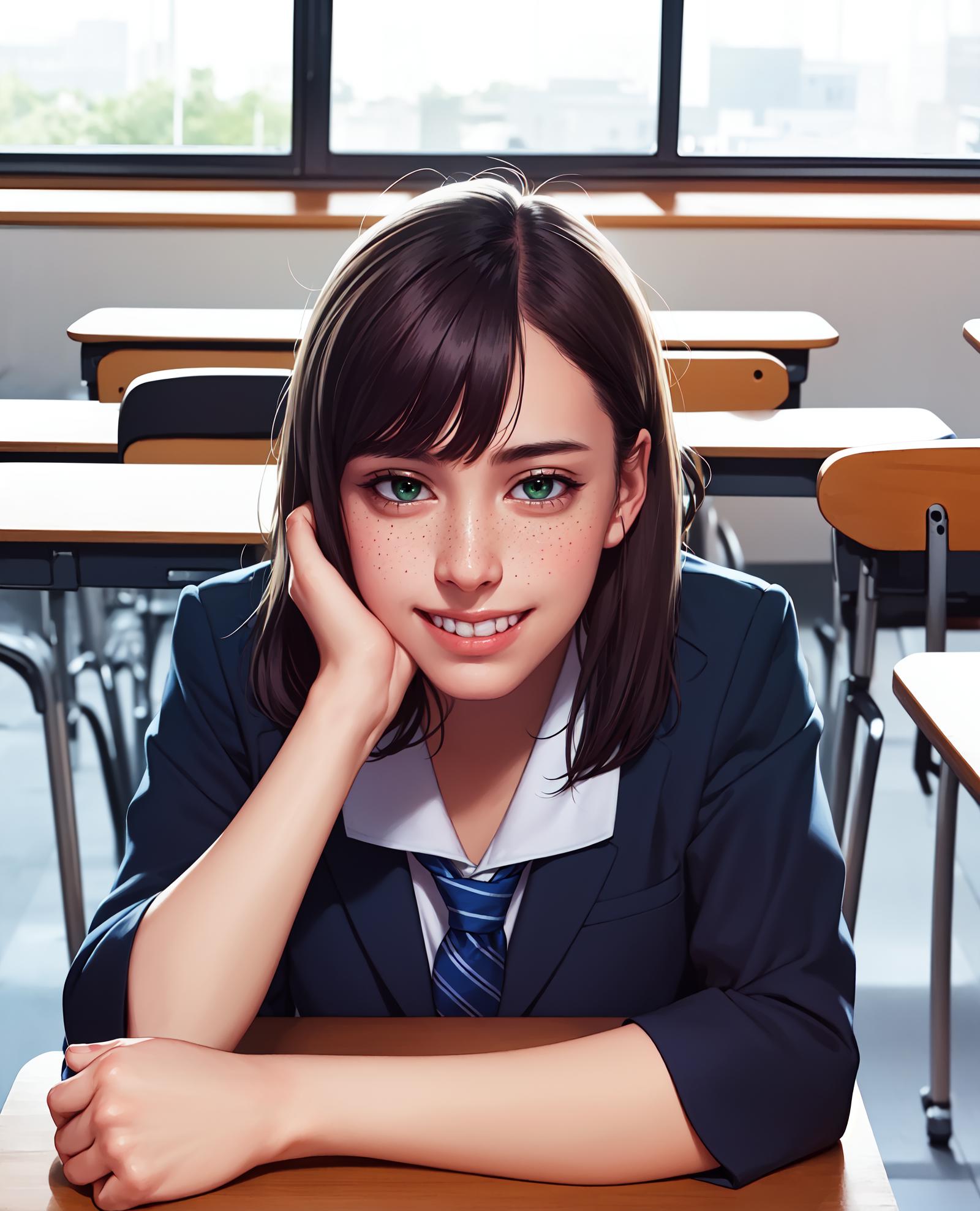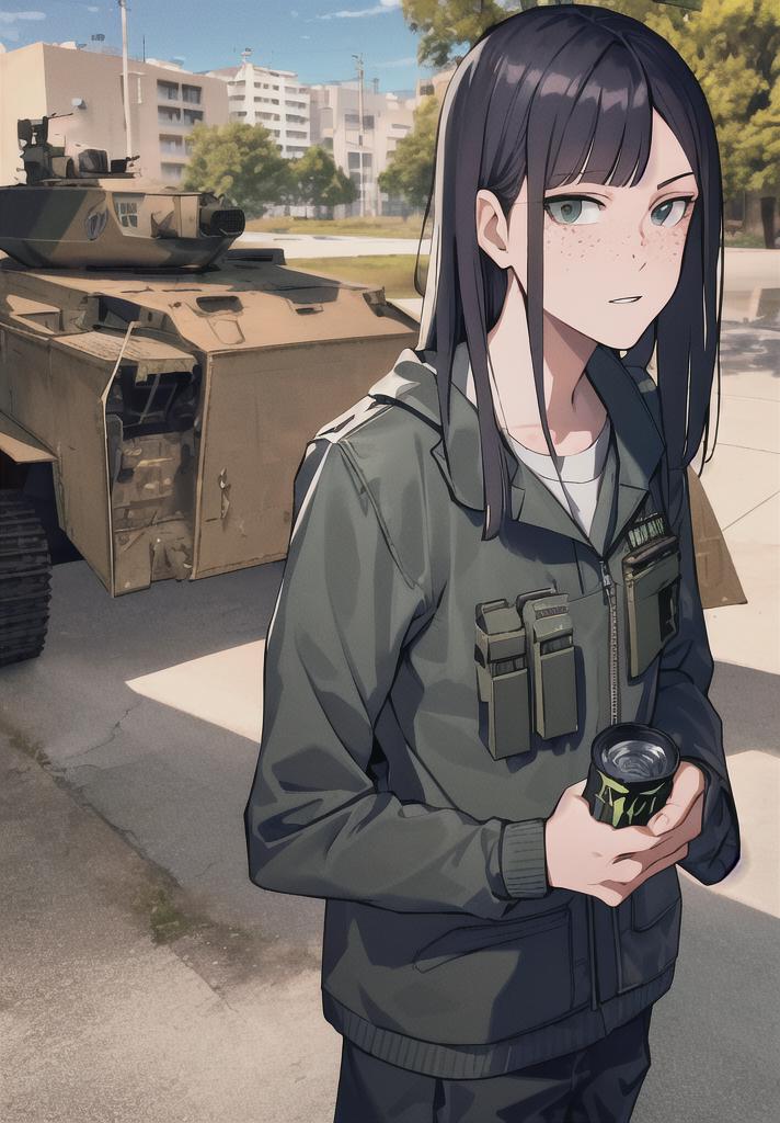 "freckles, asymmetrical blunt_bangs, sanpaku_eyes"