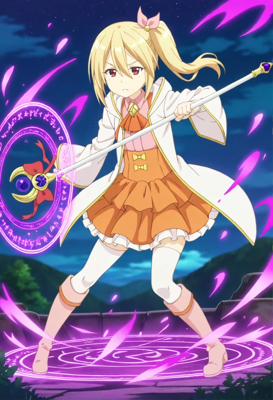 frederica-default,frederica \(bofuri\),red eyes,blonde hair,side ponytail,hair ribbon, white hoodie,pink shirt,ascot,orange skirt,frilled skirt, pink knee boots,white thighhighs,shoulder bag