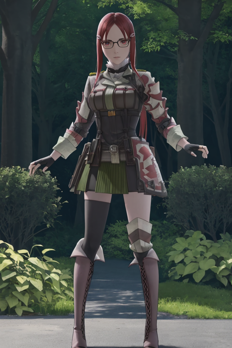 Prompt: minerva_vc, skirt, hair ornament, thighhighs, boots, hairclip, black thighhighs, fingerless gloves, armor, uniform, zettai ryouiki, military, military uniform, knee boots