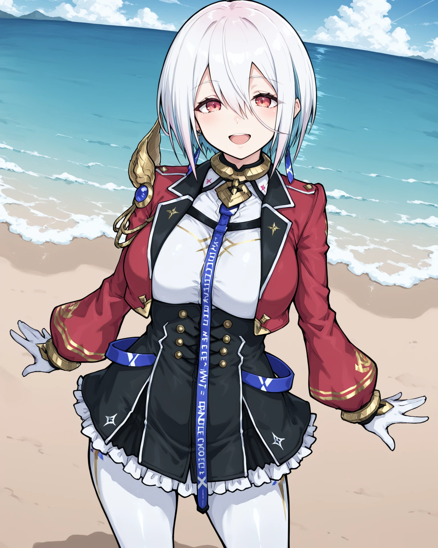 idolagiselle, red eyes, white hair, colored inner hair, blue hair, hair between eyes, short hair, earrings, metallic collar, blue neck ribbon, text on ribbon, white bodysuit, bodysuit under clothes, red jacket, cropped jacket, epaulette, long sleeves, metallic cuffs, white gloves, black skirt, frilled skirt, white pantyhose, red boots, armored boots,