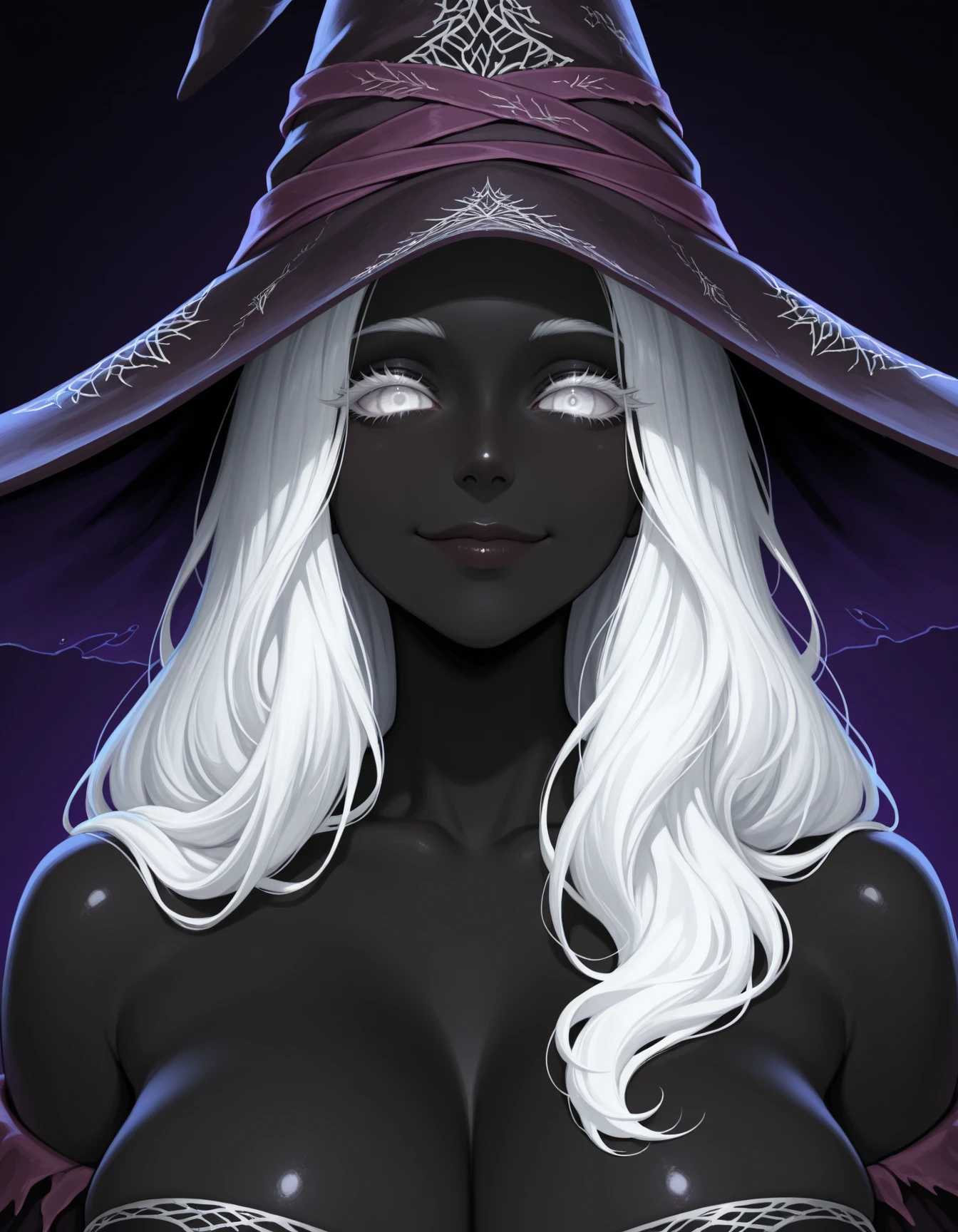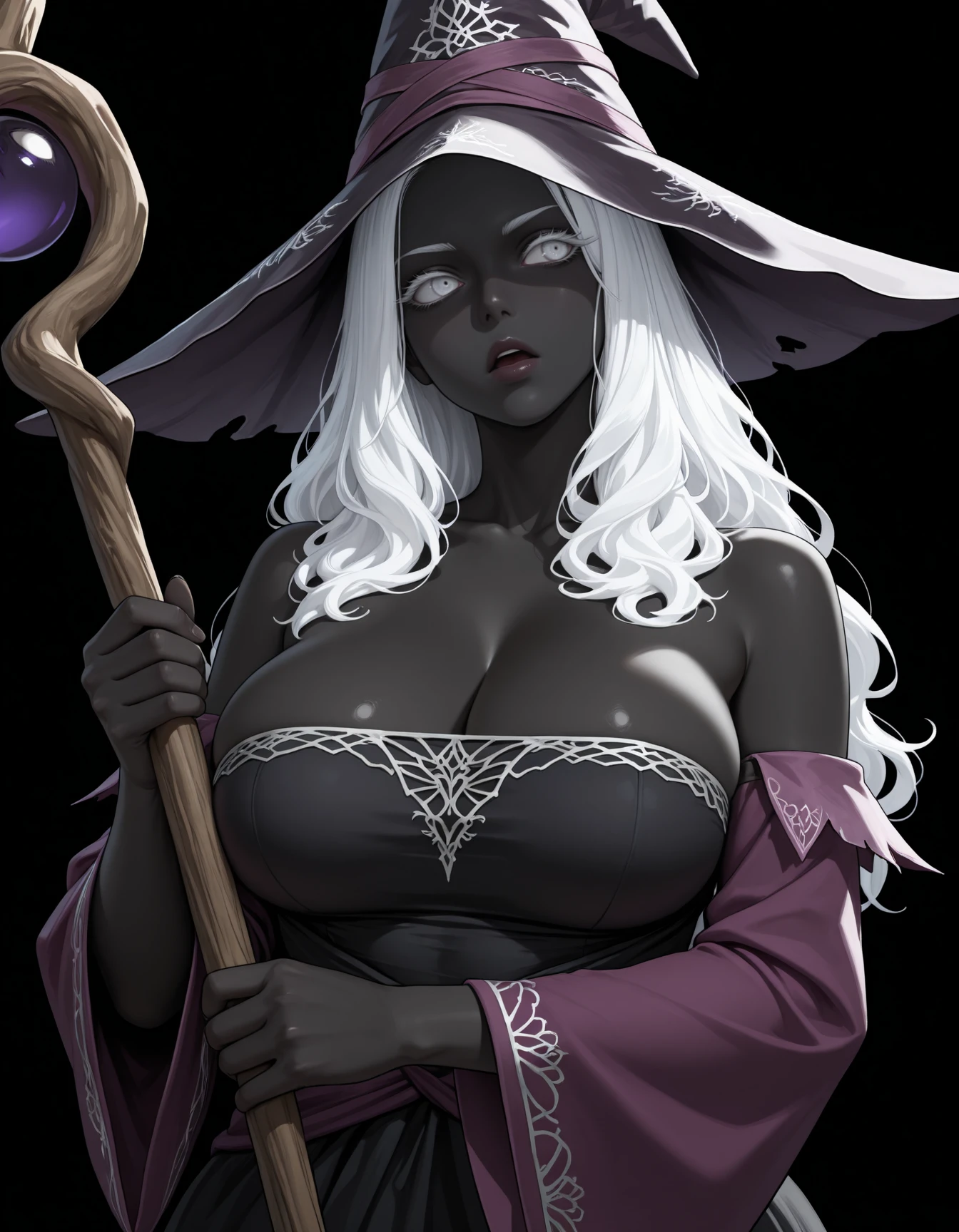 white hair, long hair, white eyes, colored eyelashes, large breasts, black skin,