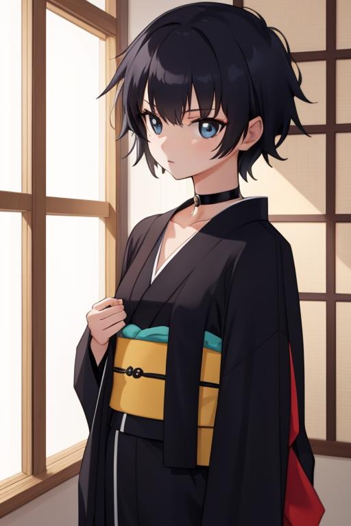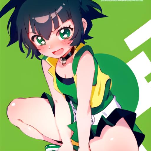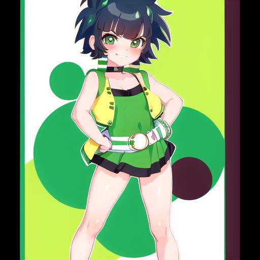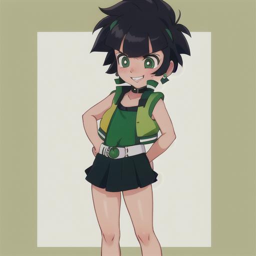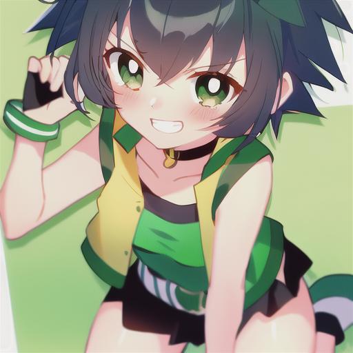 ppgz, black short hair, choker, (sleeveless green jacket)