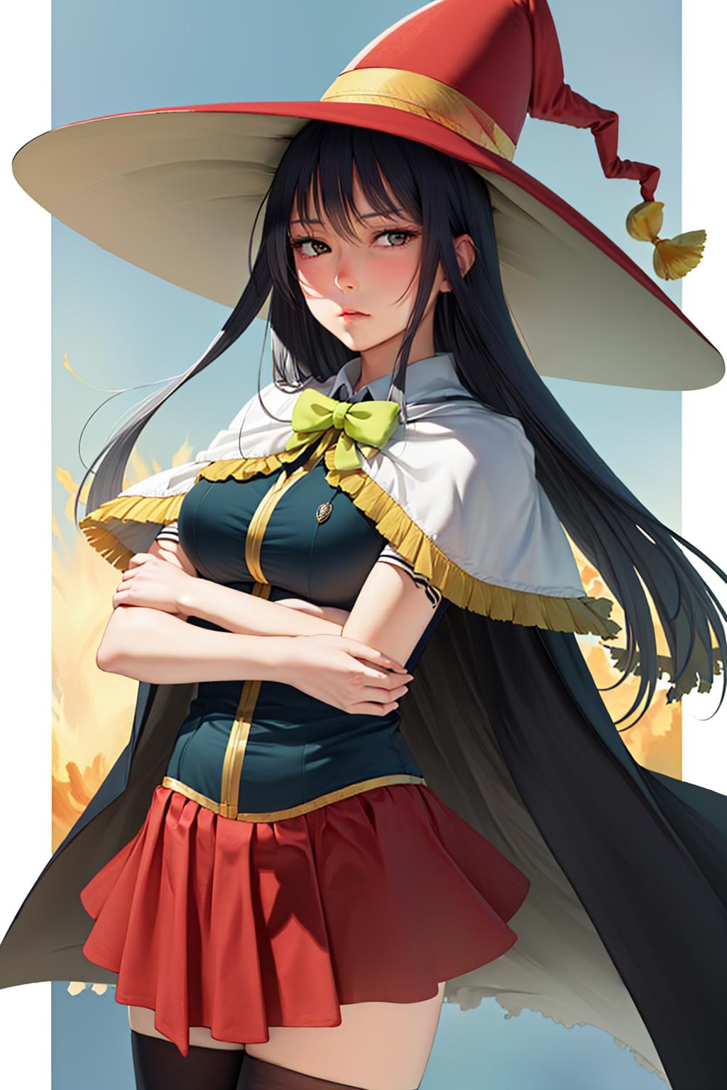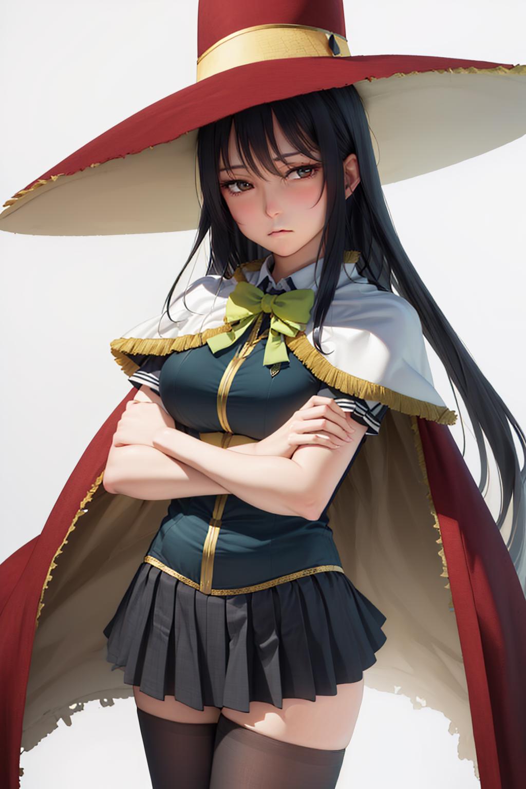 Default Outfit: witch hat, bow, cape, skirt, thighhighs