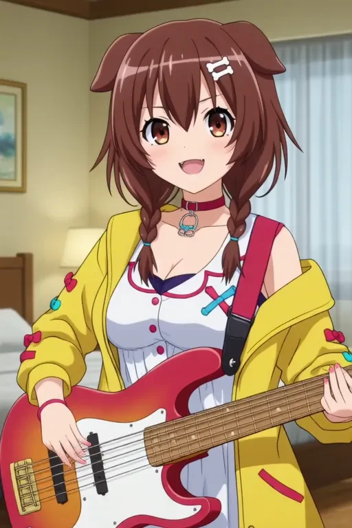sample prompt:Inugami Korone, anime-style girl. The image features an anime-style character with brown hair styled in twin braids. The hair is adorned with a small bone-shaped accessory on one side. The character has large, expressive eyes with a mix of brown and black, giving them a striking appearance. and is wearing a colorful outfit that includes a yellow jacket with red buttons and a white apron-like top. The jacket has a playful design with various colored buttons and a small bow on the left shoulder. (she is dancing:2.5), (chibi Nendoroid:3.5) in bedroom.