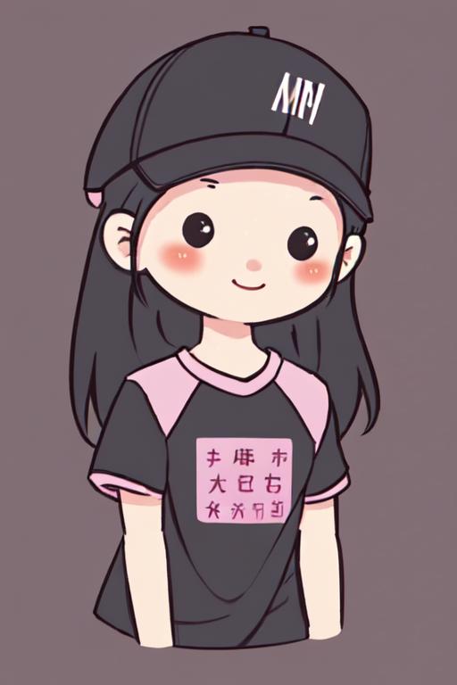 Prompt: chibi avatar, 1girl, solo, long hair, looking at viewer, blush, smile, simple background, shirt, black hair, hat, upper body, short sleeves, chibi, black eyes, t-shirt,baseball cap, pink headwear, raglan sleeves, <lora:chibi_avatar_v1:0.7>
