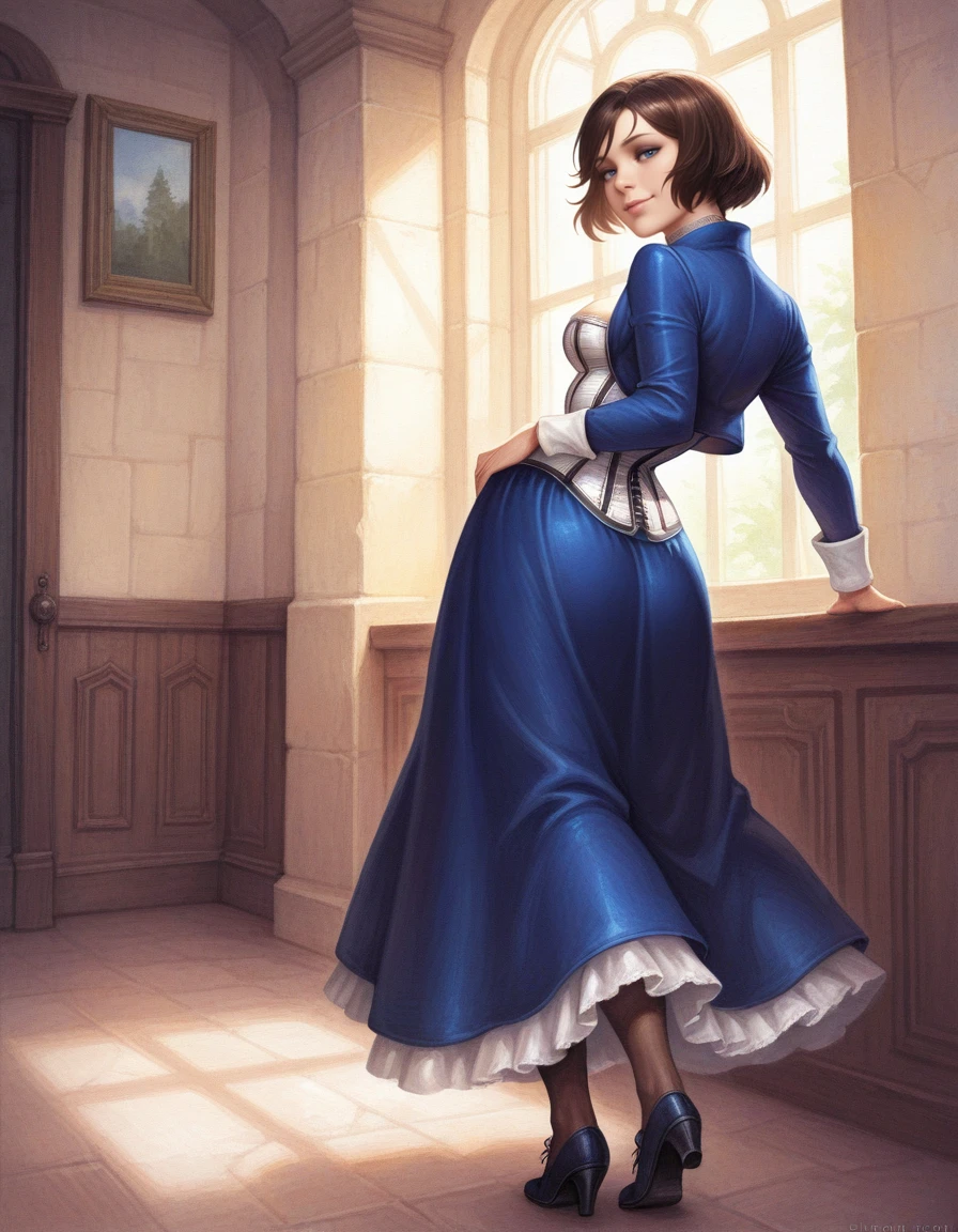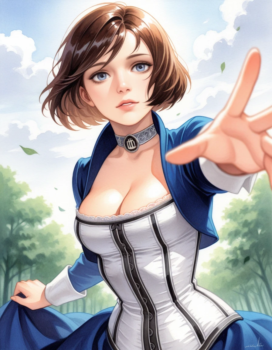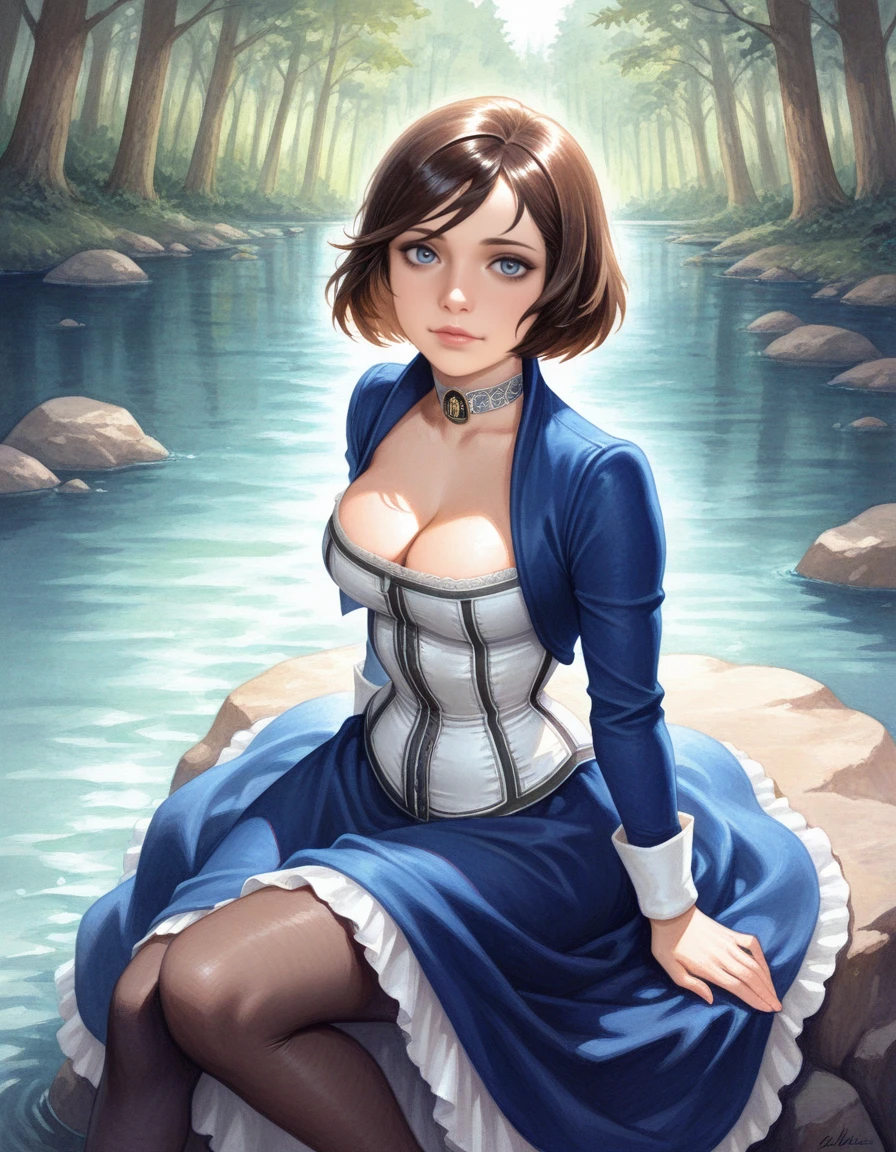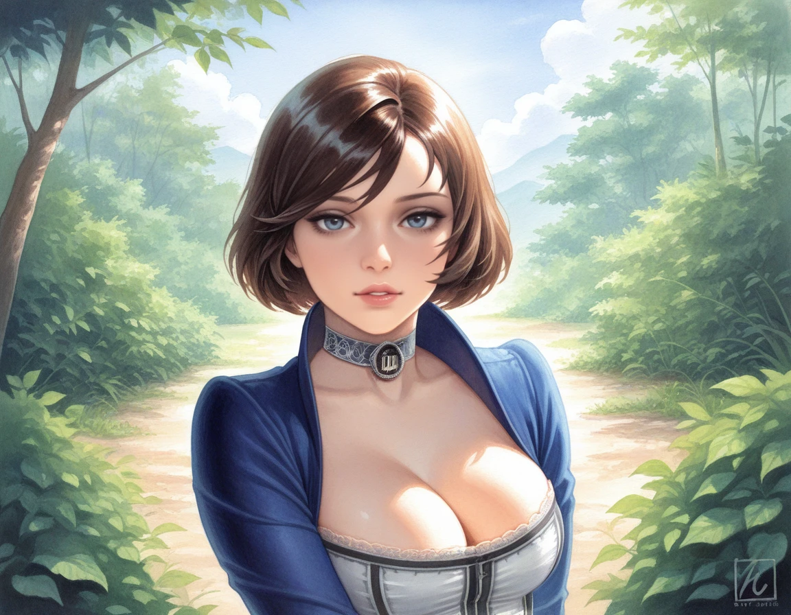 Starting prompt: 1girl, elizabeth \(bioshock infinite\), choker, short hair, brown hair, breasts, cropped jacket, bustier, cleavage, dress, pantyhose, shoes
