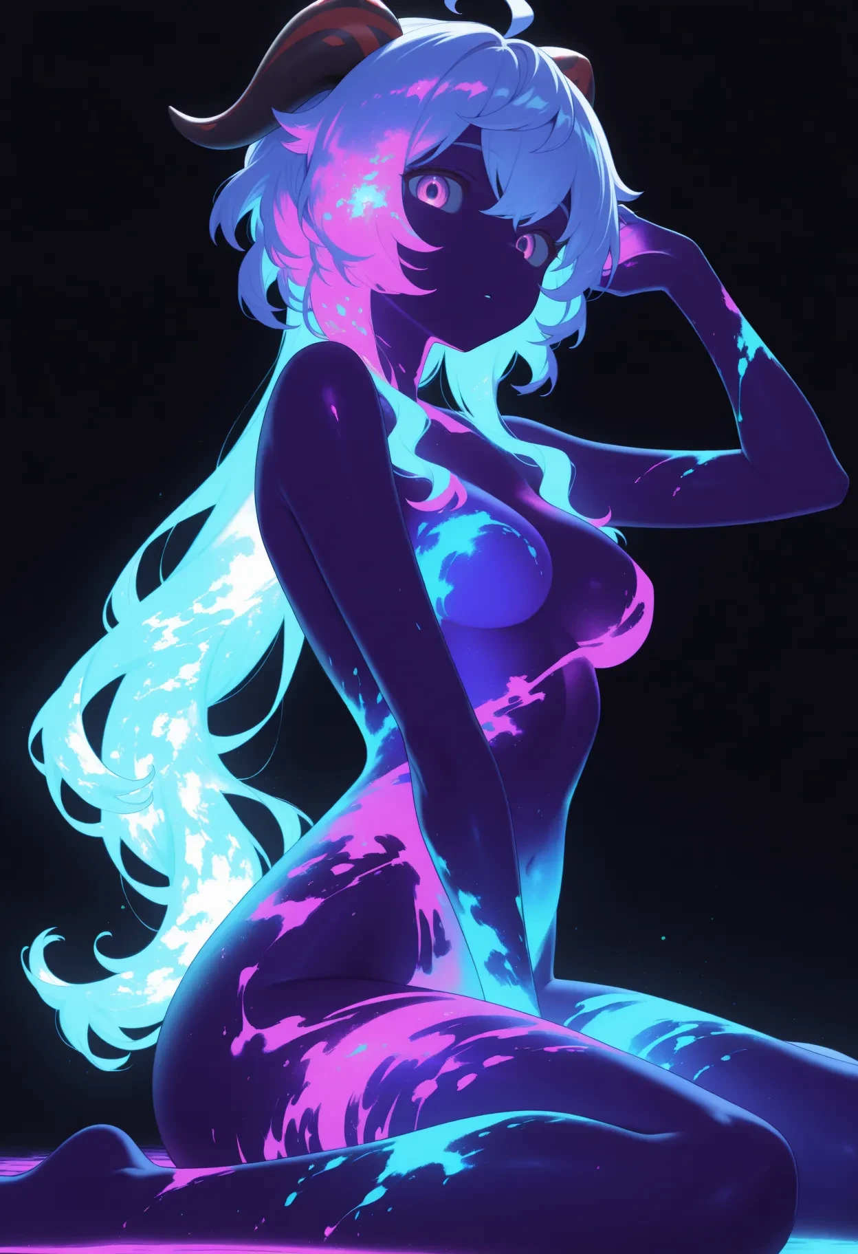 - ultraviolet light, black background, glowing, glowing hair, glowing eyes, bodypaint, multicolored paintTrained on Illustrious 0.1