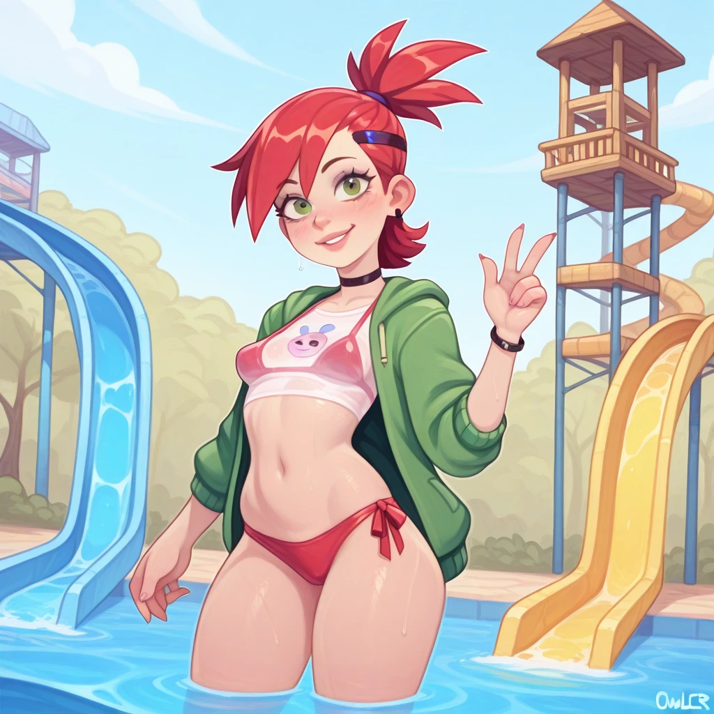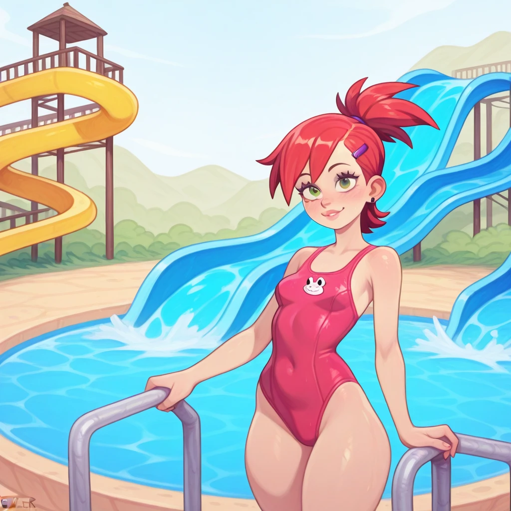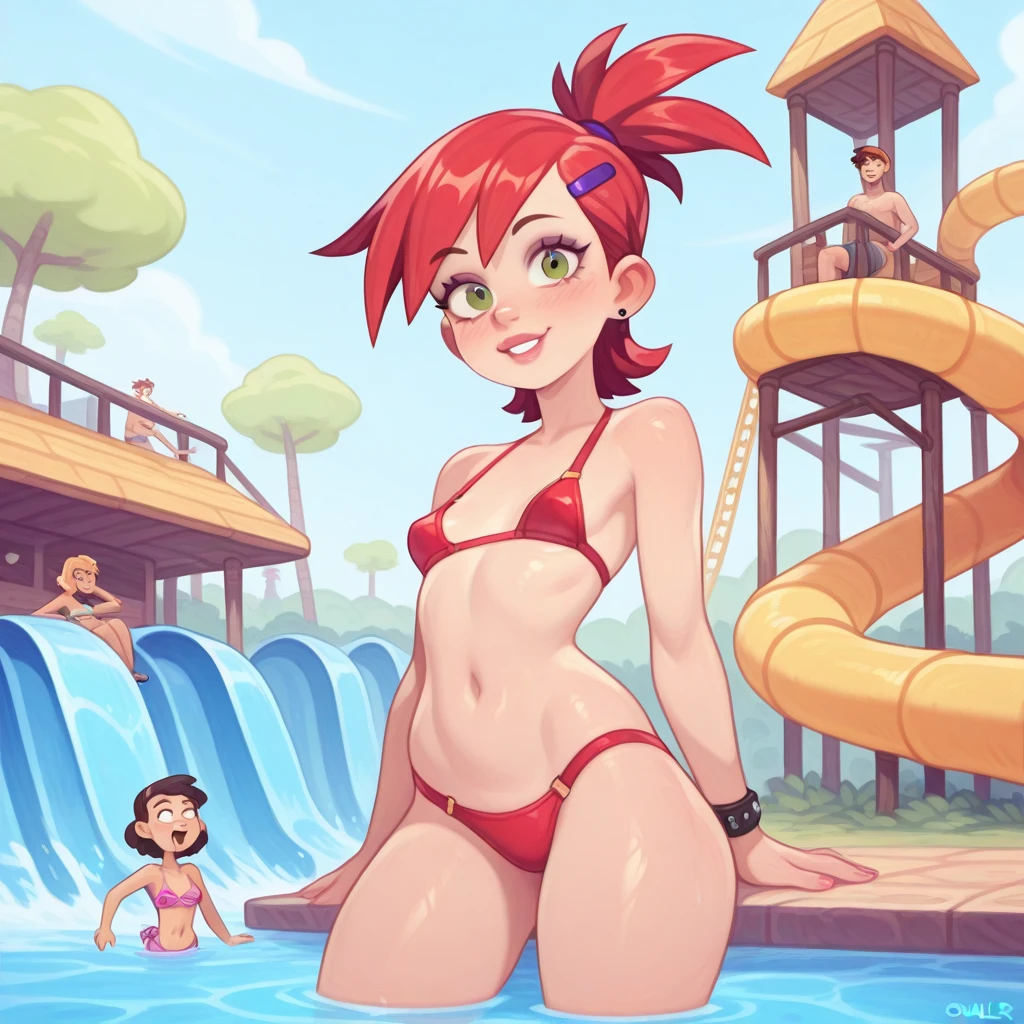 w473r_p4rk, twisting plastic tubes with water fully connected to pool, water, crowded, scaffolding, water slide tower, tall tower with many water slides down to pool, shallow water, theme park,