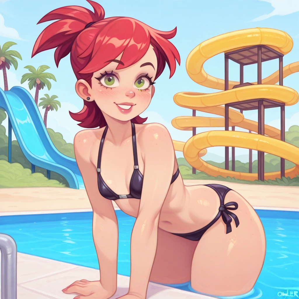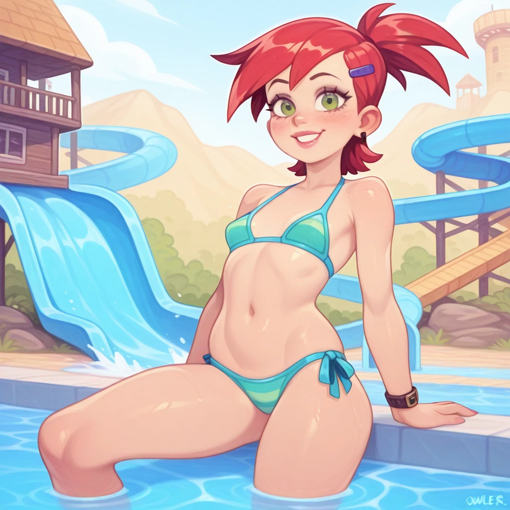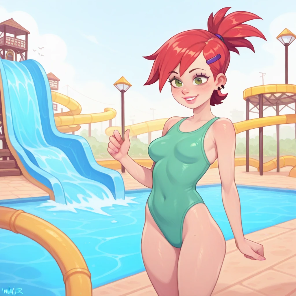 w473r_p4rk, twisting plastic tubes with water fully connected to pool, water, crowded, scaffolding, water slide tower, tall tower with many water slides down to pool, shallow water, theme park,