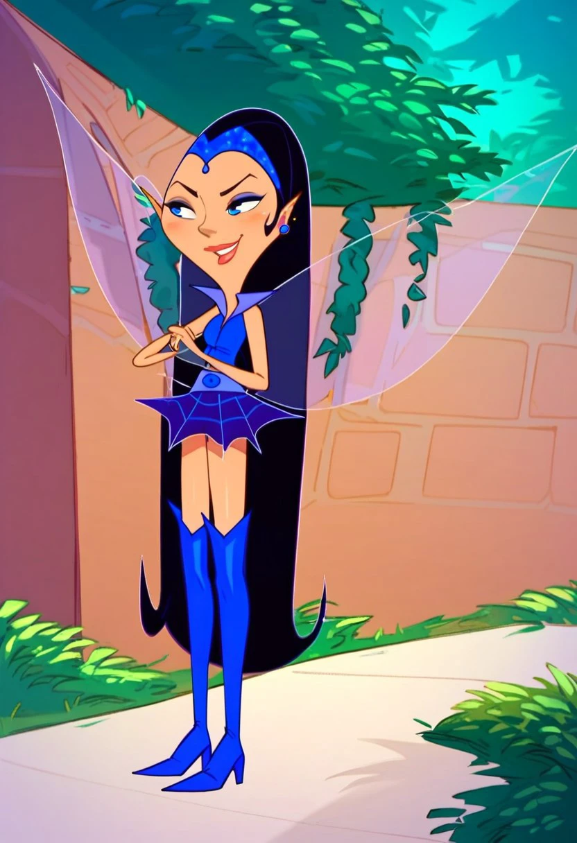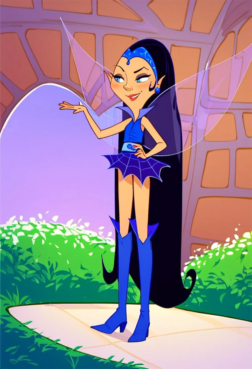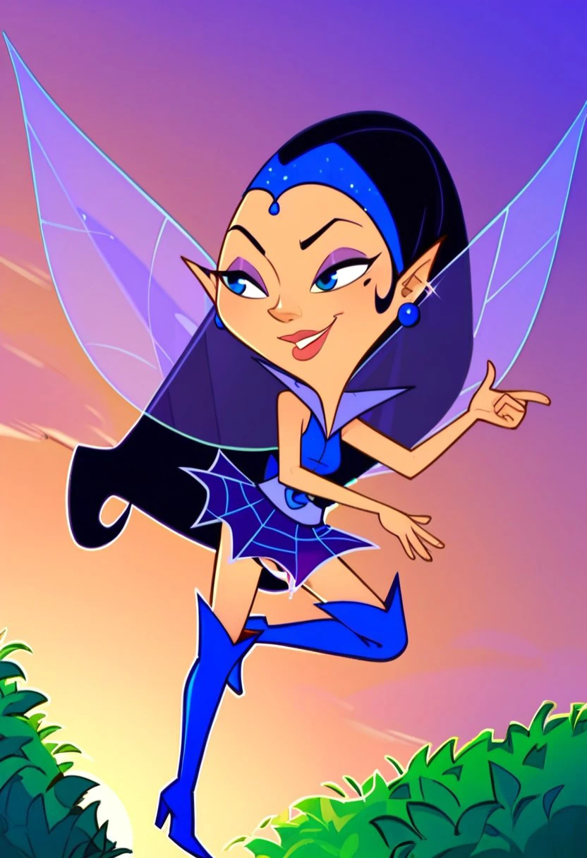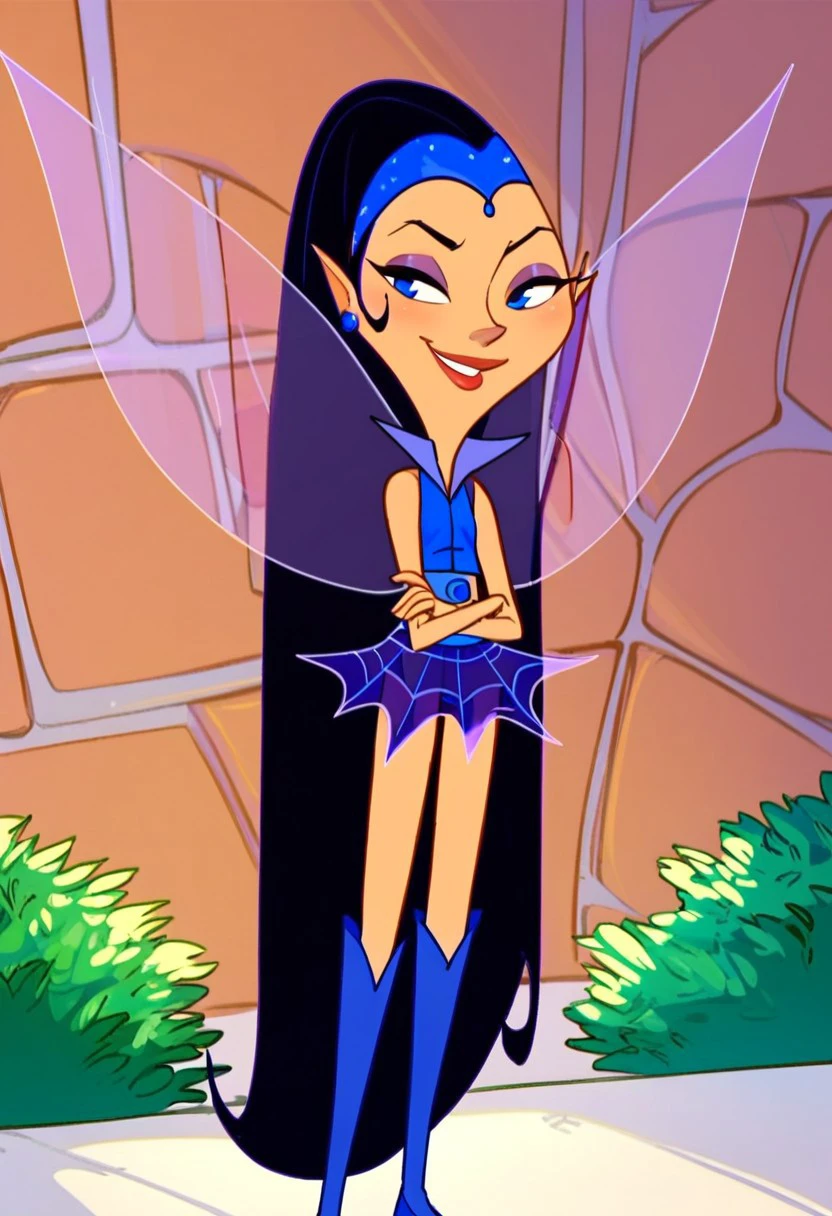 saphira, black hair, long hair, blue eyes, headband, pointy ears, earrings, makeup, fairy wings