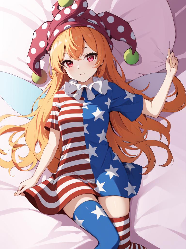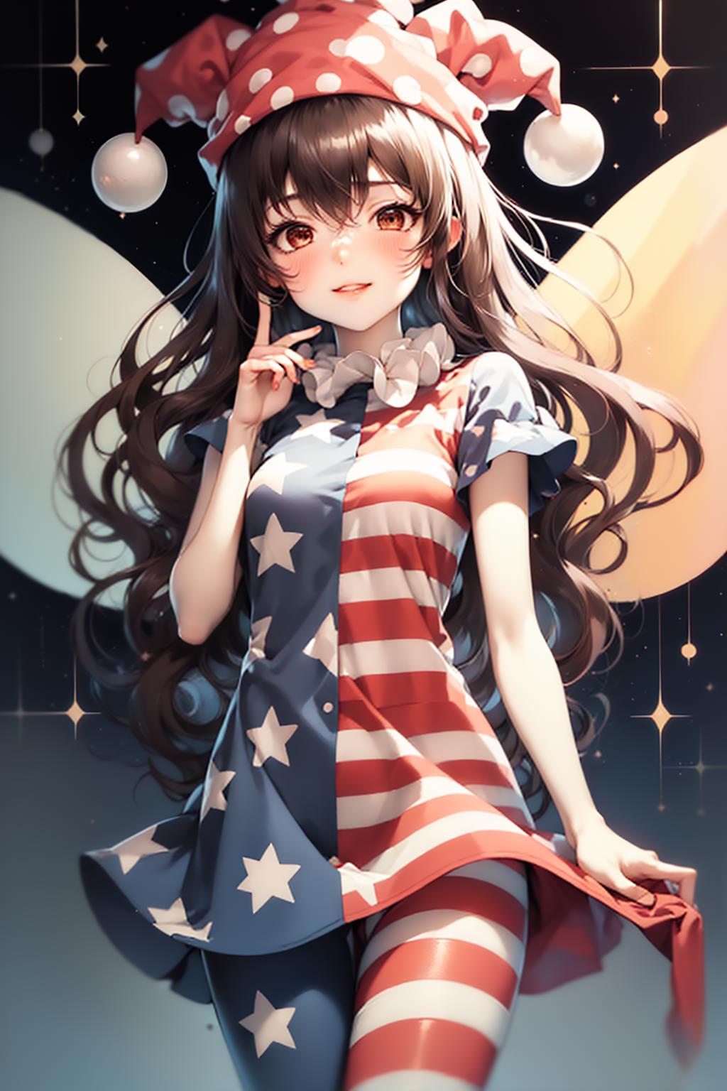 Default Outfit: jester cap, polka dot, american flag dress, neck ruff, short sleeves, american flag legwear, pantyhose, fairy wings, star \(symbol\)