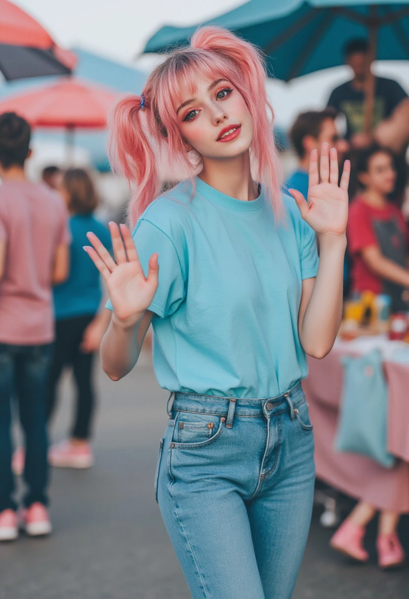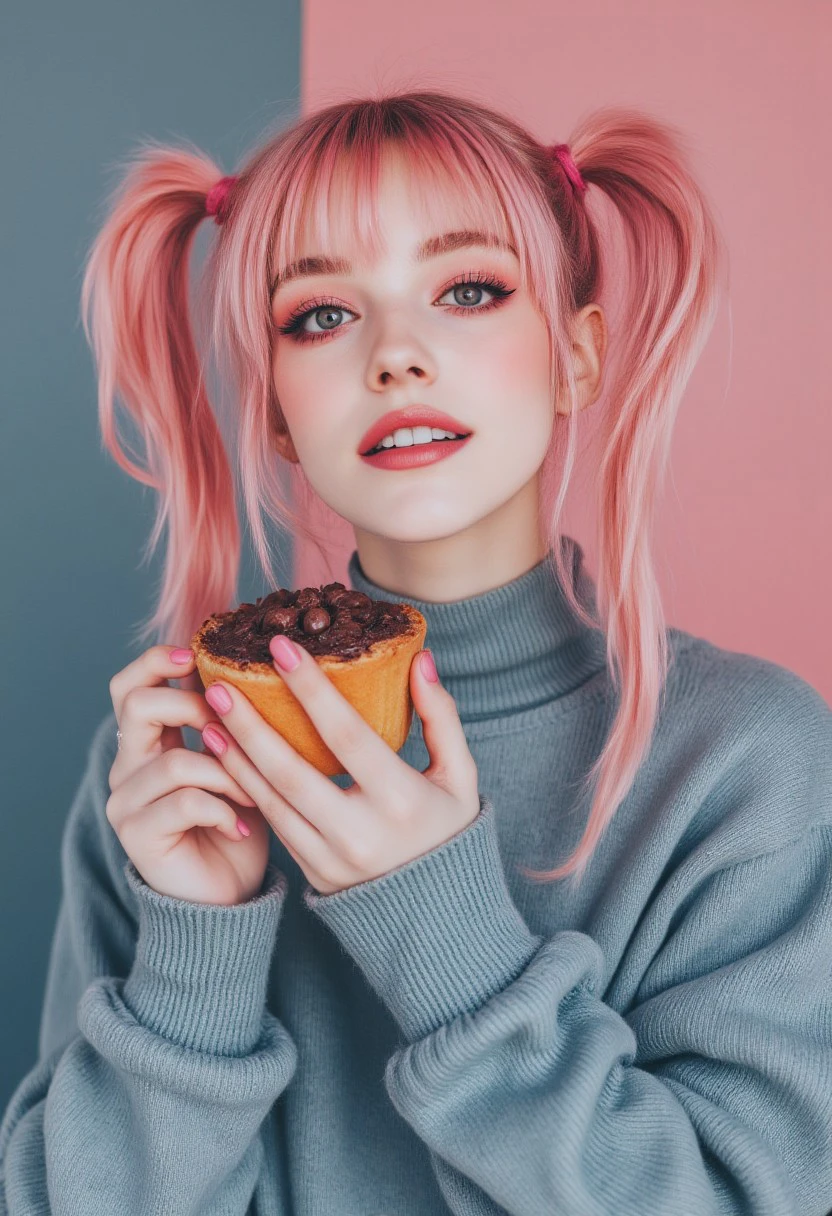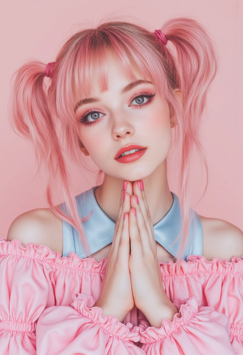 FictionalBerry,20 years old,homely girl with pastel pink twintails,light grey pupils, red eye makeup and glossy pink lips