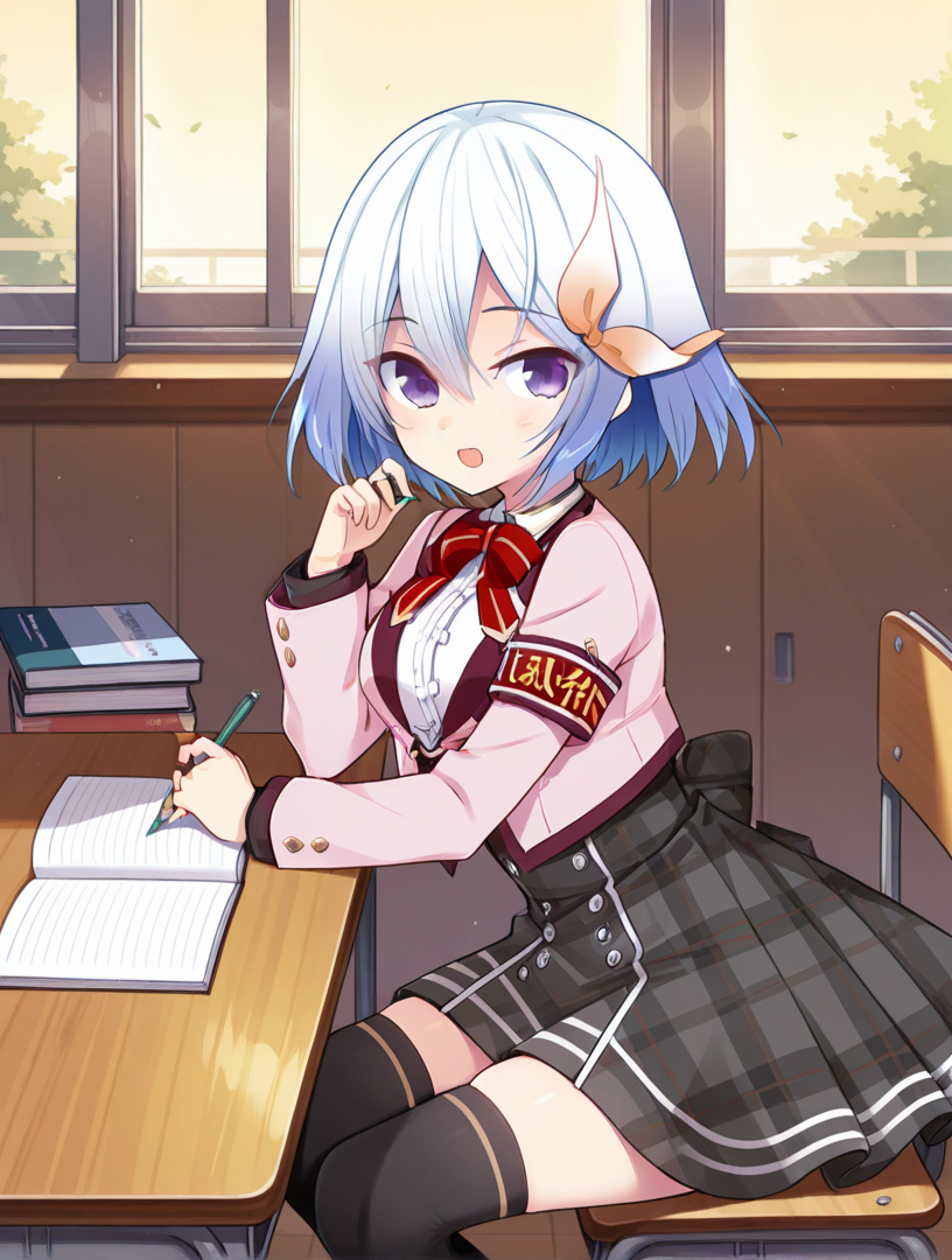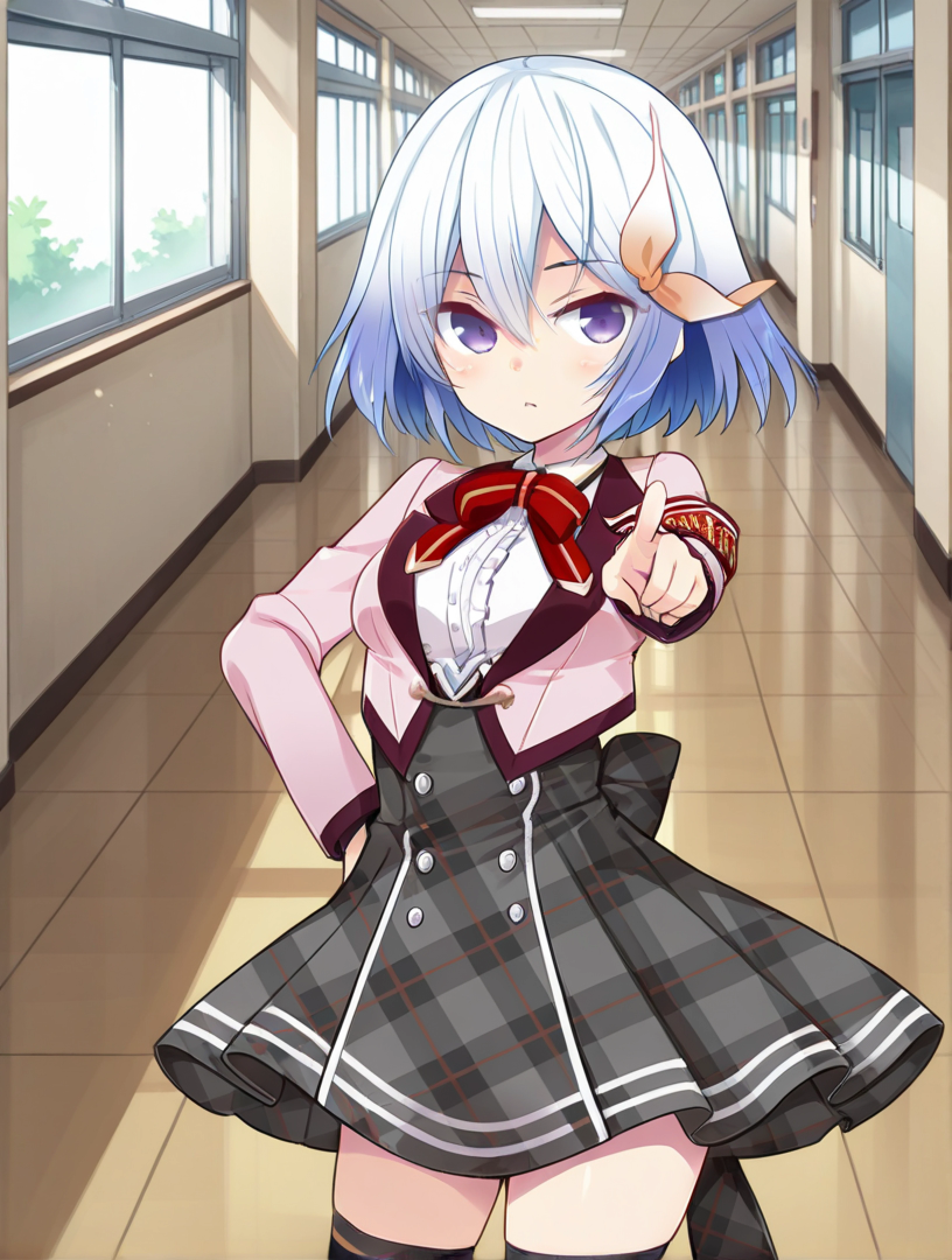 pink vest with red trim, red bow tie, white shirt, black skirt, plaid skirt, black thighhighs, white loafers