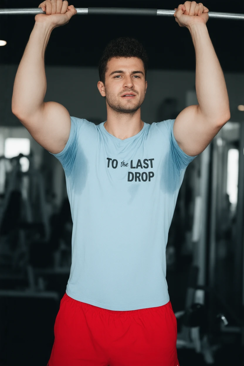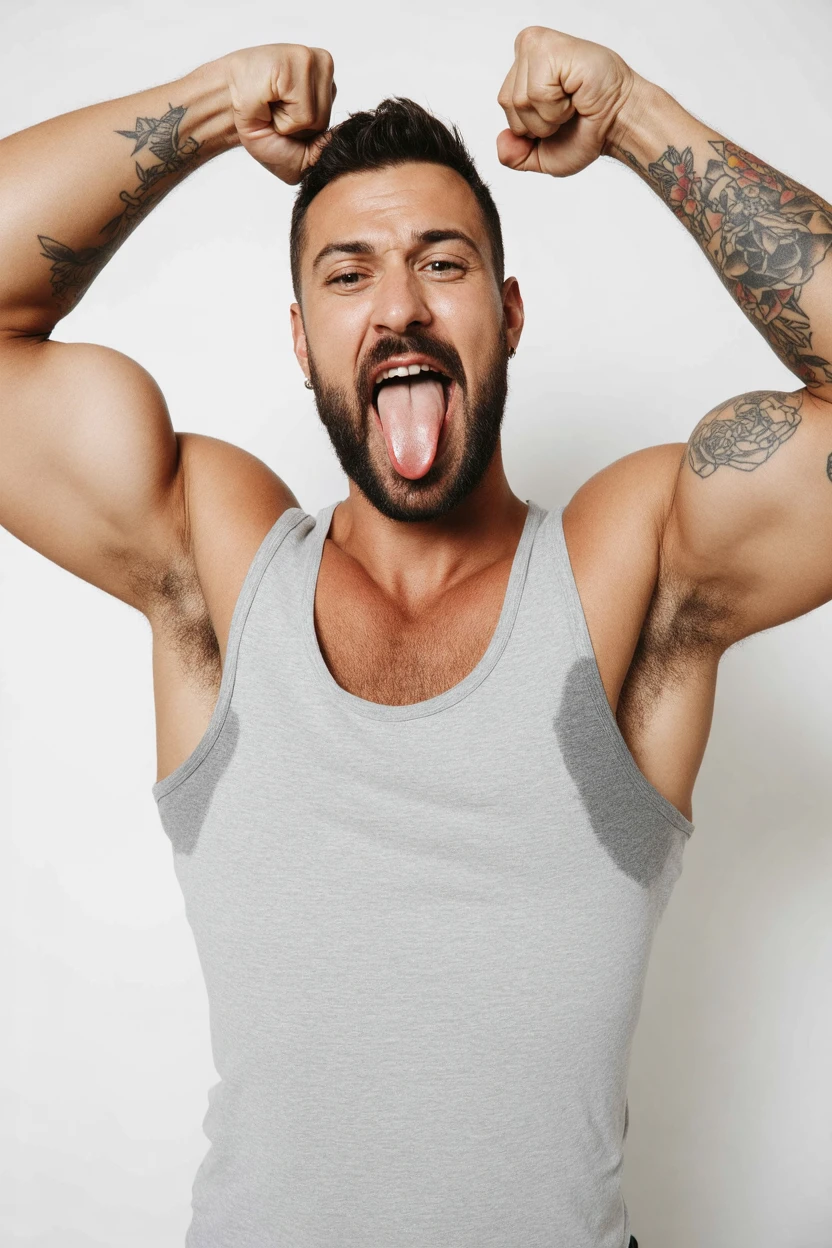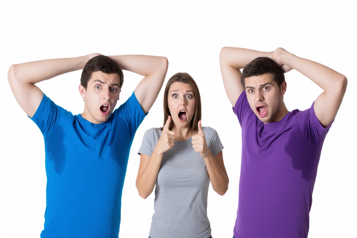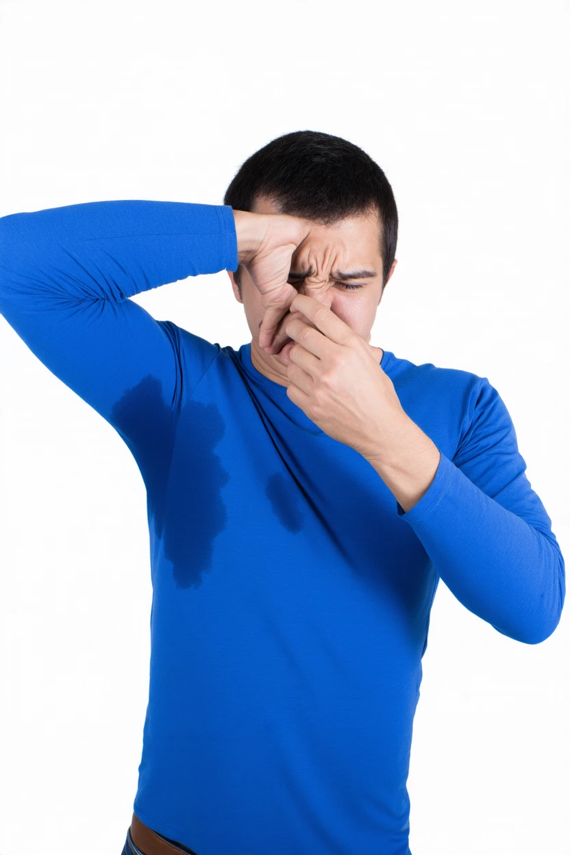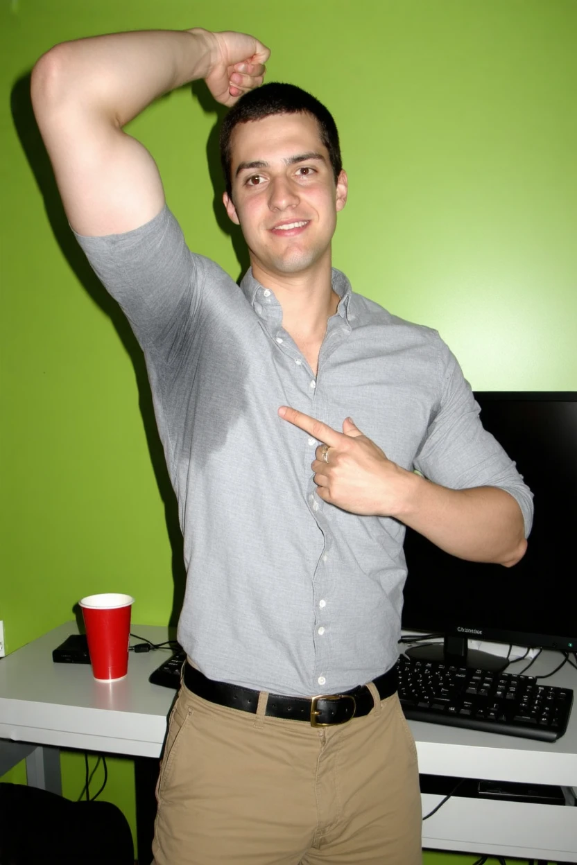 Start the prompt with "large sweat-spots-smudges on shirt armpit area."