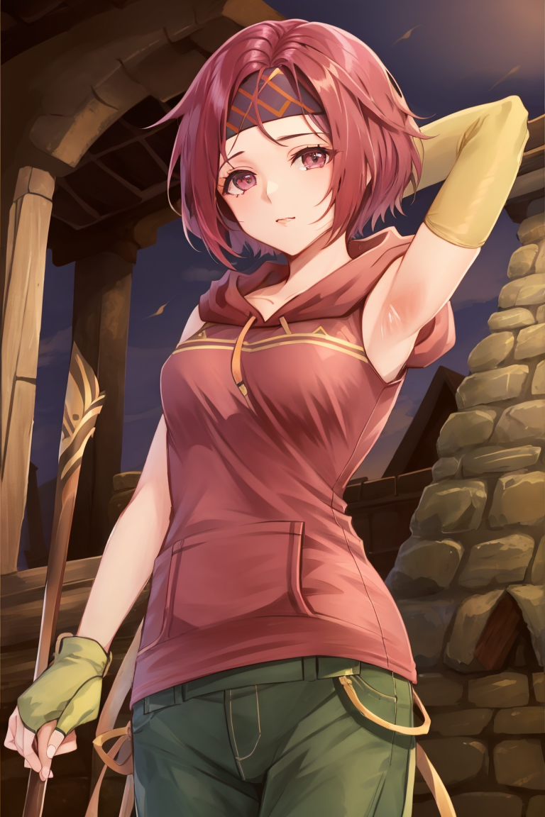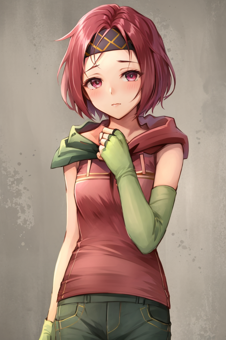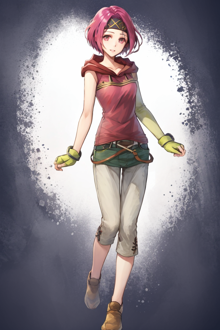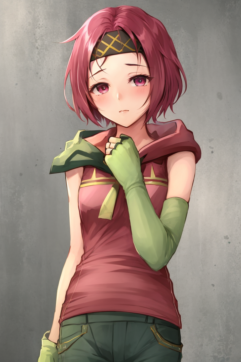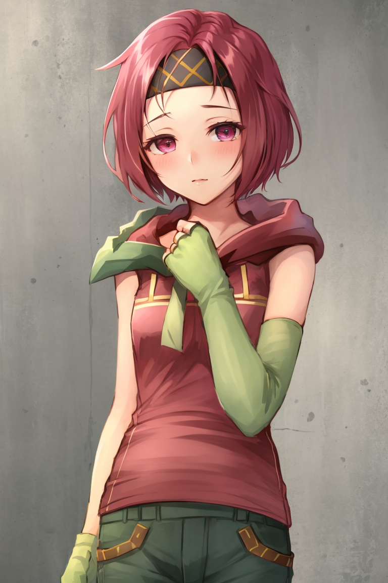 Prompt for default look: neimi fe, short hair, gloves, elbow gloves, pants, hood, fingerless gloves, headband, asymmetrical clothes, asymmetrical gloves.
