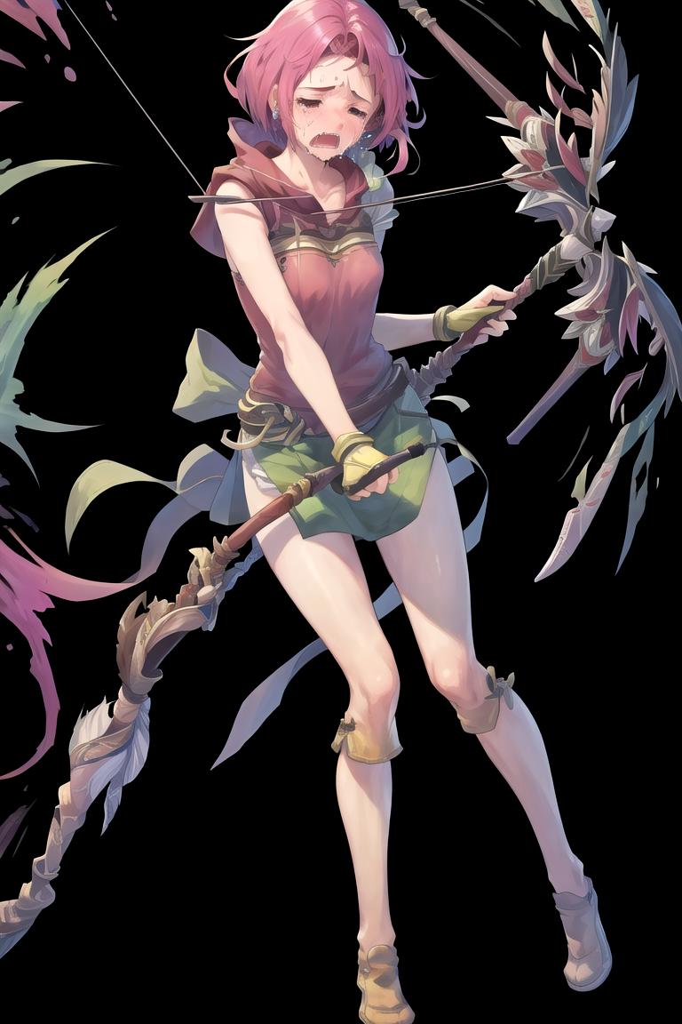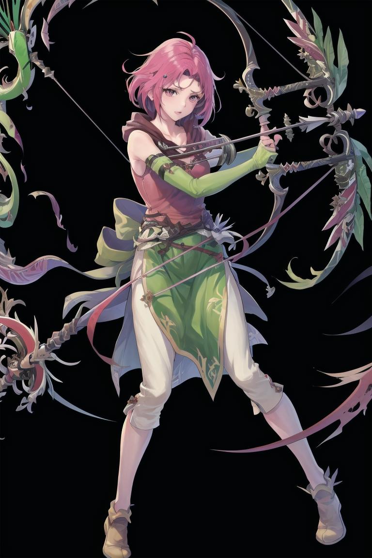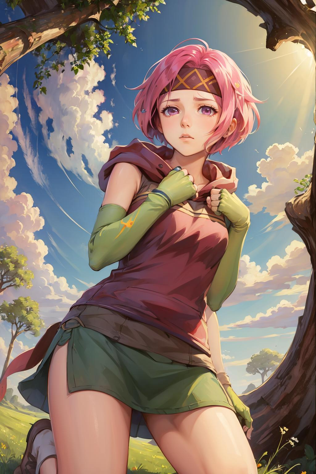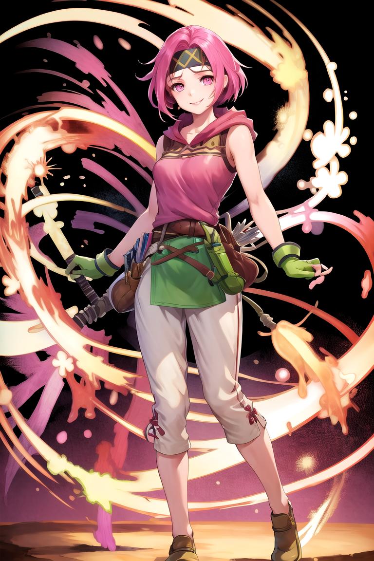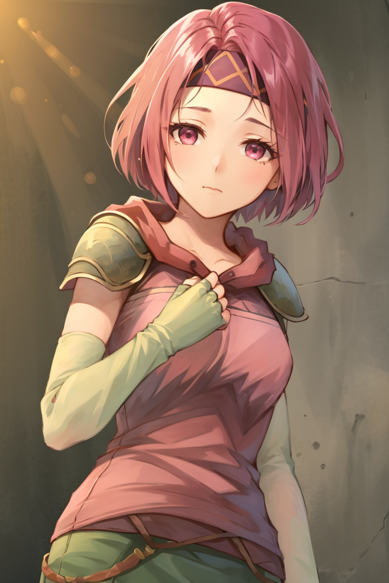 Prompt for default look: neimi fe, short hair, gloves, elbow gloves, pants, hood, fingerless gloves, headband, asymmetrical clothes, asymmetrical gloves.