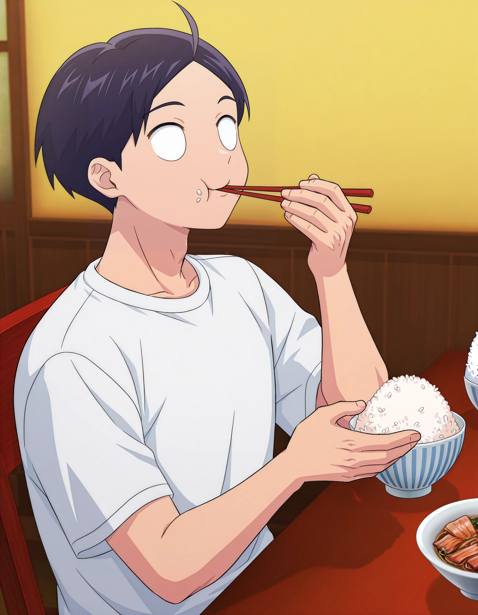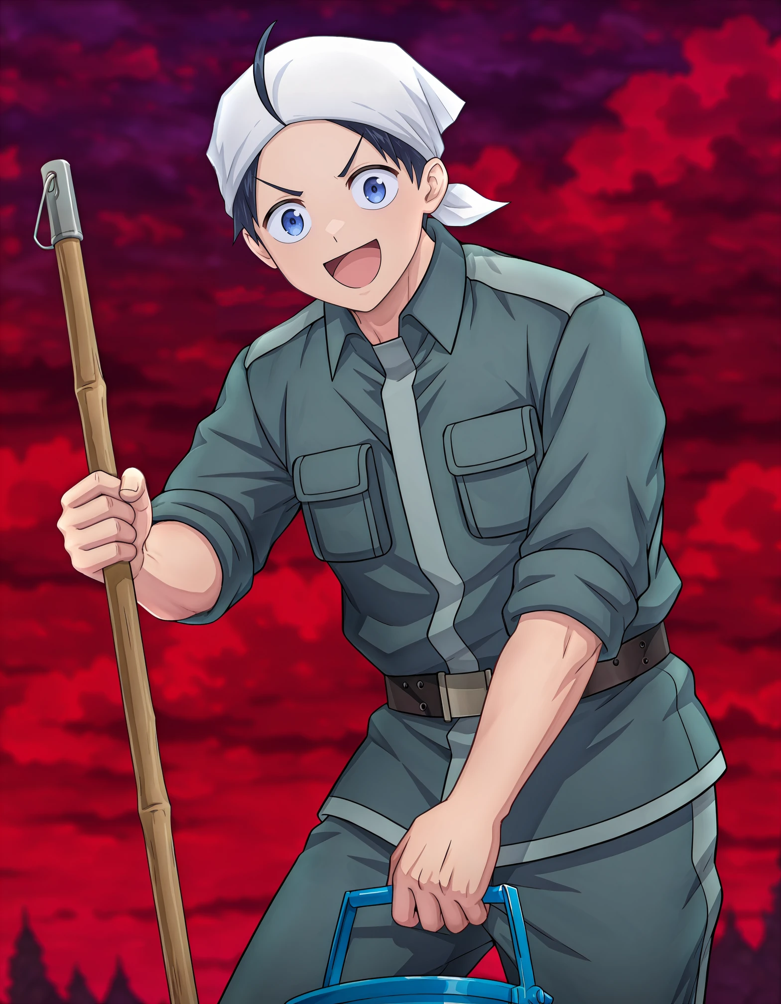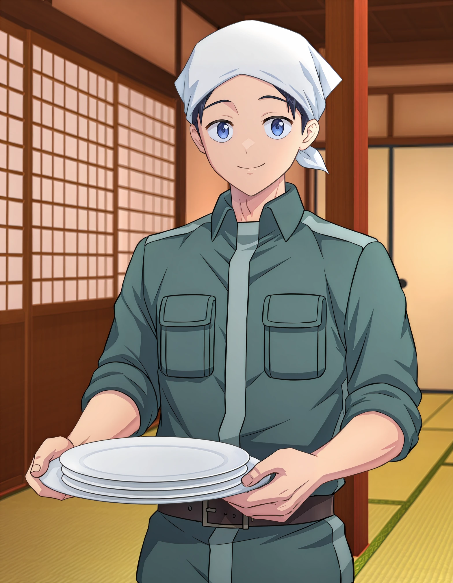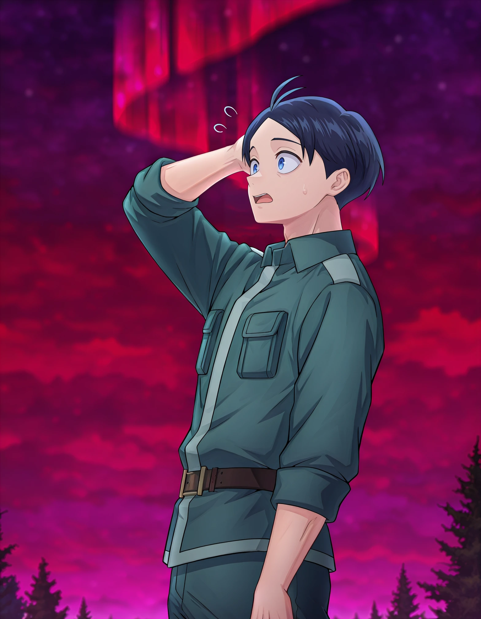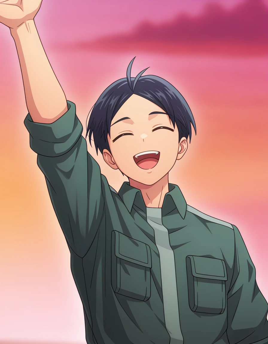 ykwkrds, blue eyes, black hair, parted bangs, ahoge, short hair, collared jacket, uniform, green jacket, pocket,