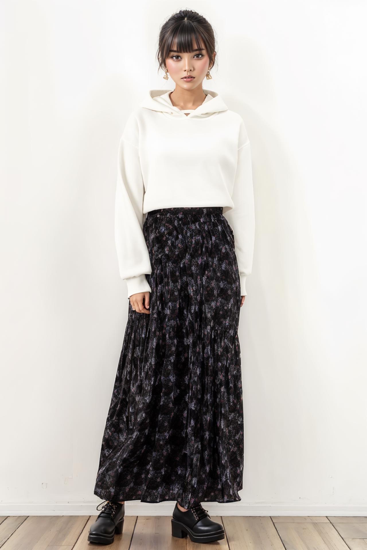 Check out this lovely long skirt with Japanese flowers all over it. I made this LORA model to show off many pretty styles. Comfy and pretty, it's like a walk in a flower garden!