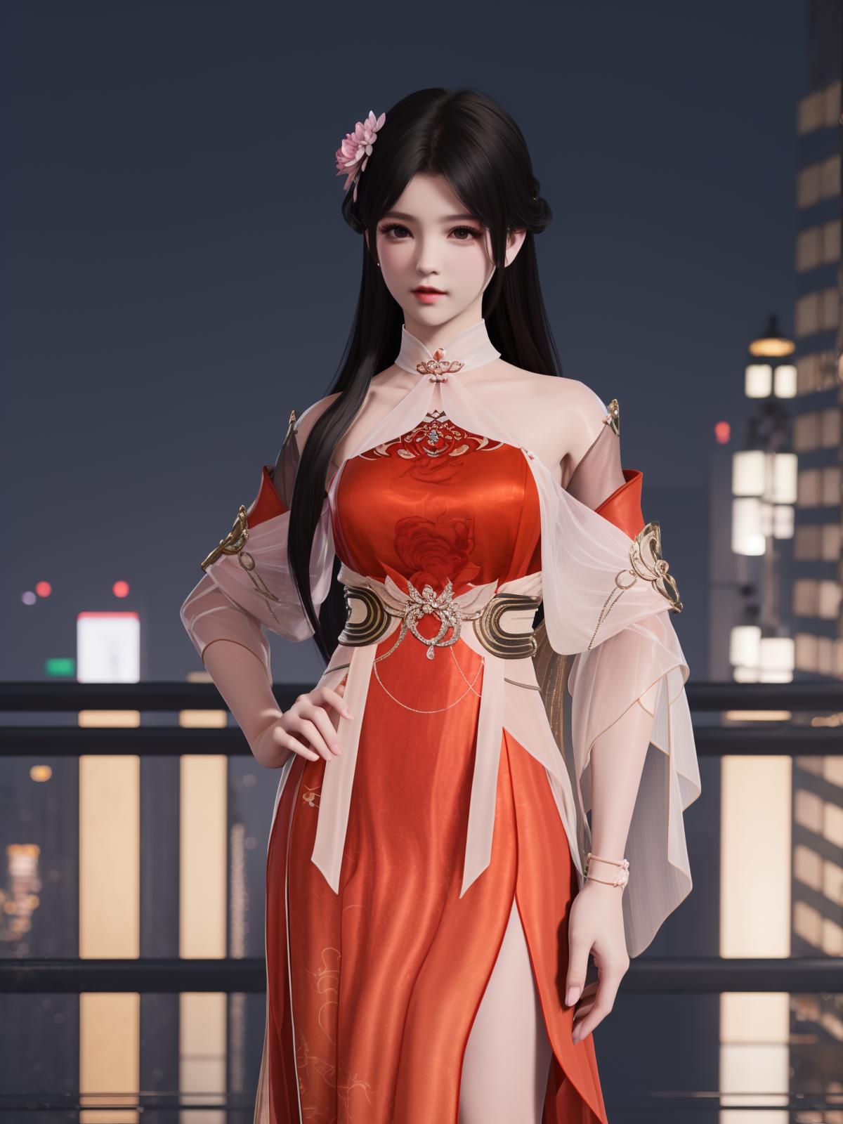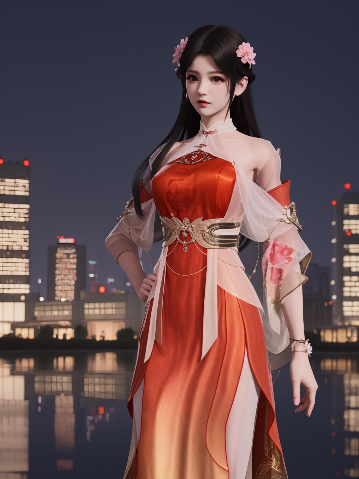 YJWJyingzipingXQNYHhuajianying, 1girl, long hair, dress, solo, black hair,jewelry, bare shoulders,see-through, obi,detached sleeves, sash,choker,chinese clothes, looking at viewer, cityscape, night, mature female, hair flower,hand on hip,