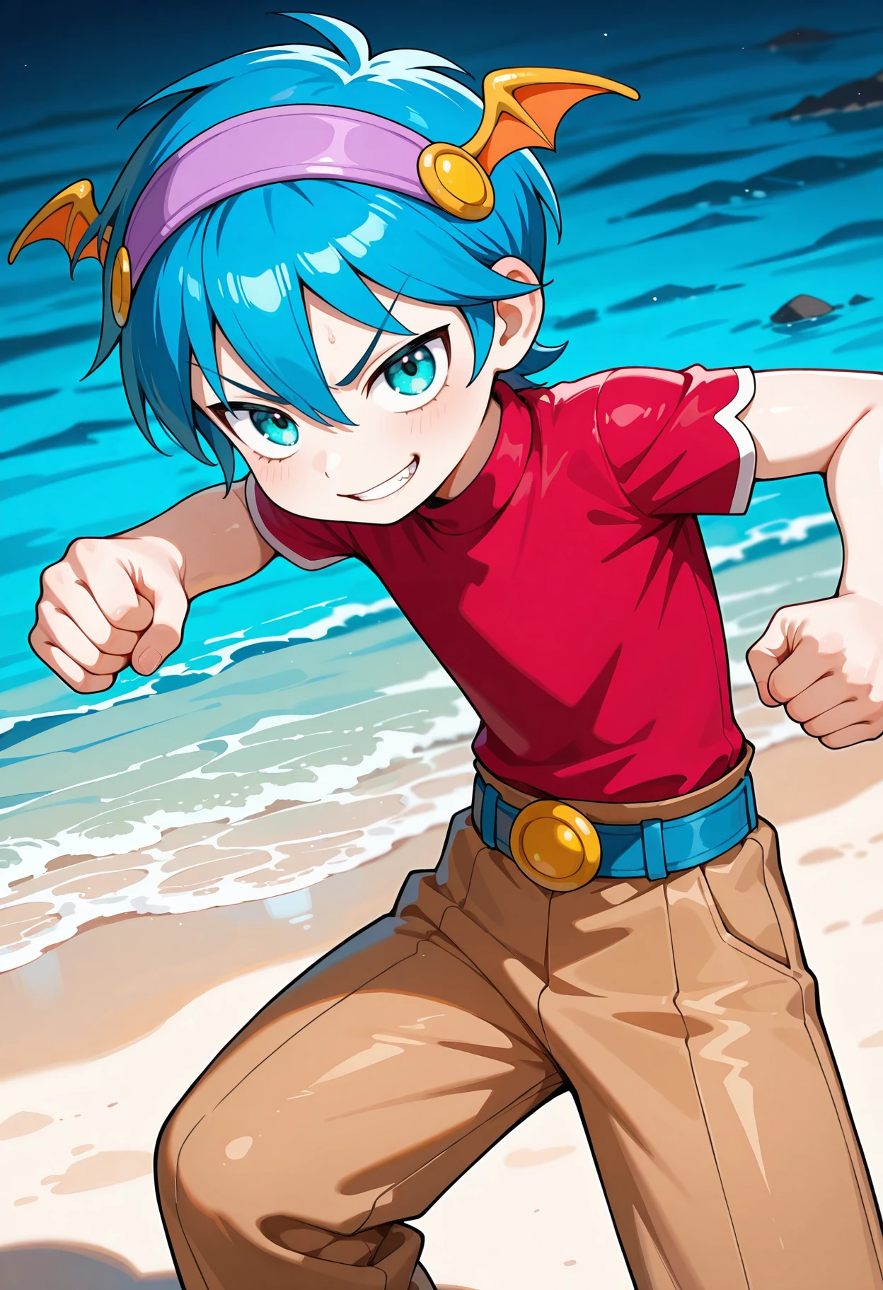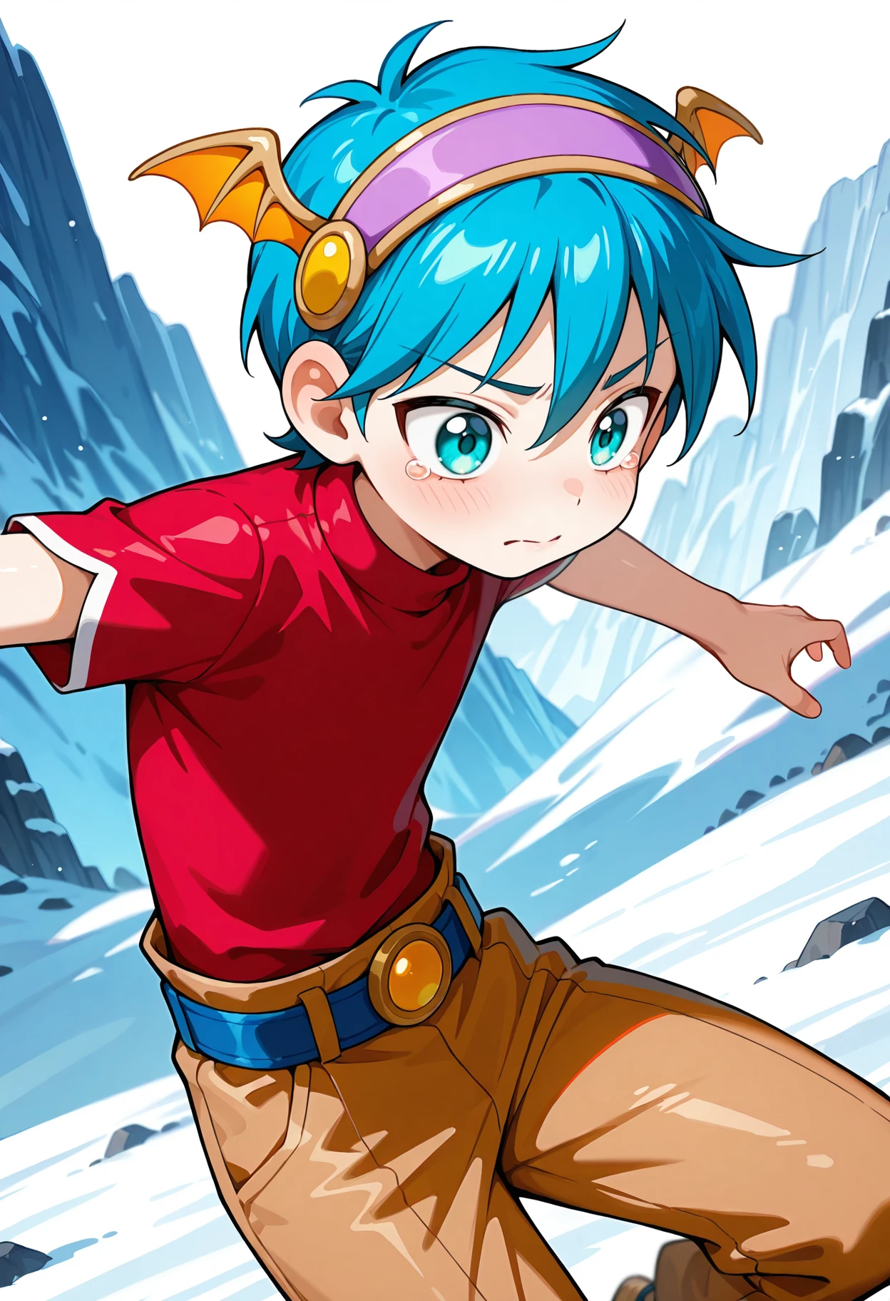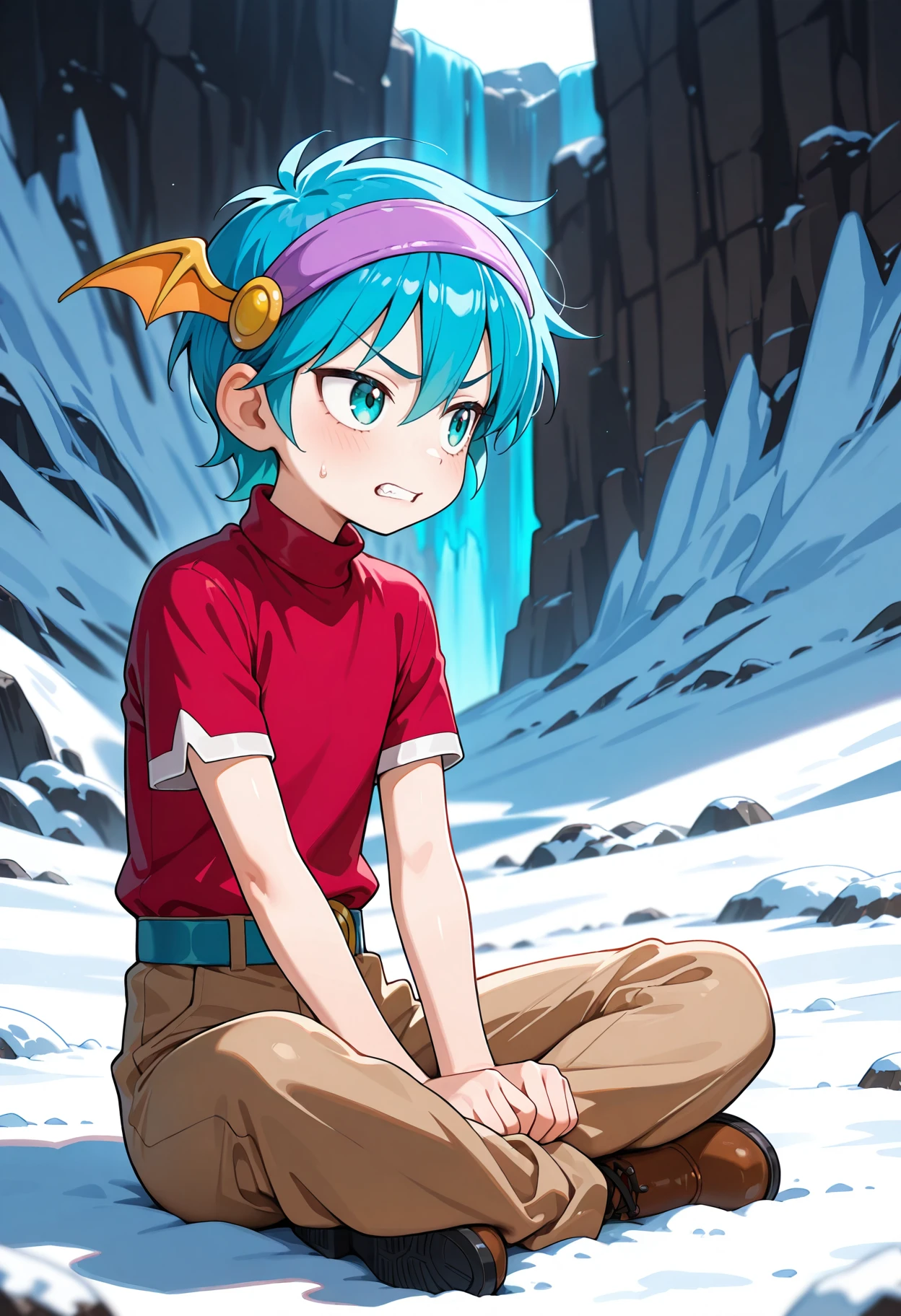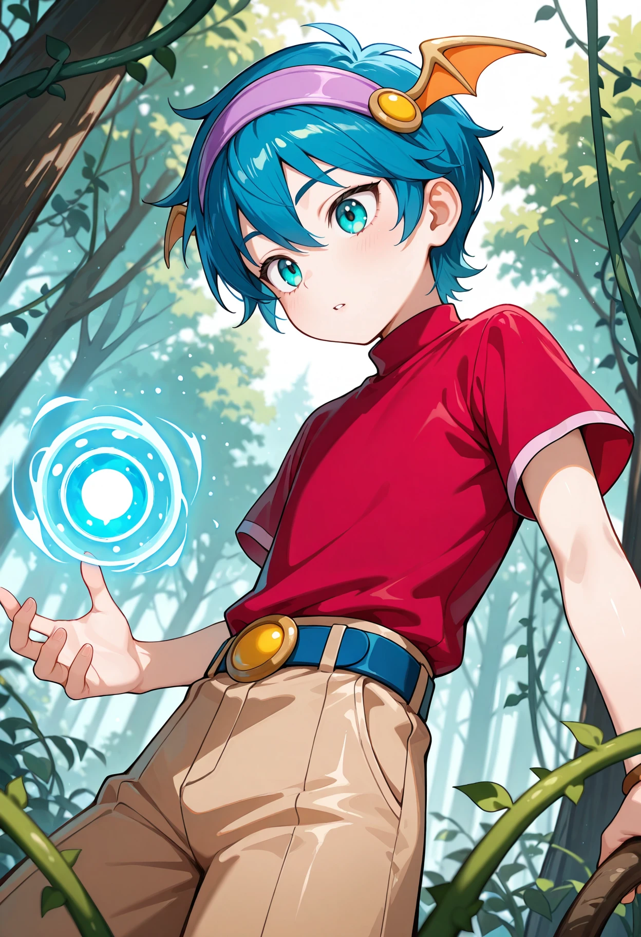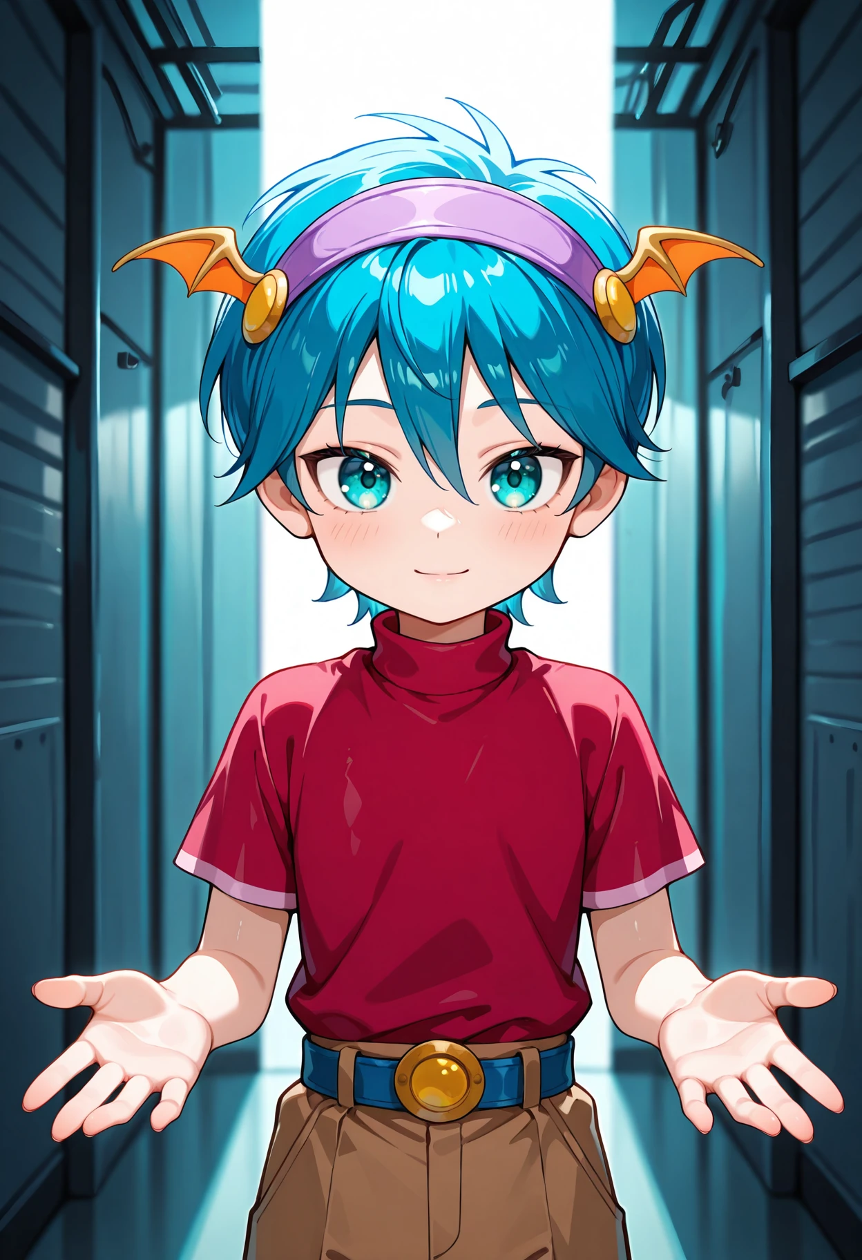 short hair, purple hairband, head wings, turtleneck, red and purple shirt, short sleeves, blue belt, brown pants