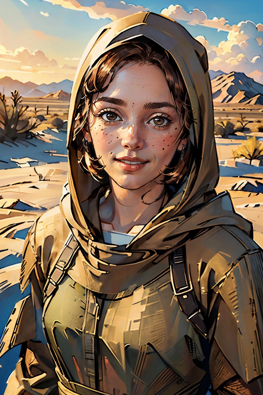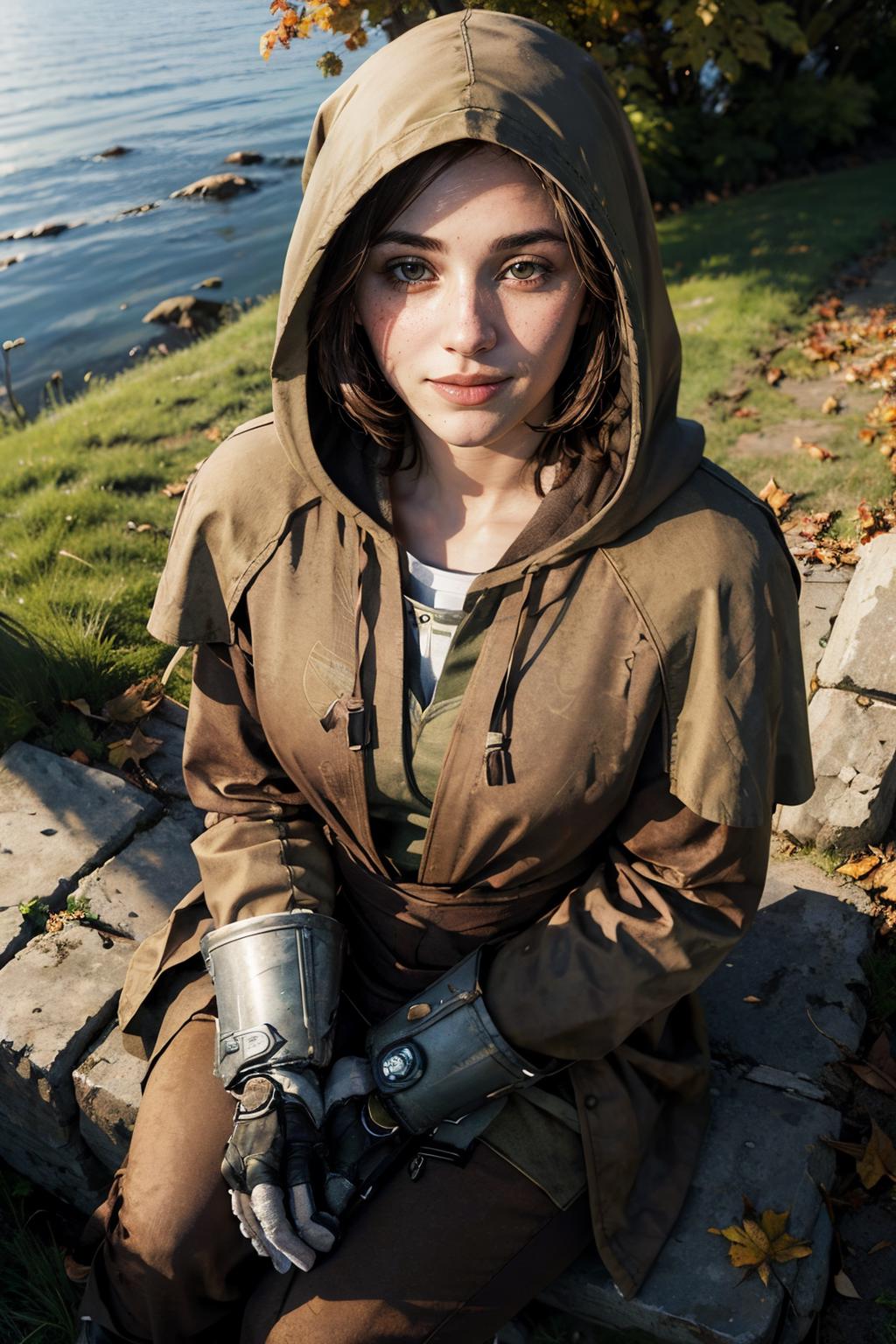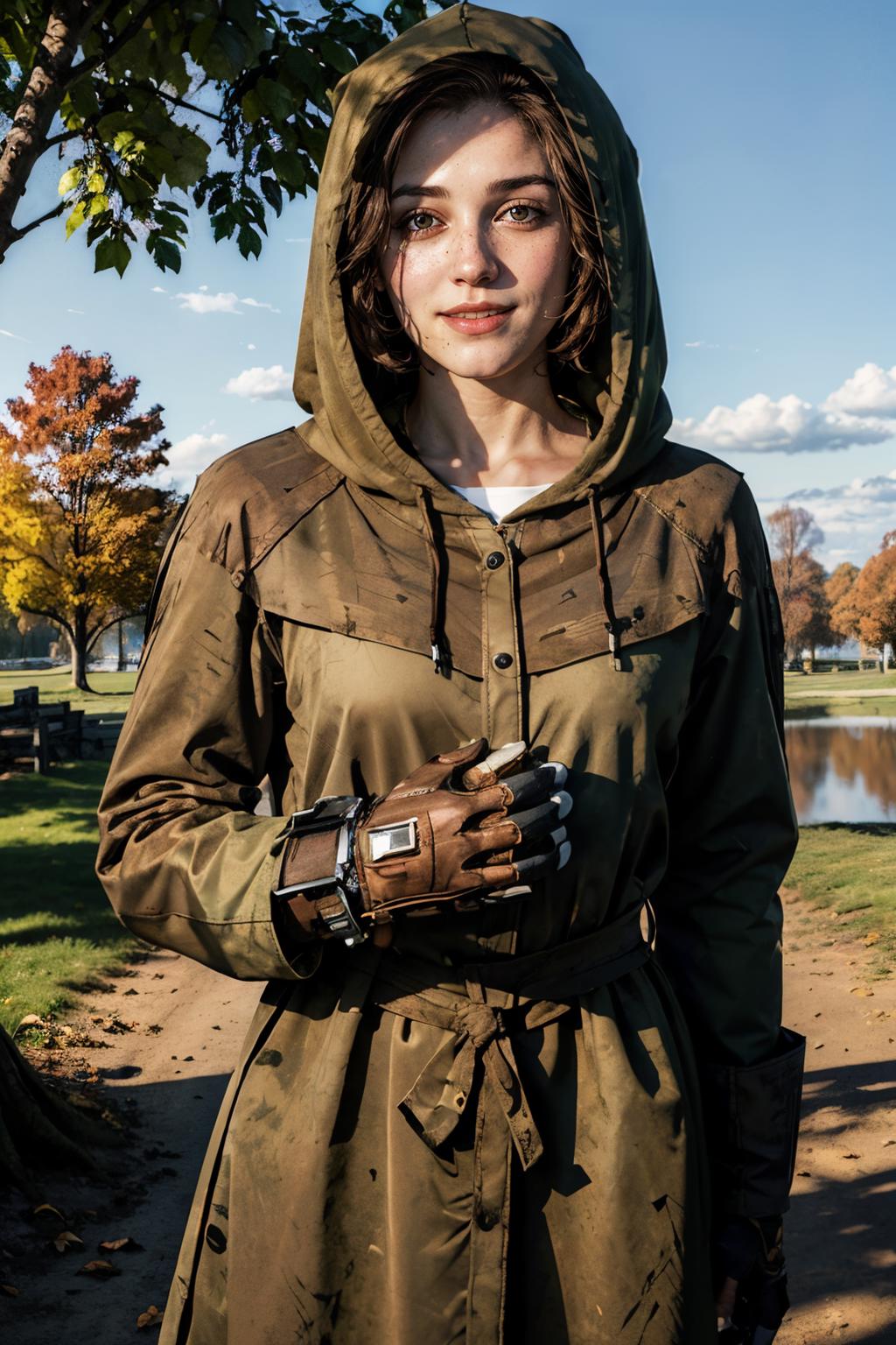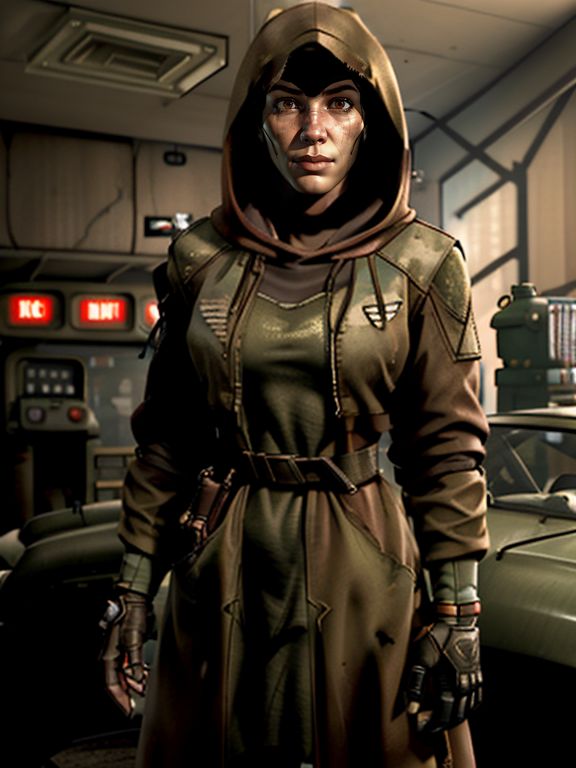 Veronica Santangelo from Fallout New Vegas. Trigger is "VeronicaFNV", fairly high weight recommended. "Hooded cloak,brown clothes,gauntlets,one glove" recommended for her default in-game outfit (although as always, getting SD to model the power fist reliably is a tall order).