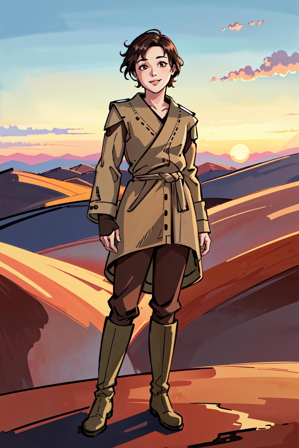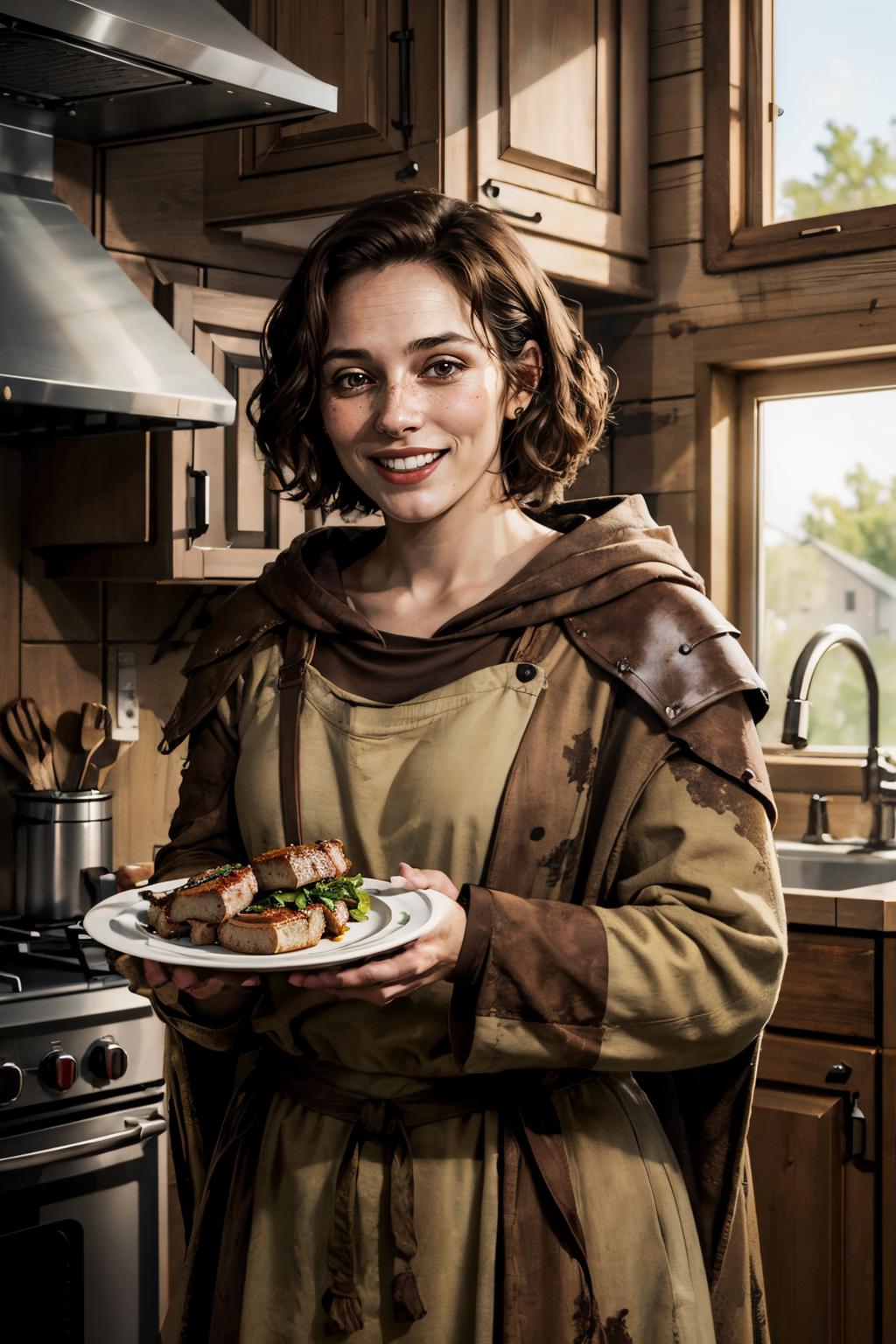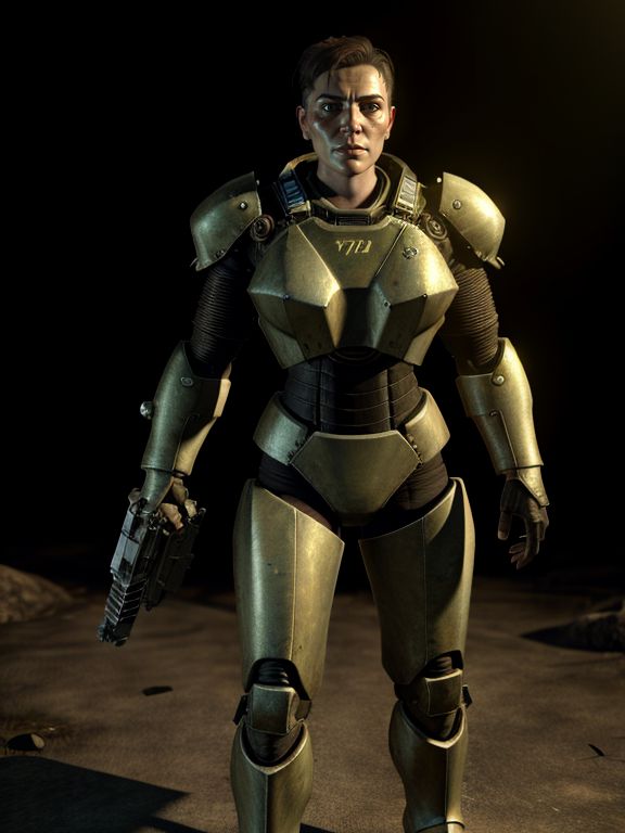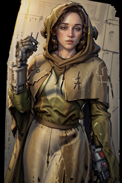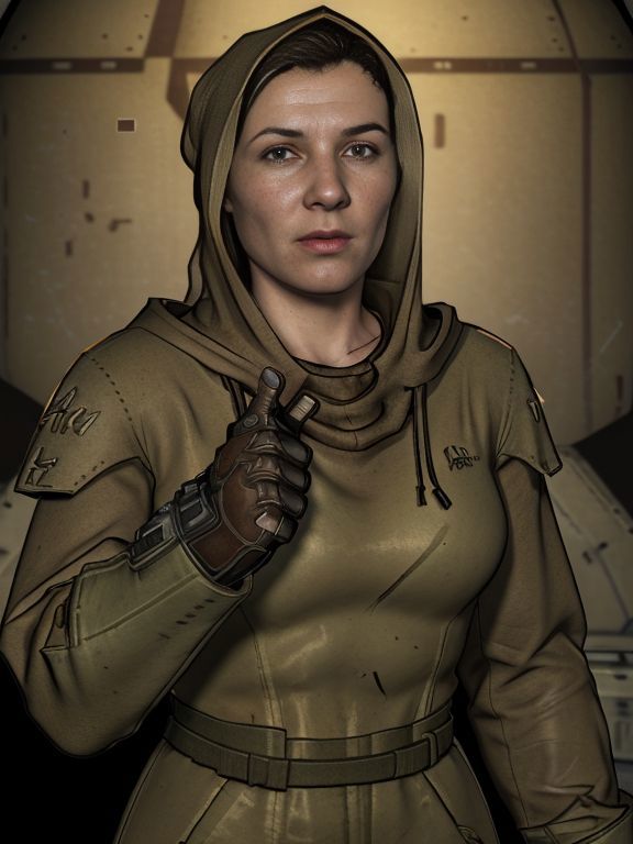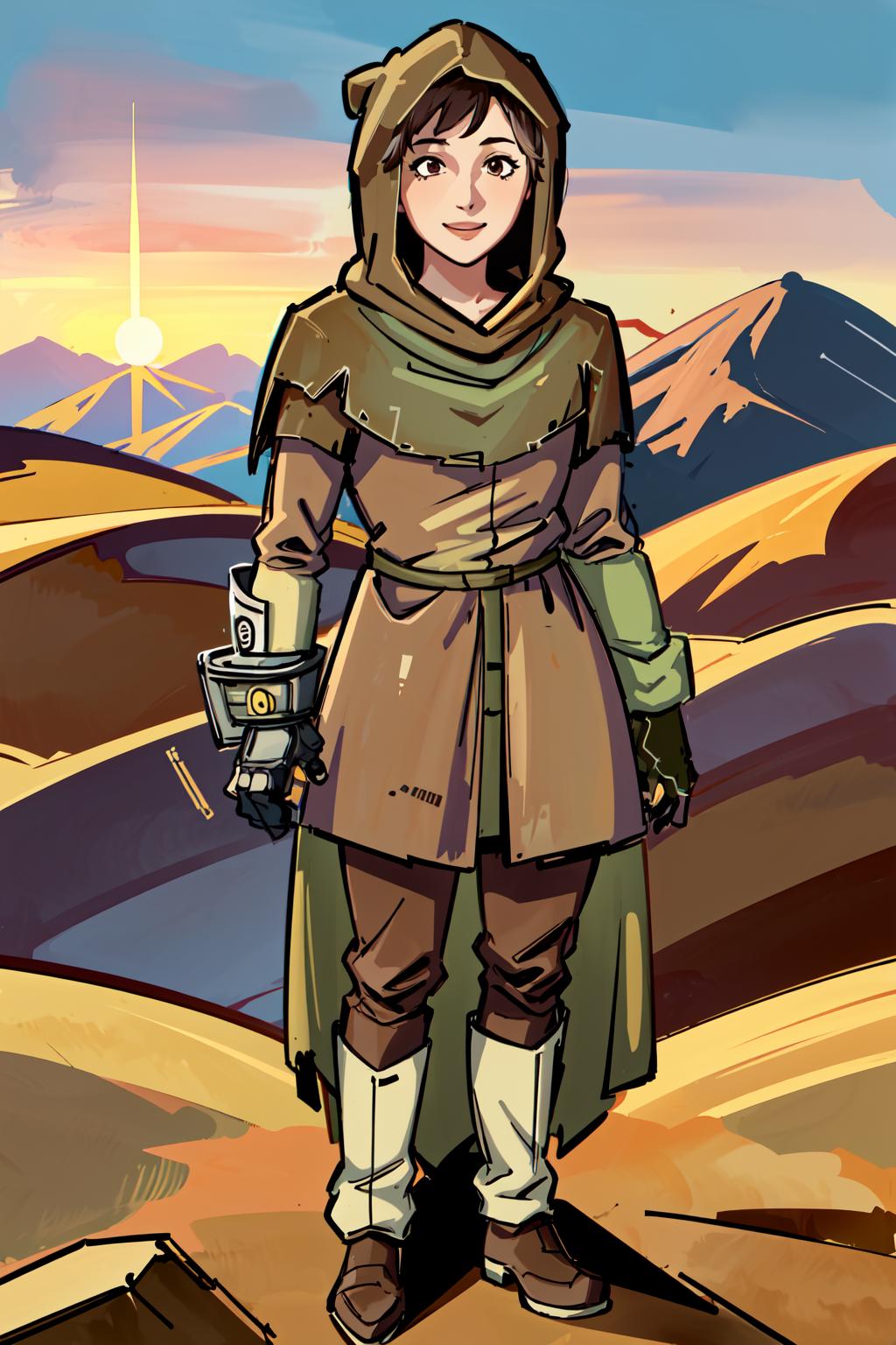 Veronica Santangelo from Fallout New Vegas. Trigger is "VeronicaFNV", fairly high weight recommended. "Hooded cloak,brown clothes,gauntlets,one glove" recommended for her default in-game outfit (although as always, getting SD to model the power fist reliably is a tall order).