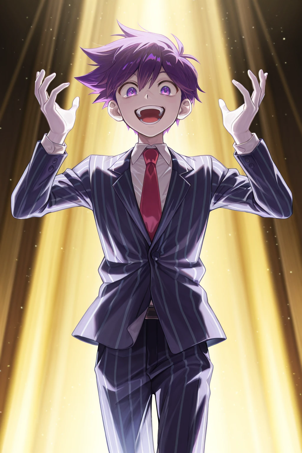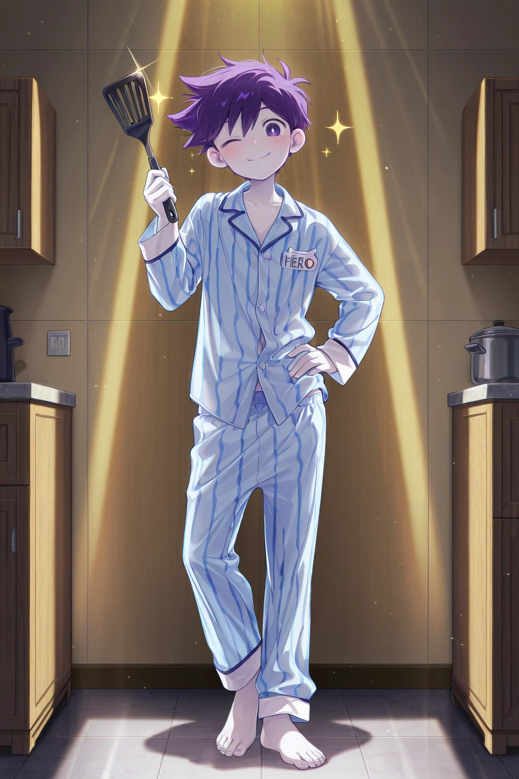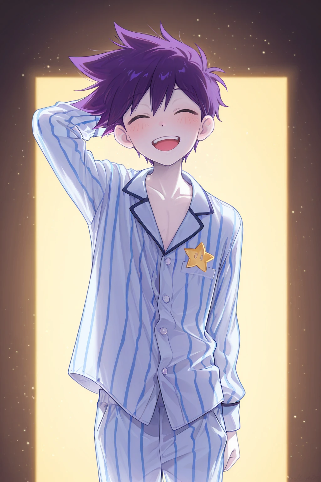 -hero_sp, purple hair, purple eyes, white pupils, white skin, blue striped pajamas