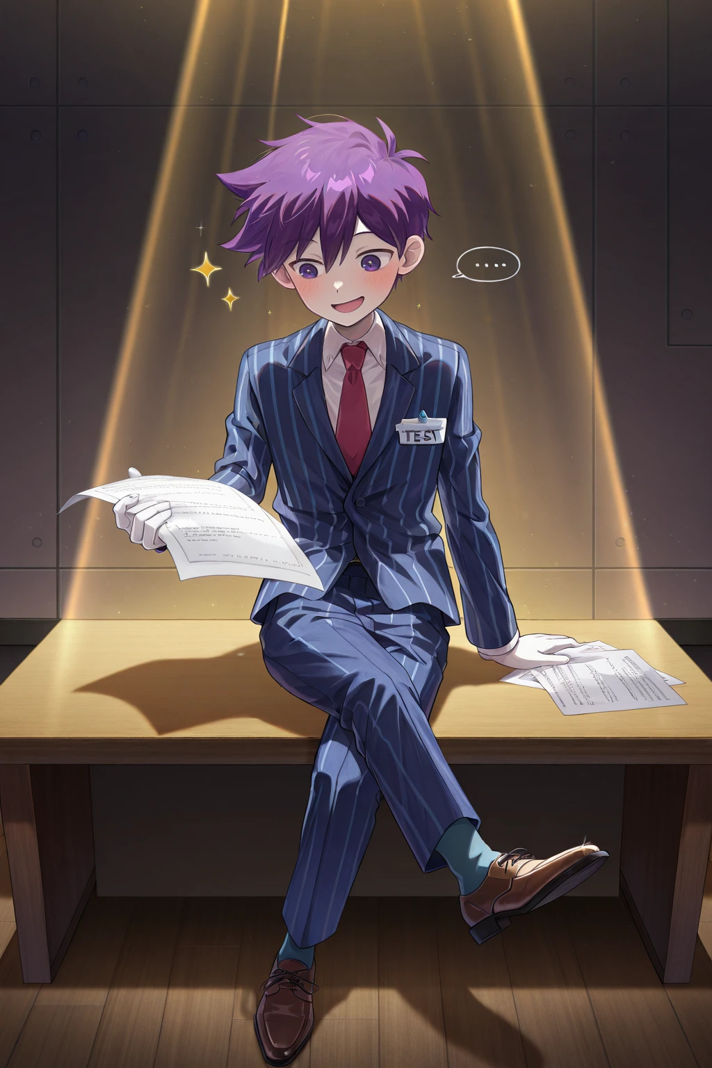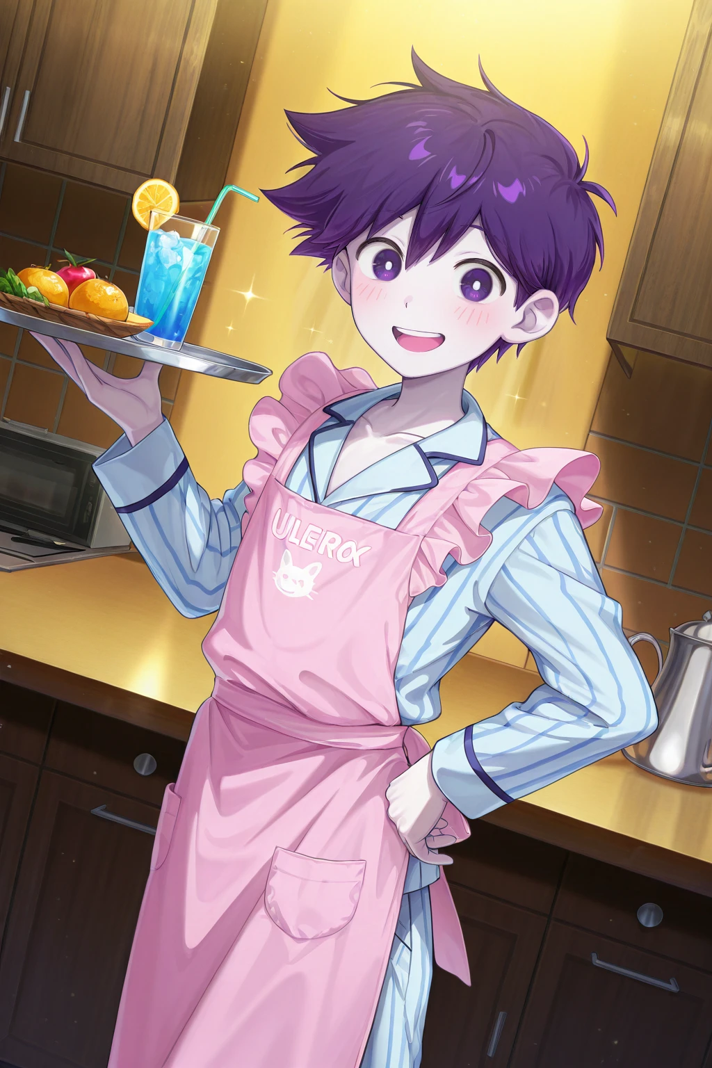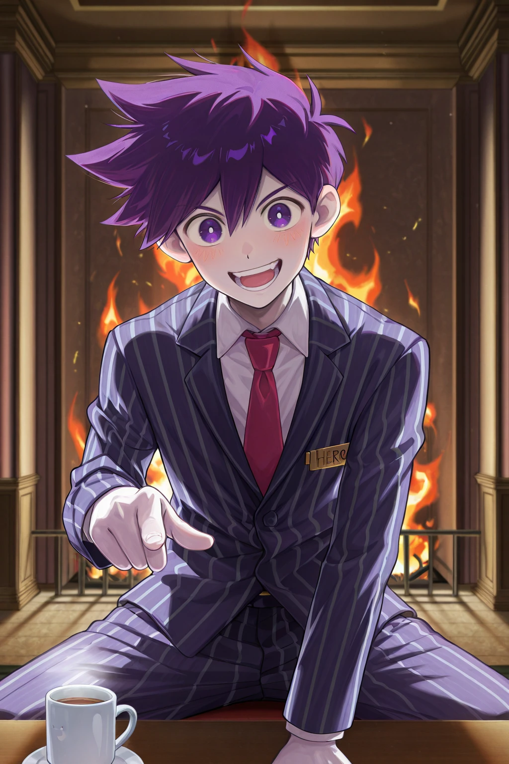 -hero_sp, purple hair, purple eyes, white pupils, white skin, blue striped pajamas