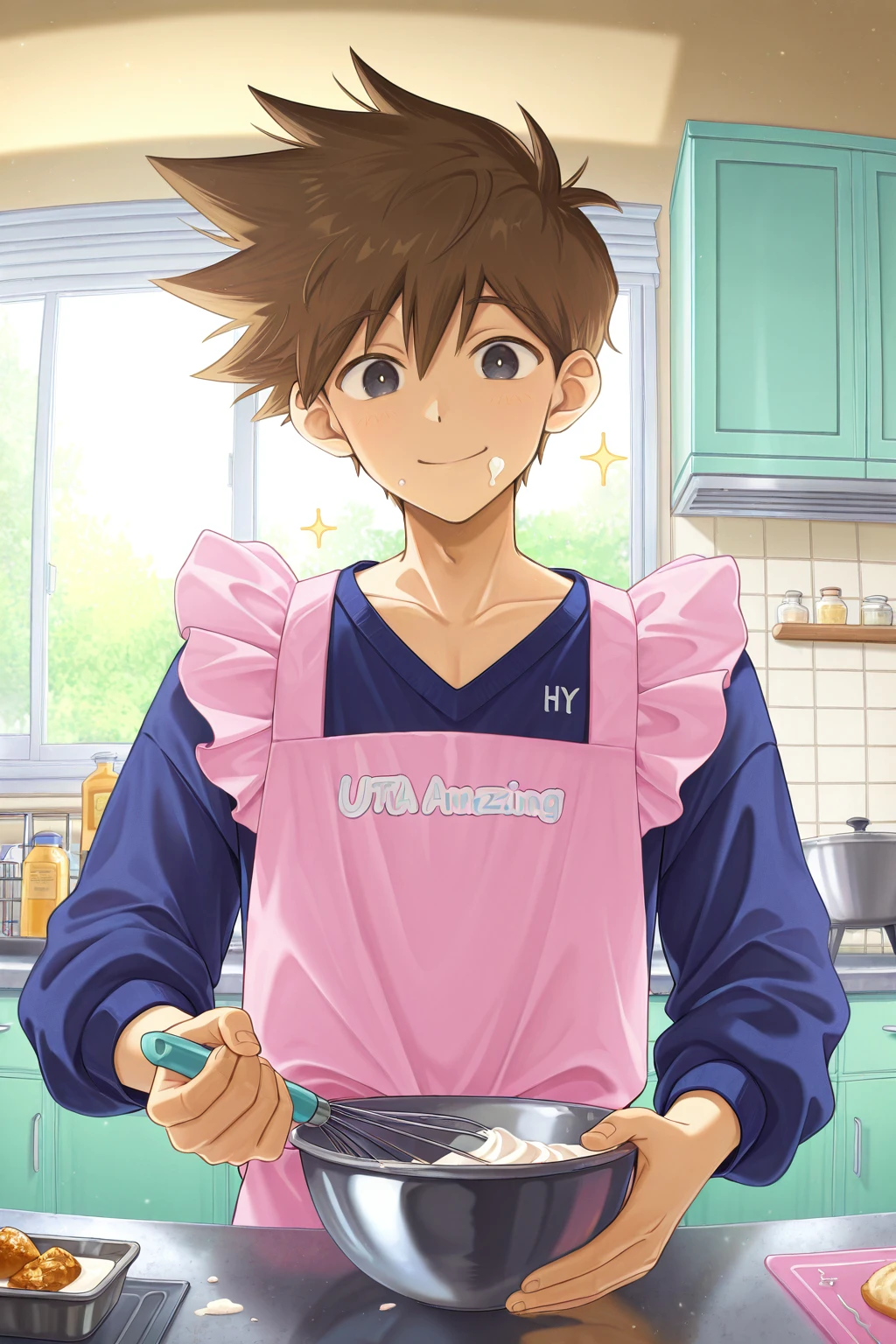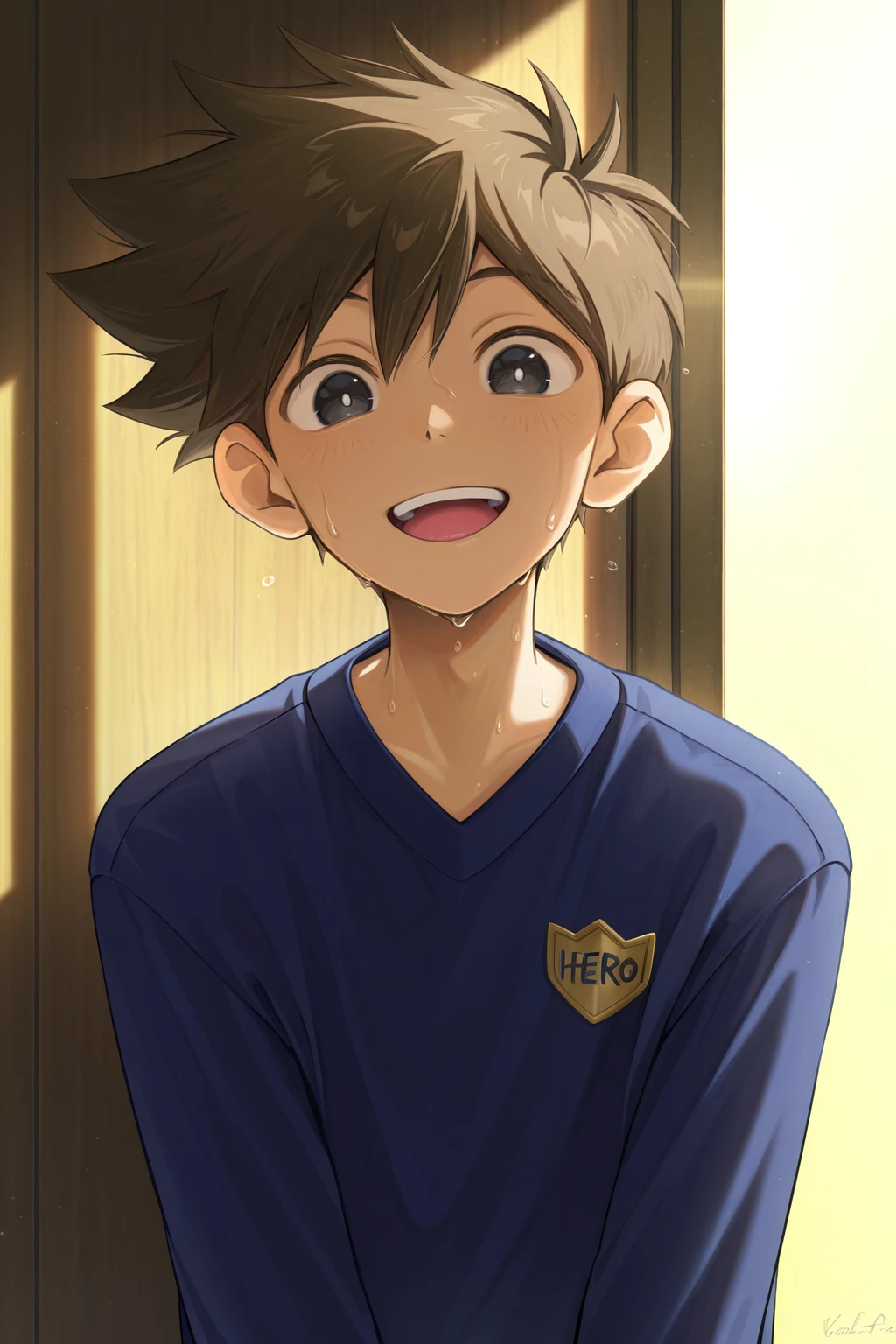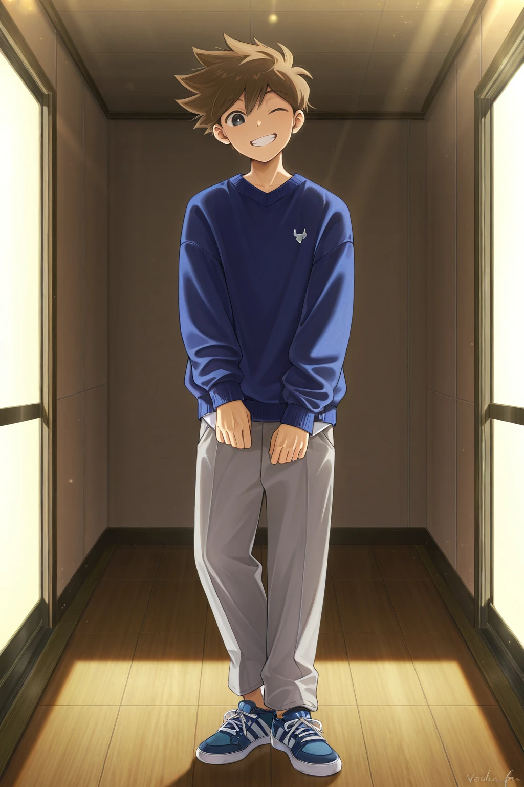 -hero_fa, brown hair, black eyes, white pupils, blue sweater, grey pants