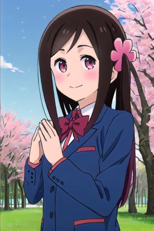 Prompts to be used: hitoribocchi no marumaru seikatsu anime lineart, bocchi hitori, long hair, dark brown hair, bangs, one side up, hair flower, pink eyes, blue blazer, long sleeves, white colar, red bowtie, long grey pleated skirt, black socks, white and red uwabaki