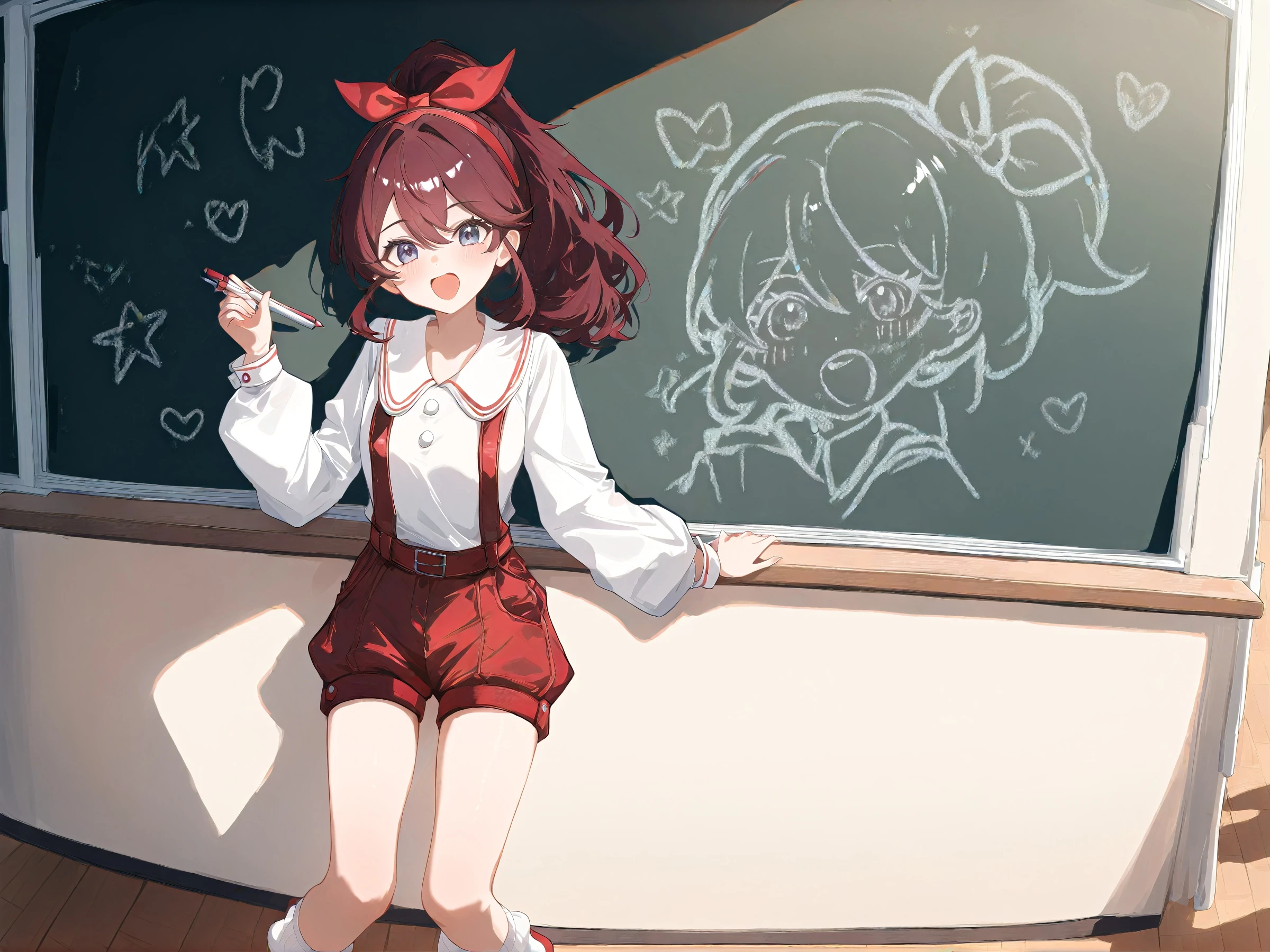 1 girl, solo, full body, Ruirui, (hair red bowknot:1.2), dark maroon hair, medium hair, high ponytail, wide collar, white shirt, white long sleeves, (red overall:0.7), minipants, long kneesocks, bubble socks, brown shoes, standing on one foot, classroom, masterpiece, high score, great score, absurdres, detailed background <lora:RuiruiXL:1>如果红色蝴蝶结发带变为白色,增加(hair red bowknot:1.2)的权重即可。