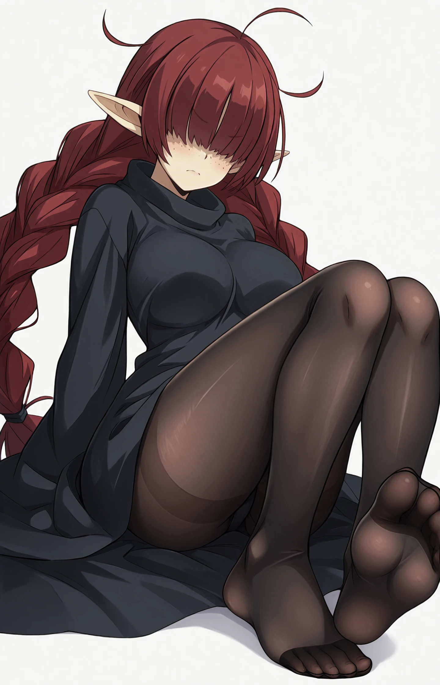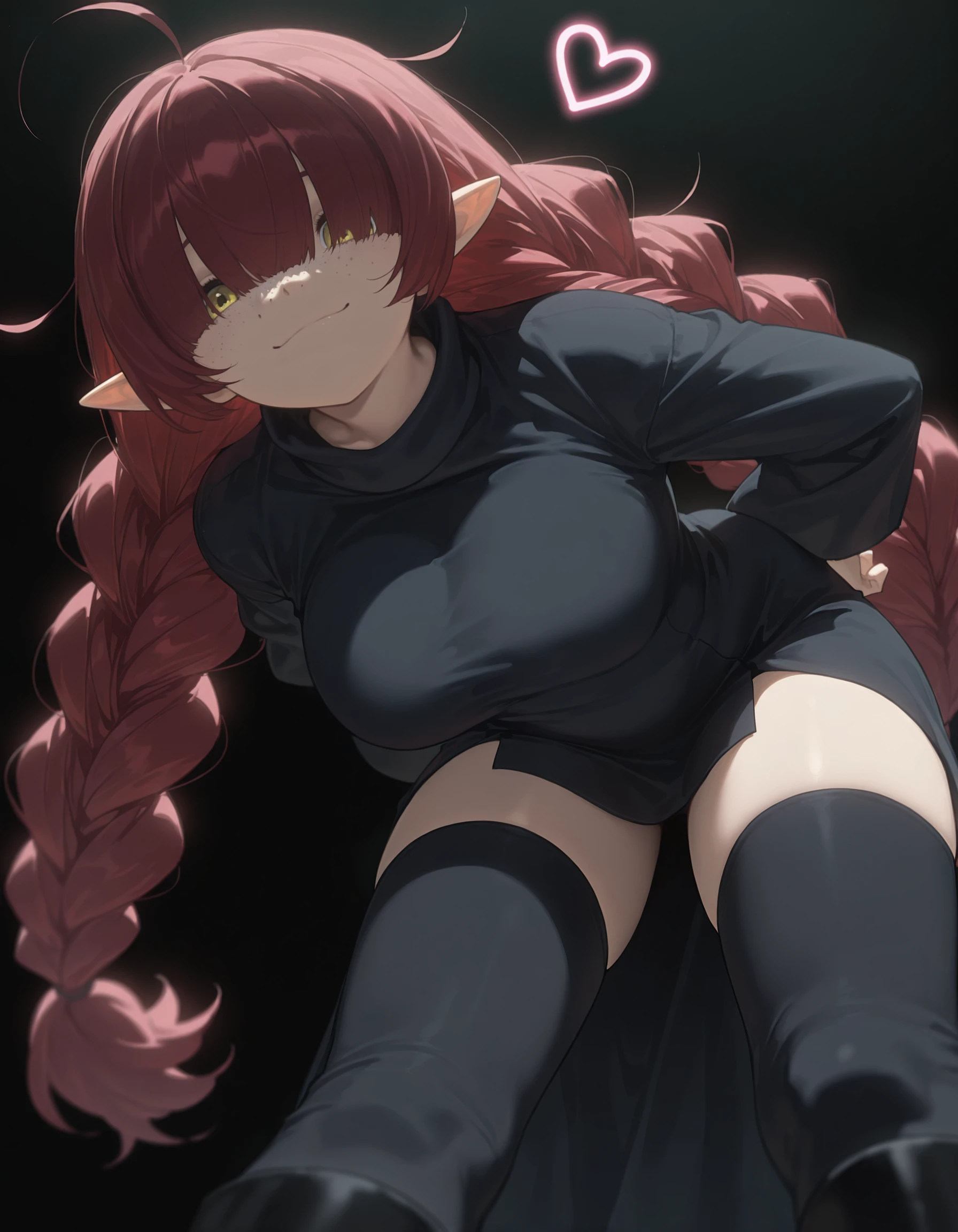 1girl,solo,freckles,pointy ears,red hair,hair over eyes,ahoge,twin braids,braids,long hair,dress,boots,black footware,black dress,braid,breasts,large breasts,black pants